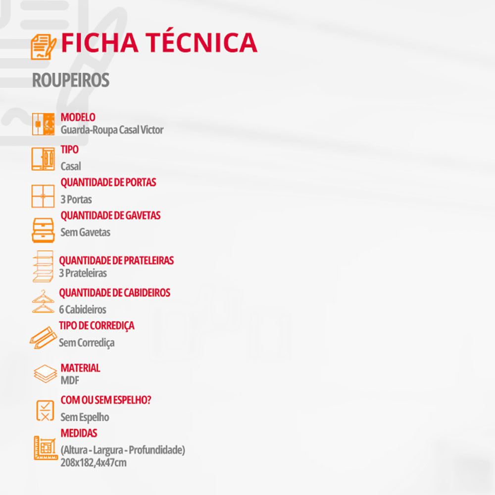 Guarda Roupa Casal Vitor em MDF com 3 Portas e 6 Cabideiros Moderna