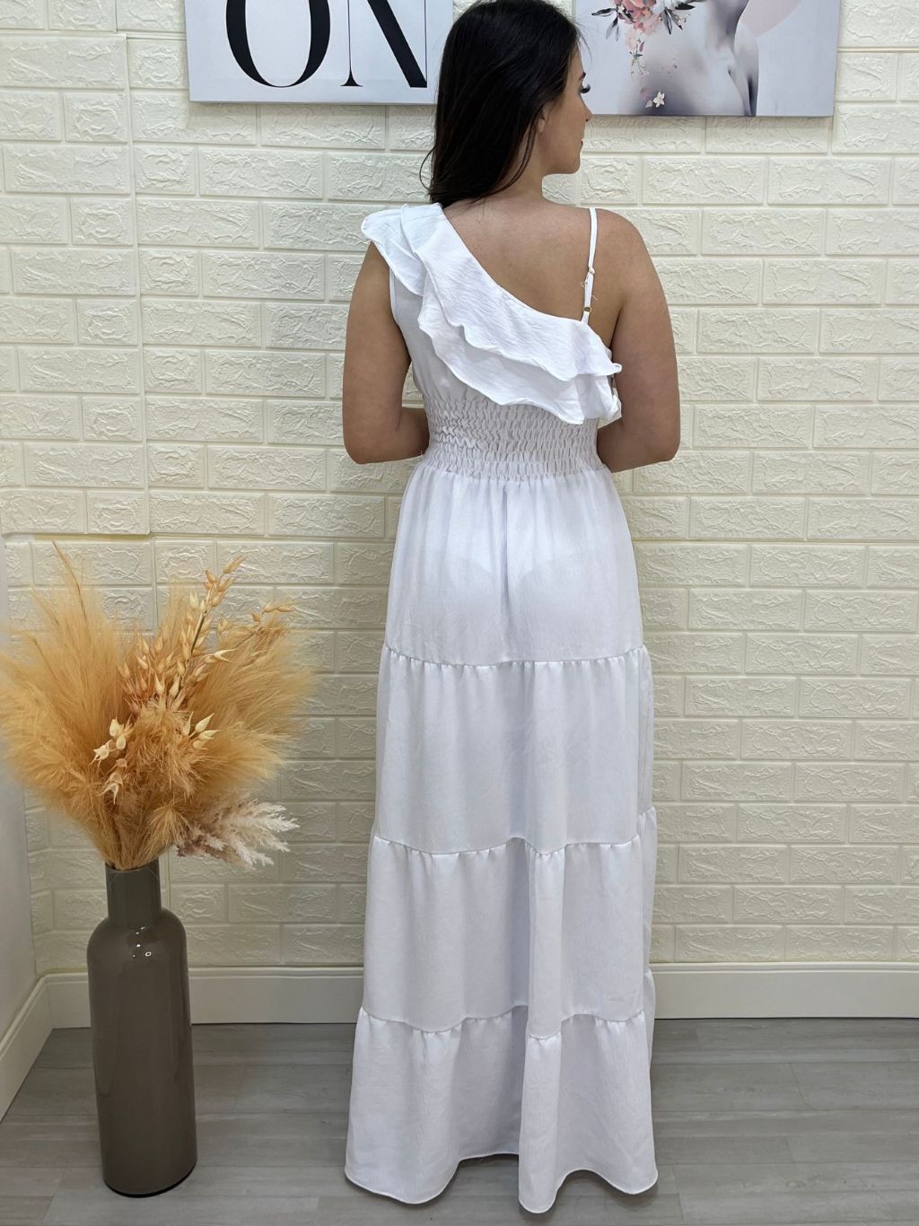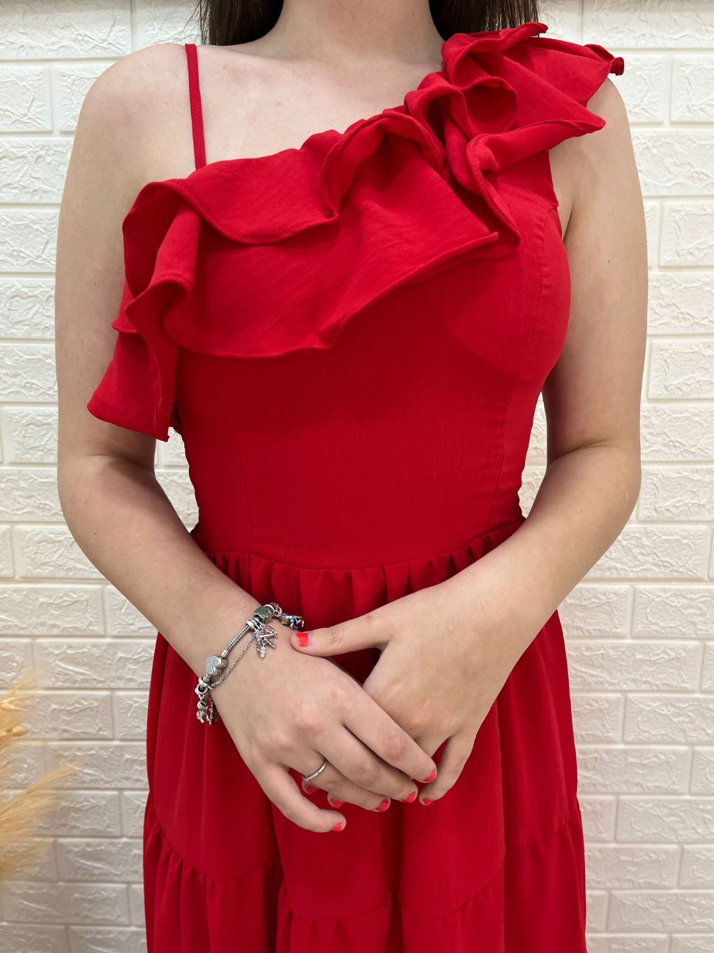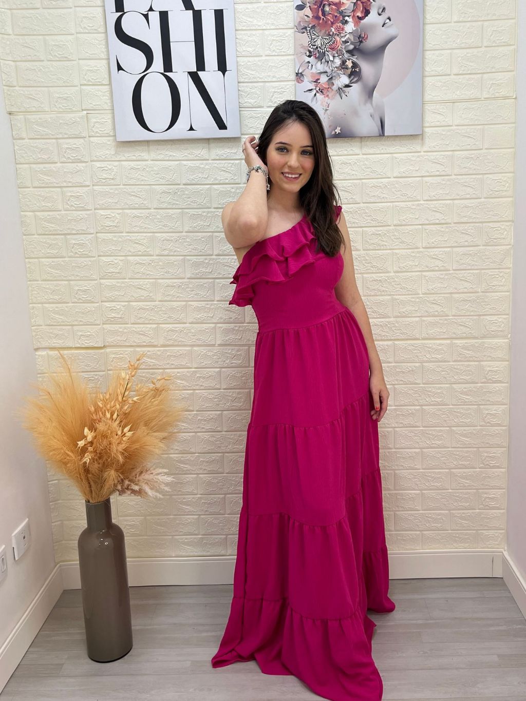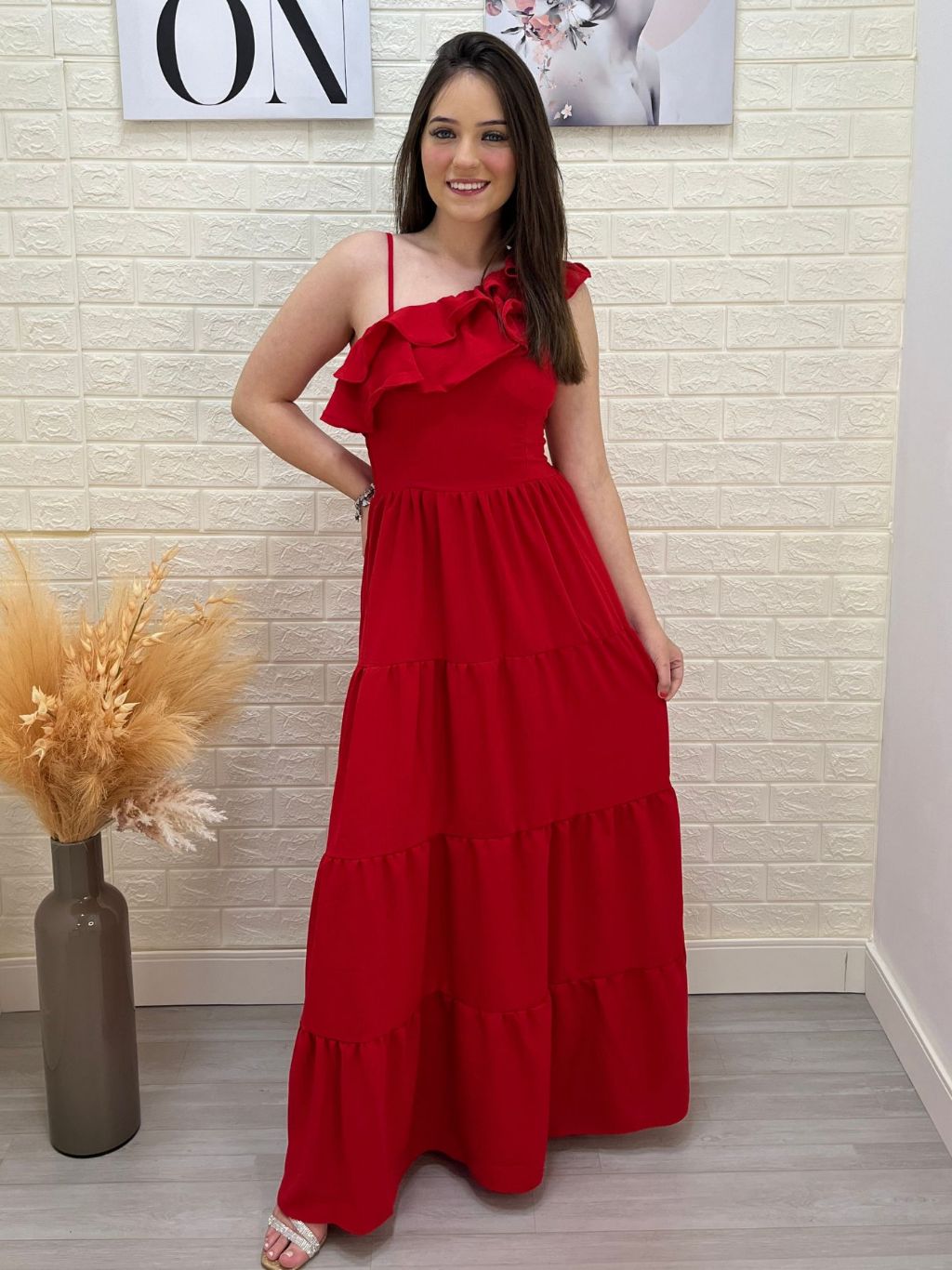 Vestido Longo Rodado Elegante Com Babado Alça Regulável Com Forro e Bojo Tecido Duna Que Não Amassa