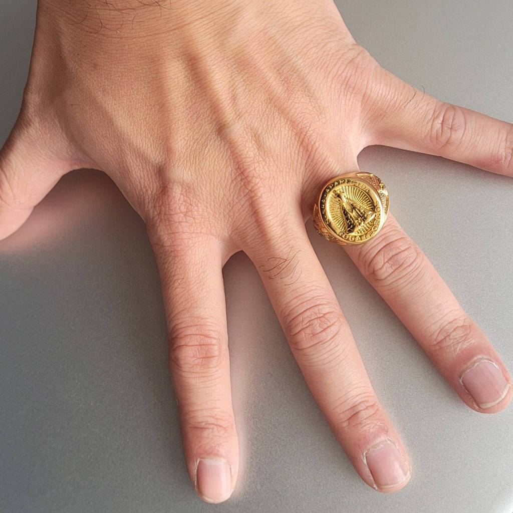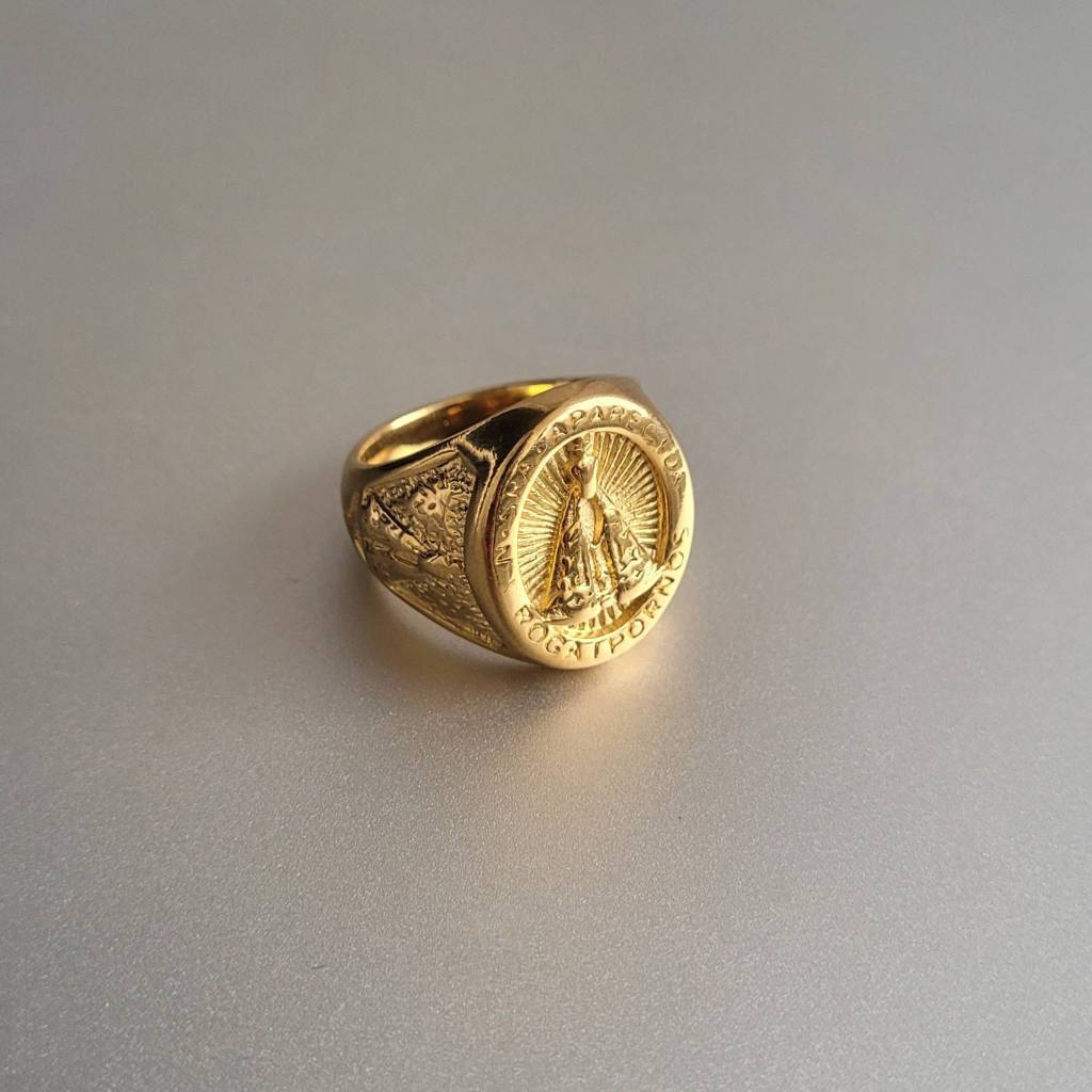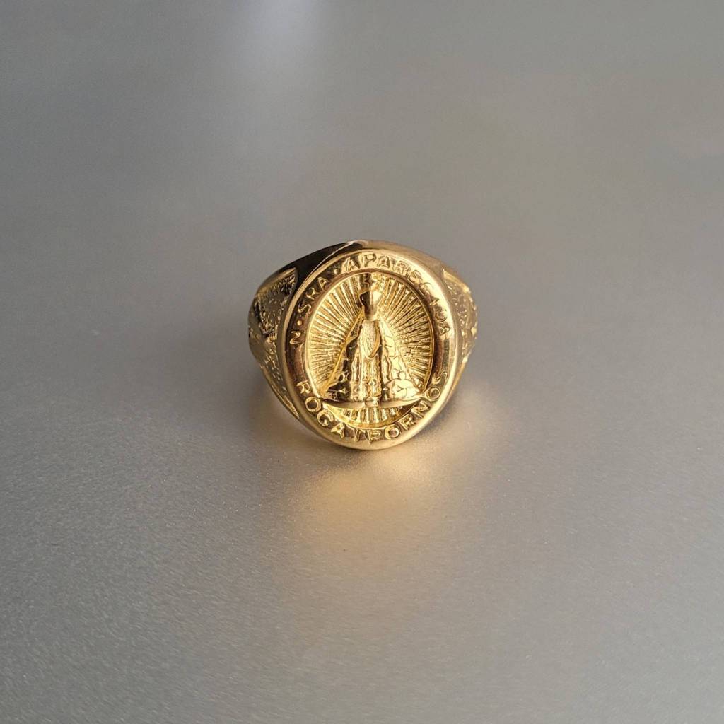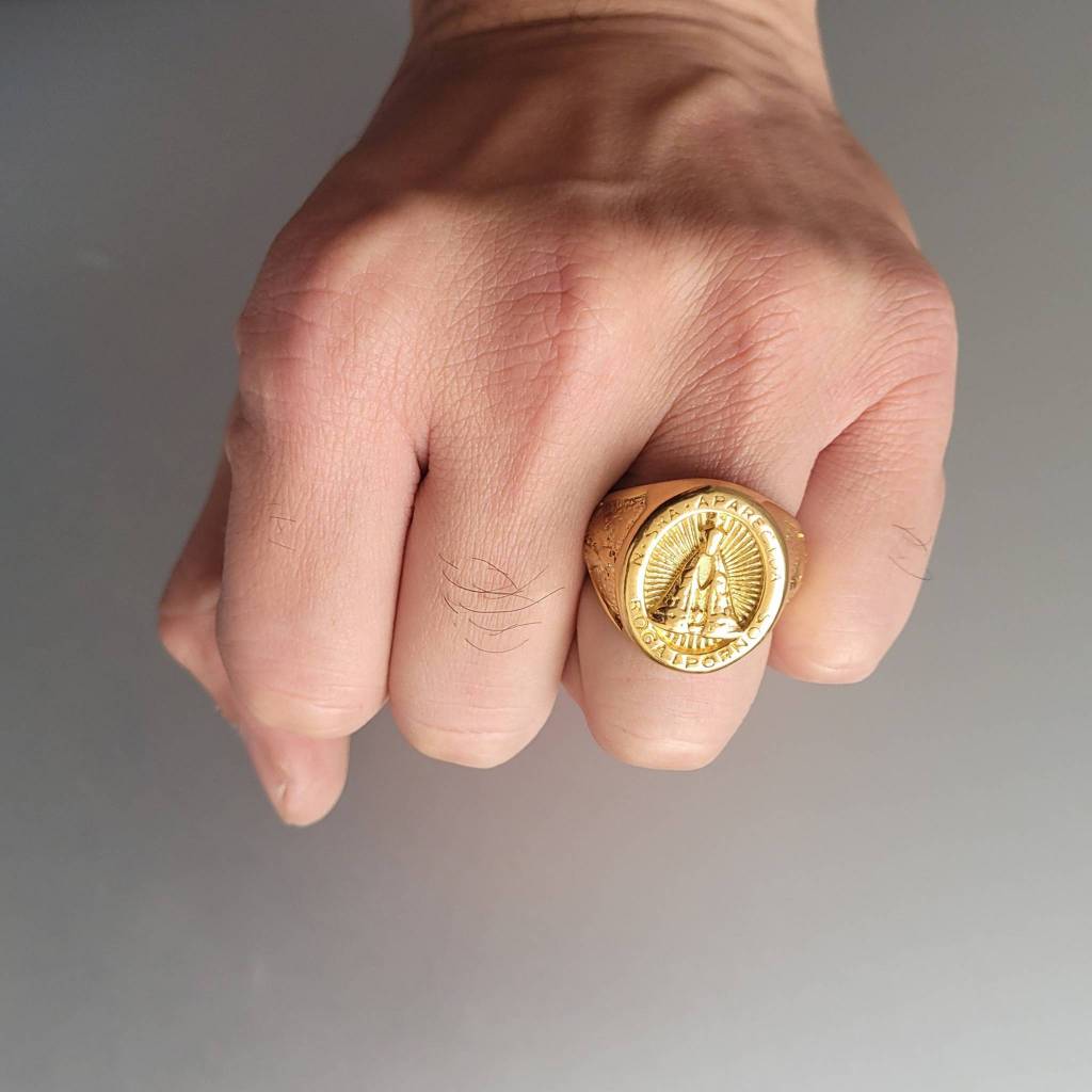 Anel Masculino Dedeira Nossa Senhora Aparecida Dourado de Aço Inoxidável 316L