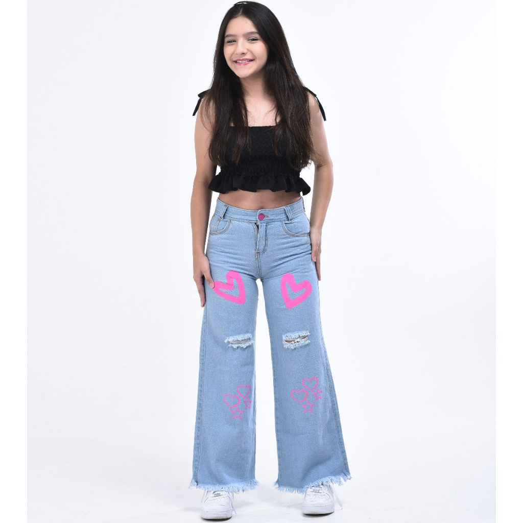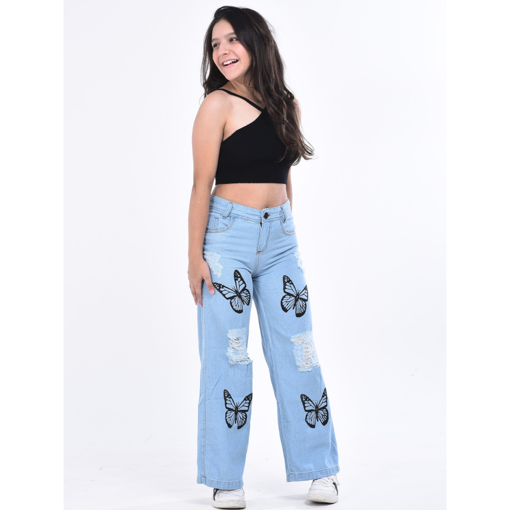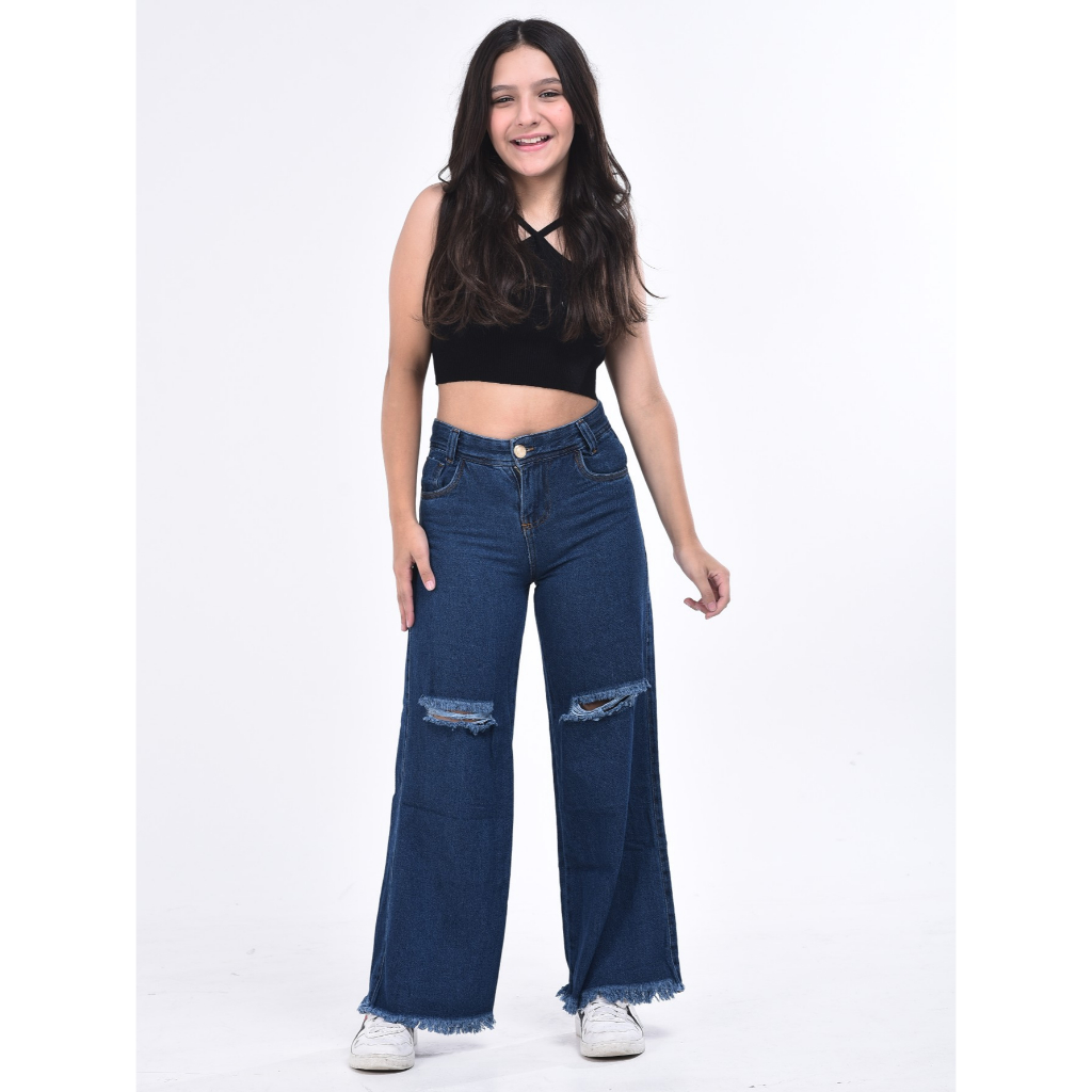 Calça feminina wide leg infantil juvenil pantalona jeans