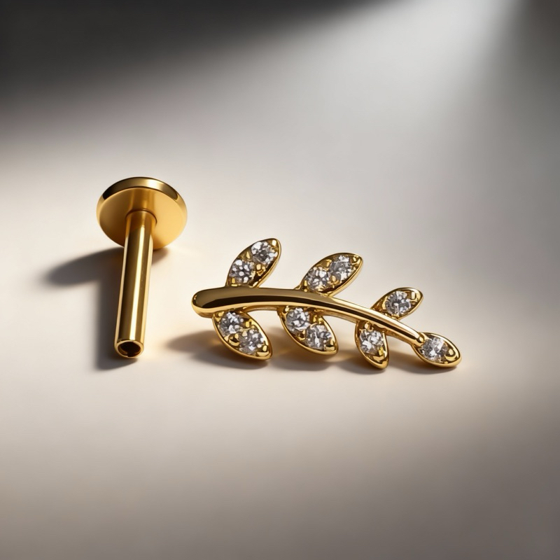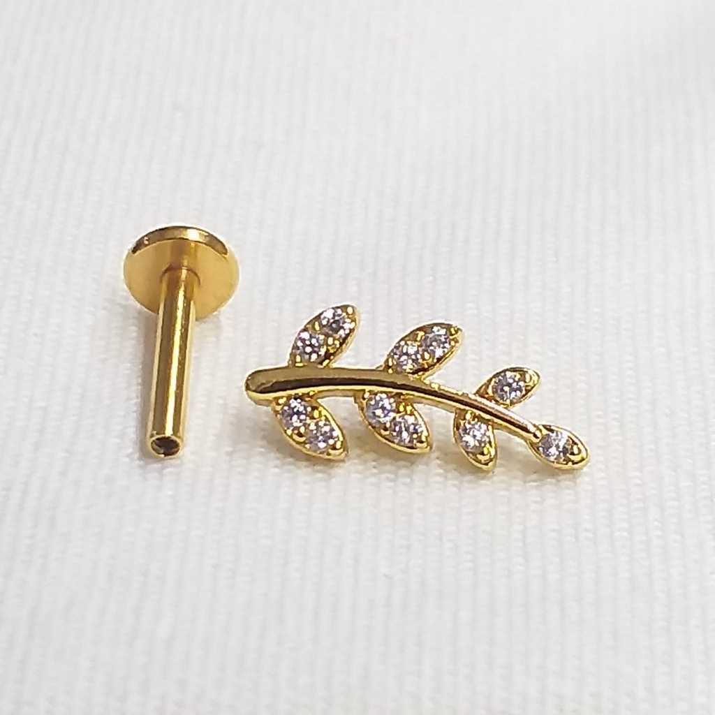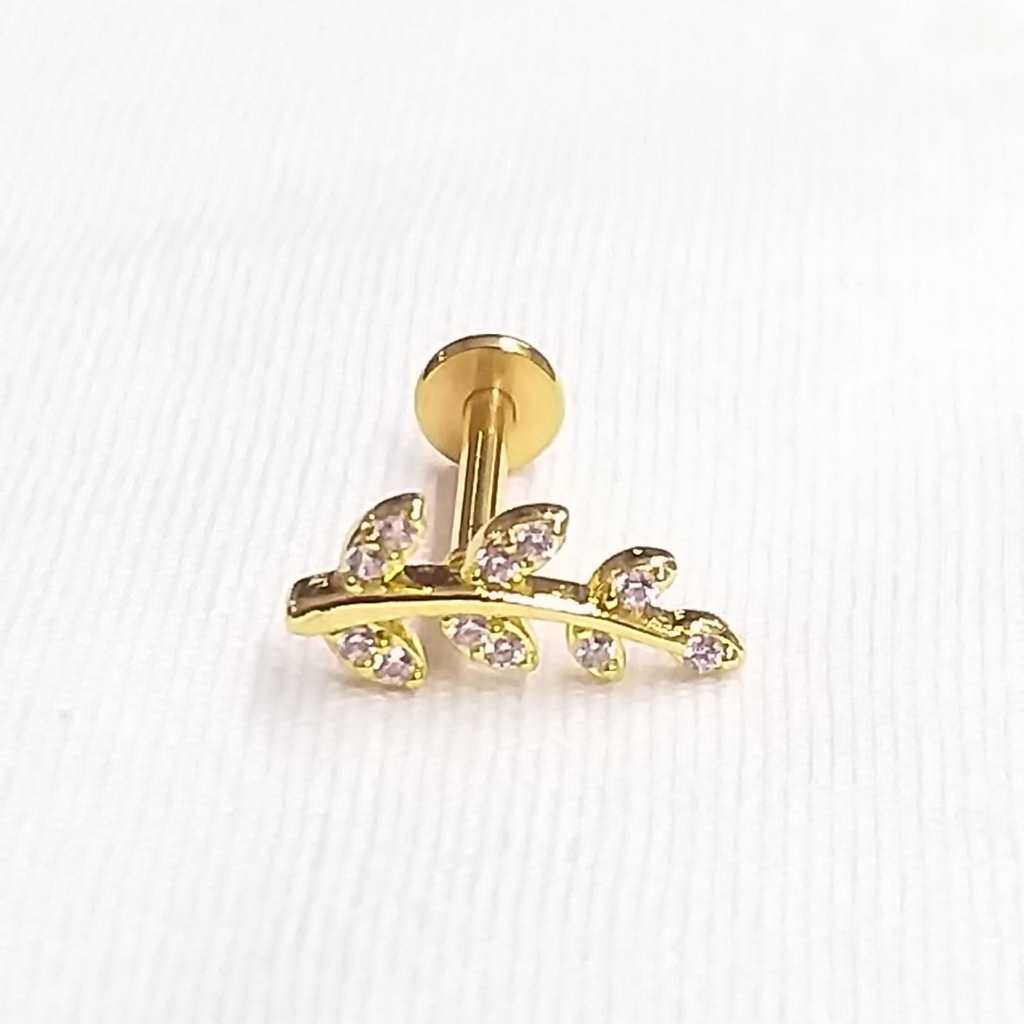 Piercing Labret Folha Com Pedraria Folheado a Ouro, Haste de 8mm 1.2 Hélix/Tragus