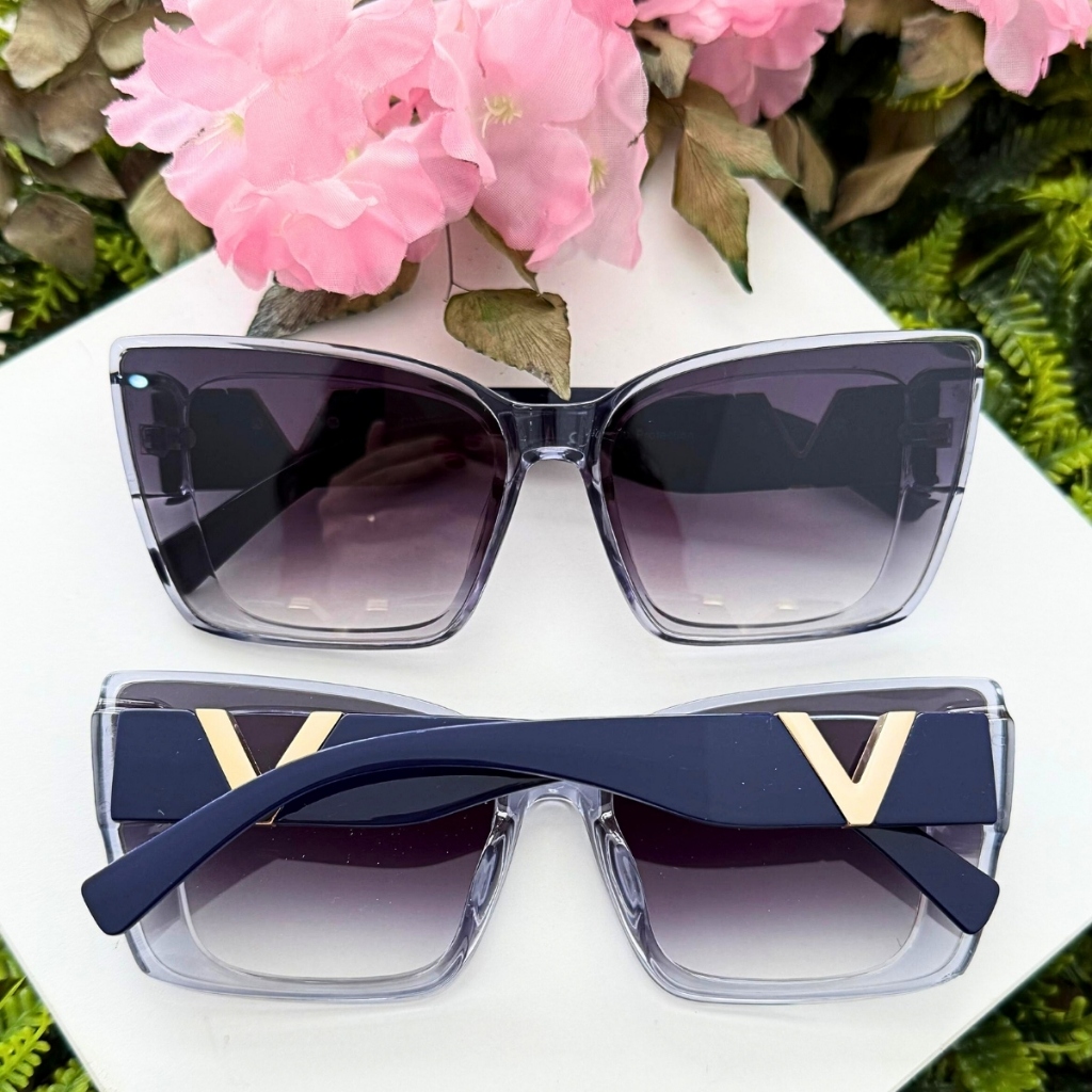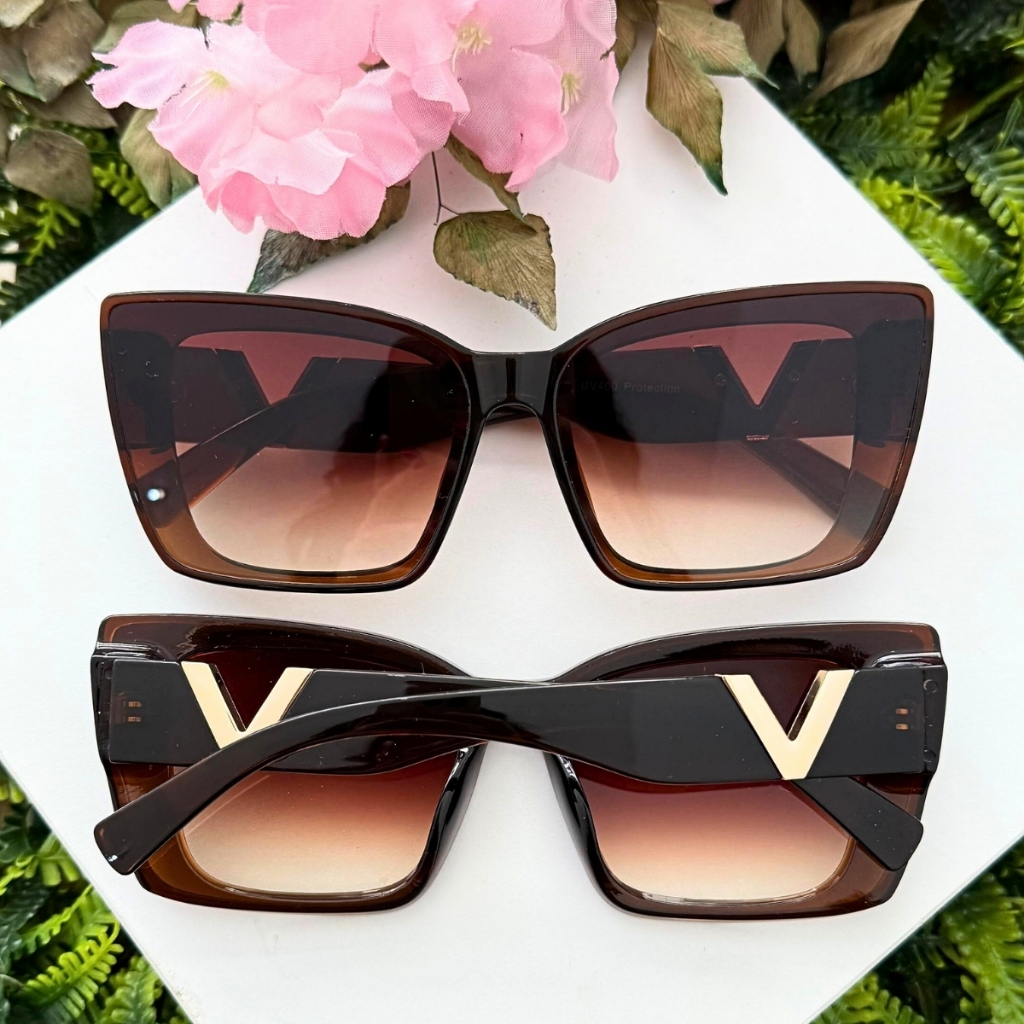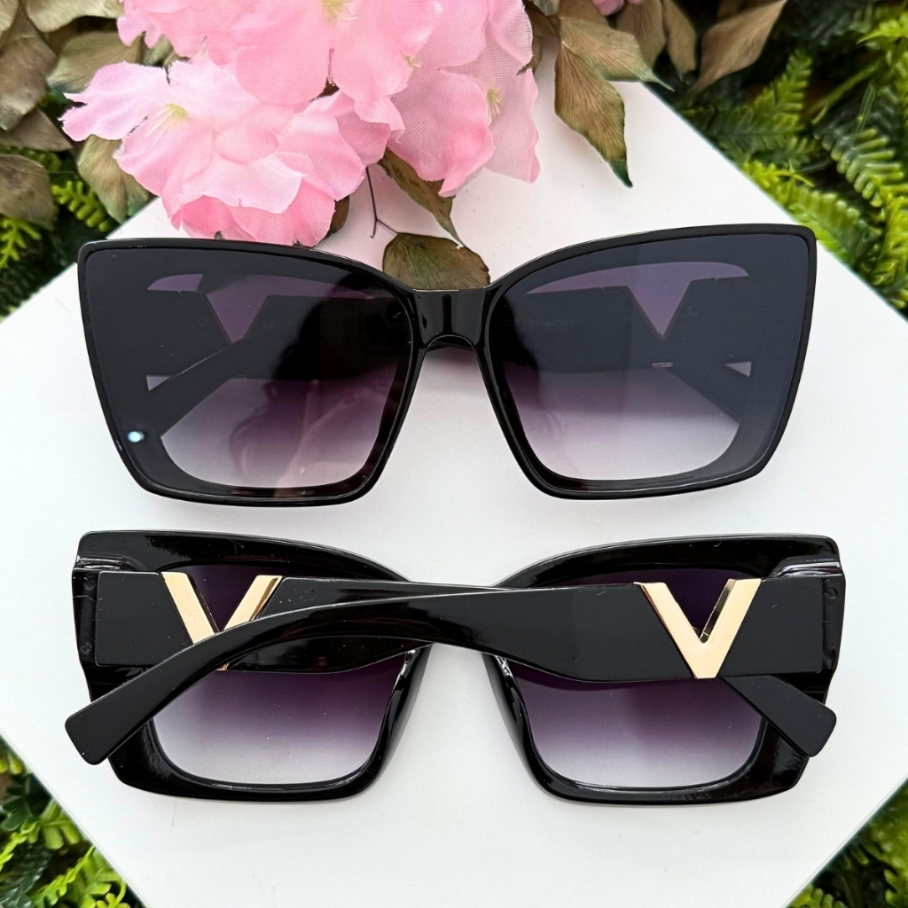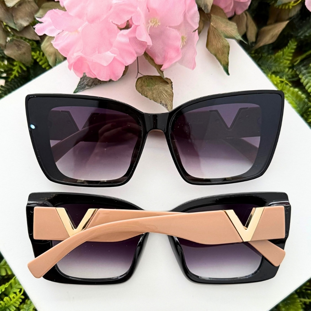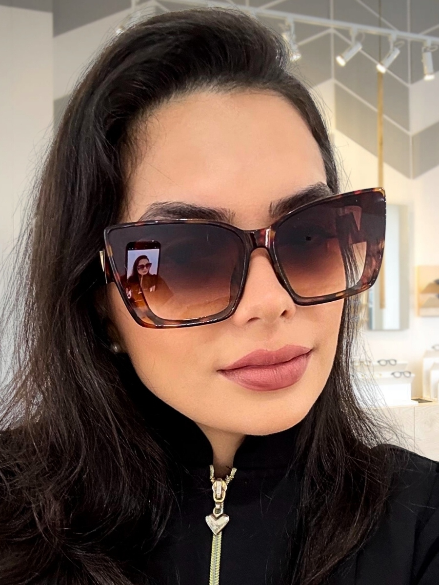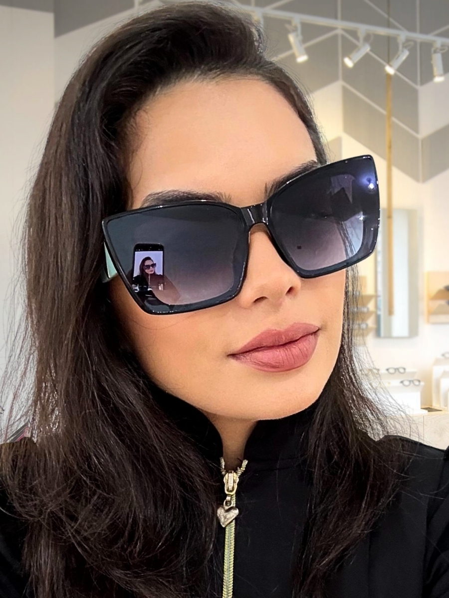 Óculos de Sol Feminino Gatinho Oversized Luxo Proteção UV400 Armação Resina Haste Dourada Estilo Moderno
