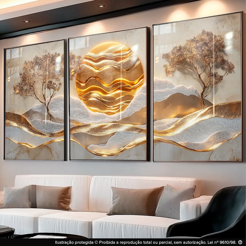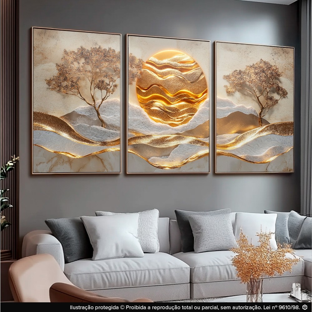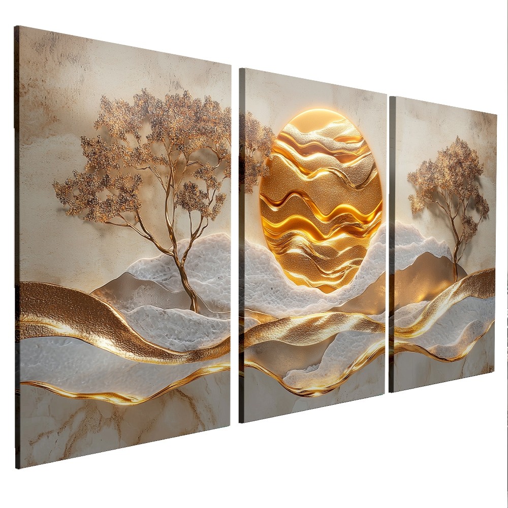 Quadro Decorativos 3pçs Abstrato Geométrico Árvores Lua Dourado Moderno para Sala Escritório