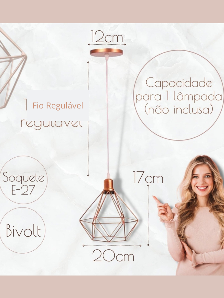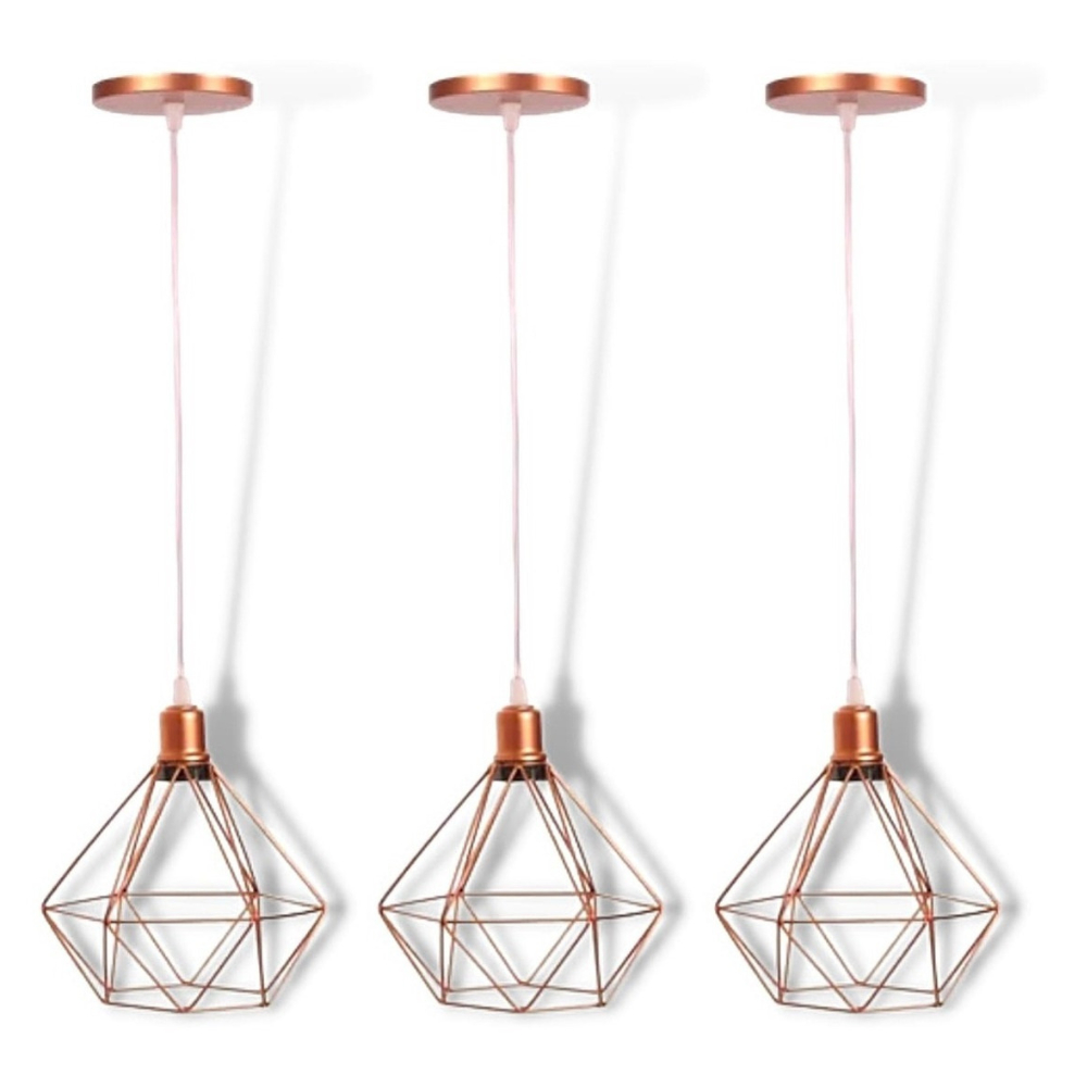 Kit 3 Pendente Aramado Diamante Retro ROSE GOLD FIO CRISTAL cabo regulavel