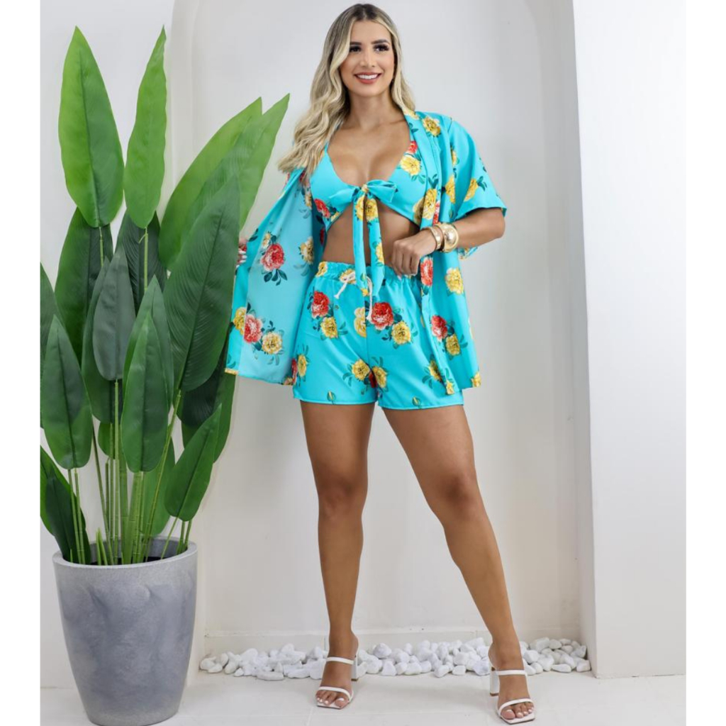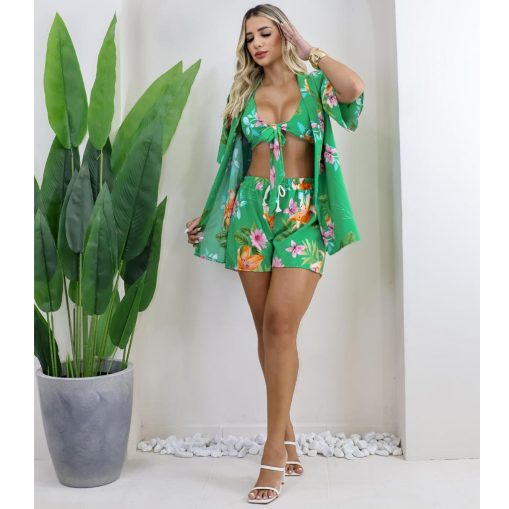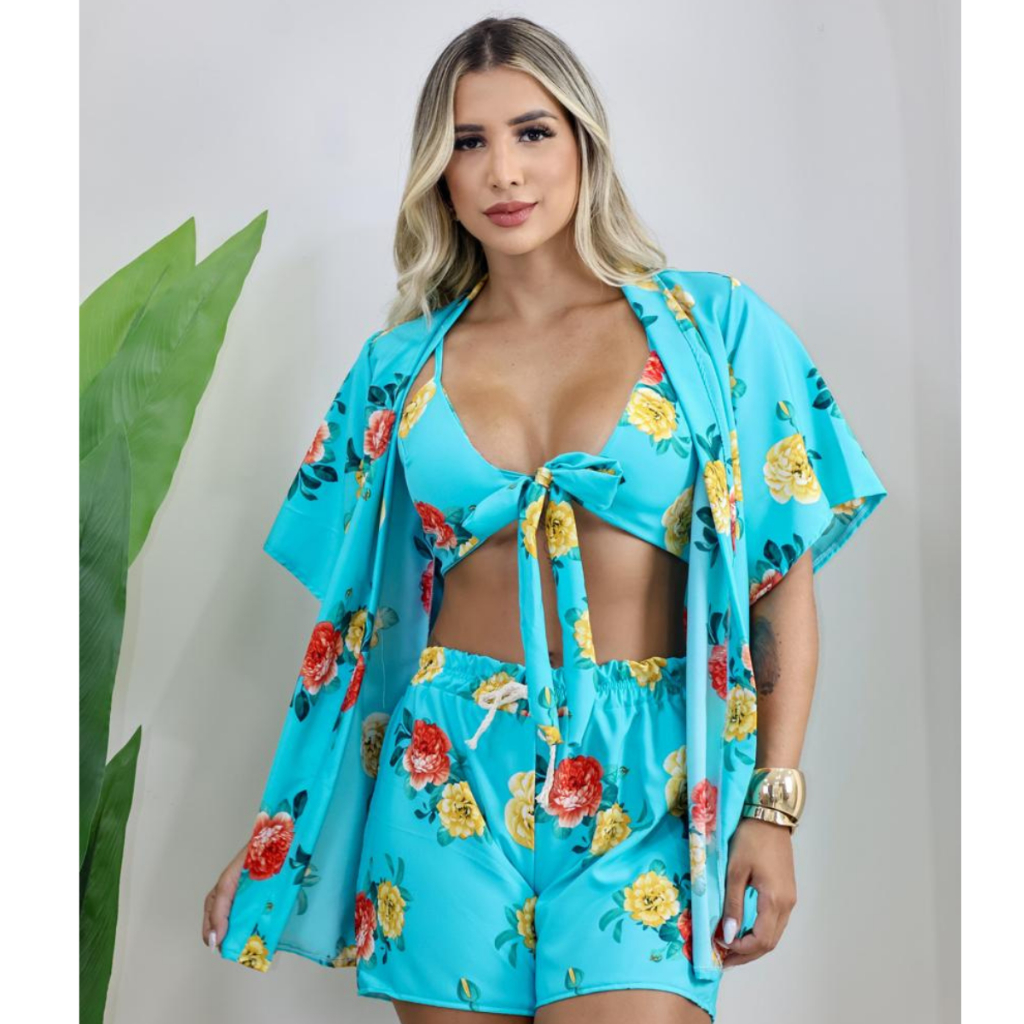 Promoção do Conjunto 3 peças Kimono Short Top Feminino Casual Saída De Praia Conjunto Feminino