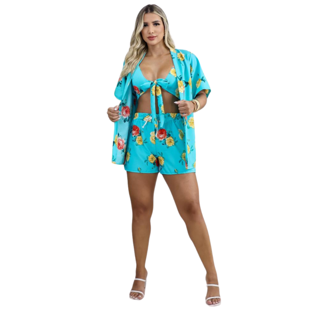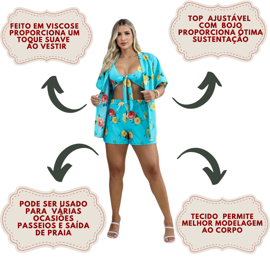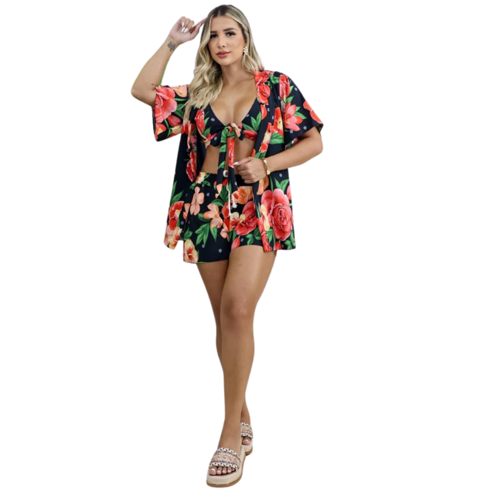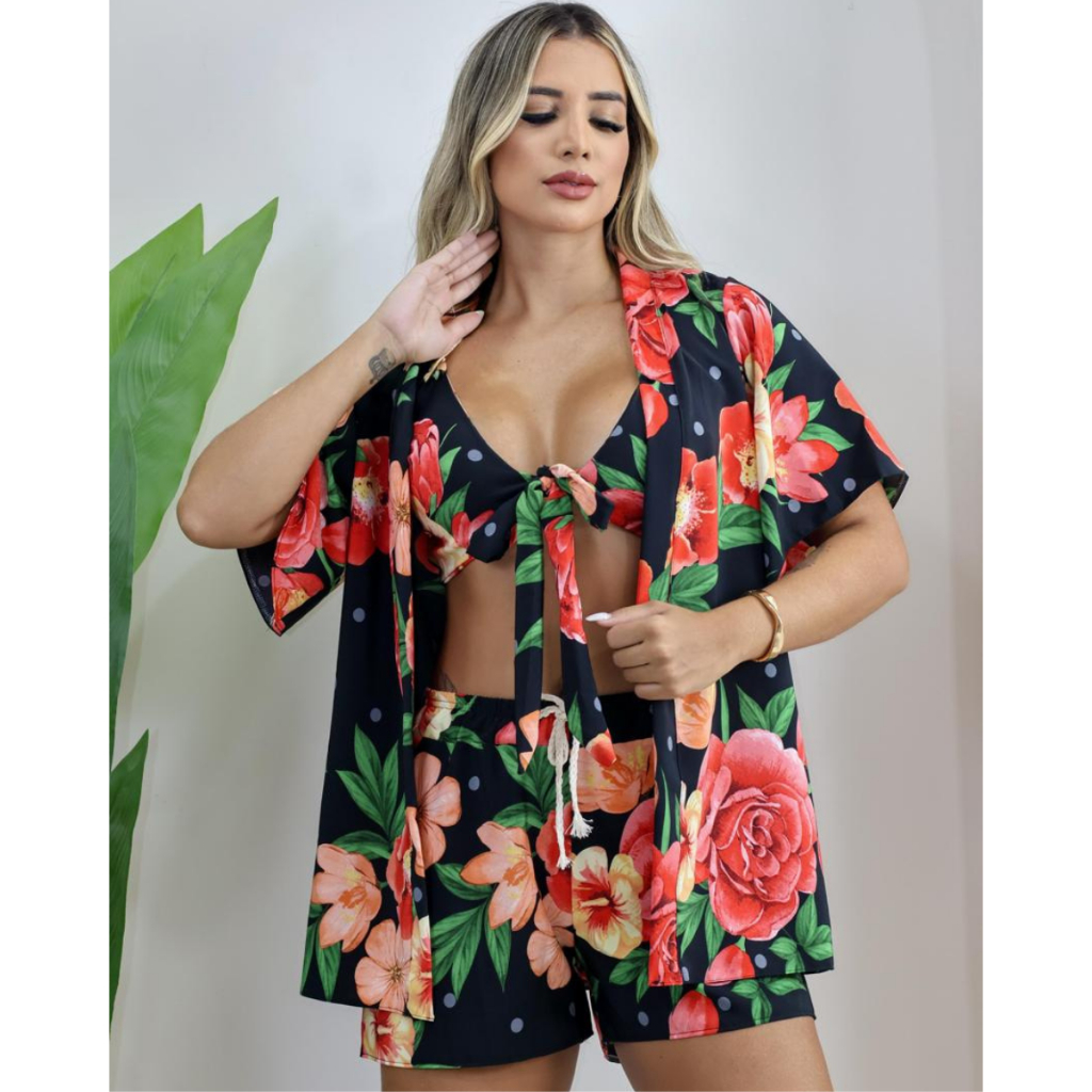 Conjunto 3 Peças Kimono + Short + Top Saida De Praia