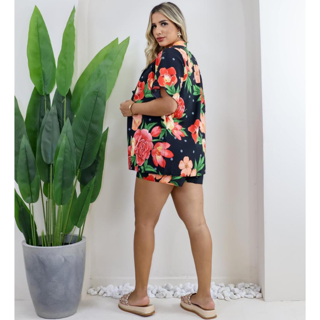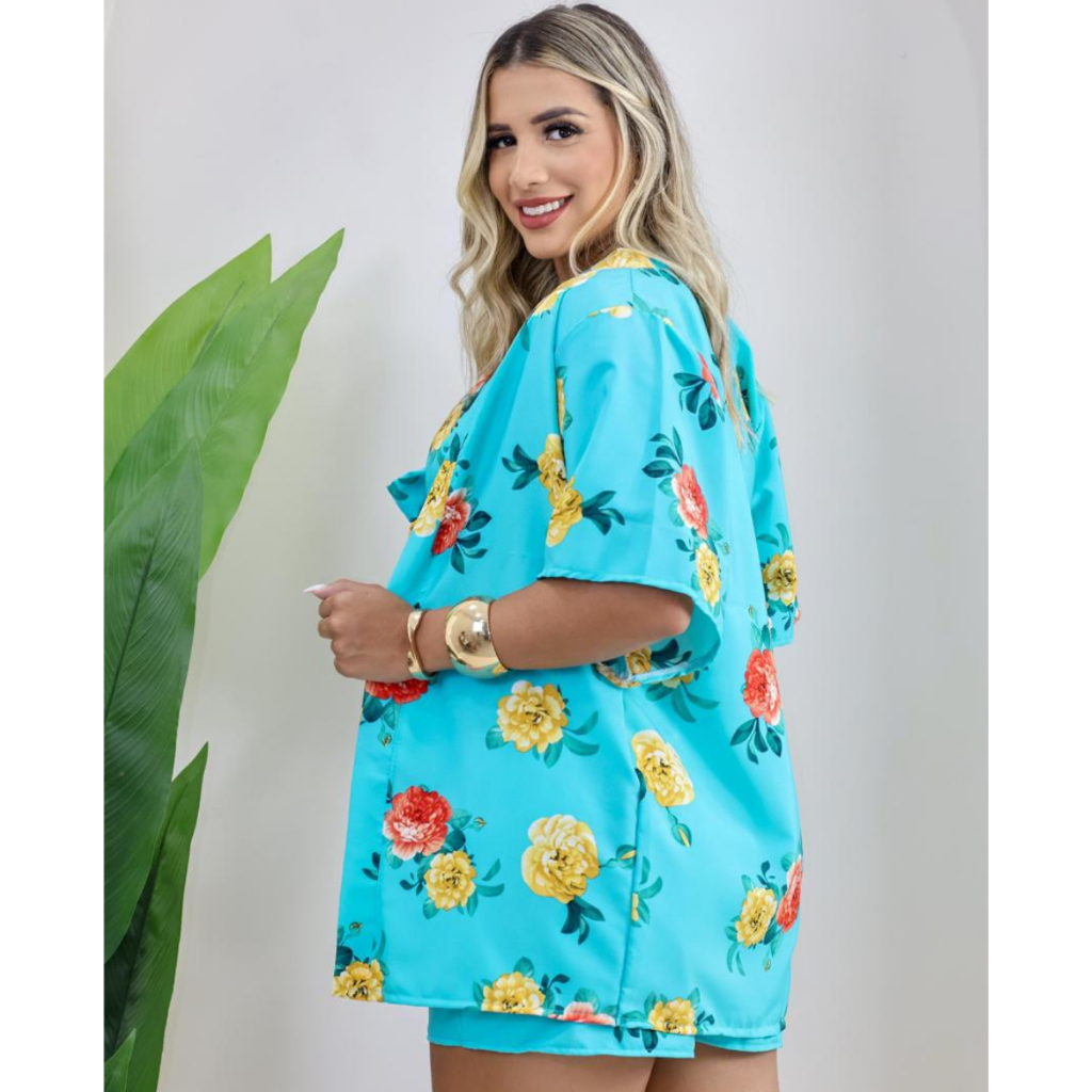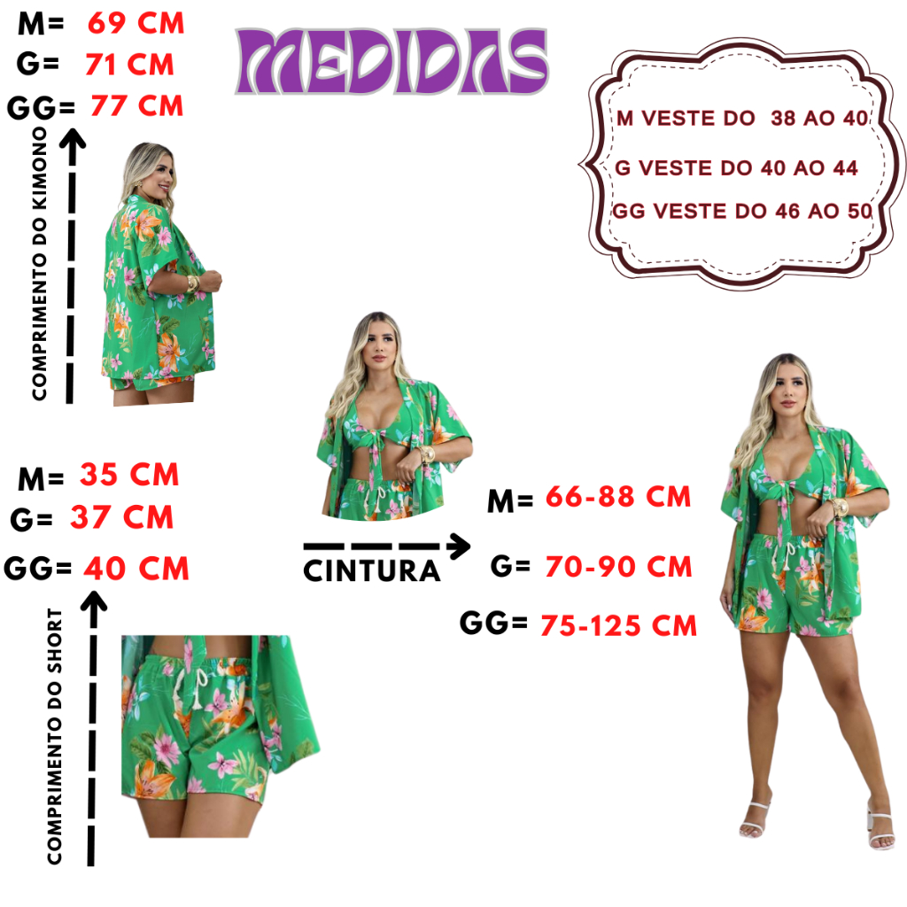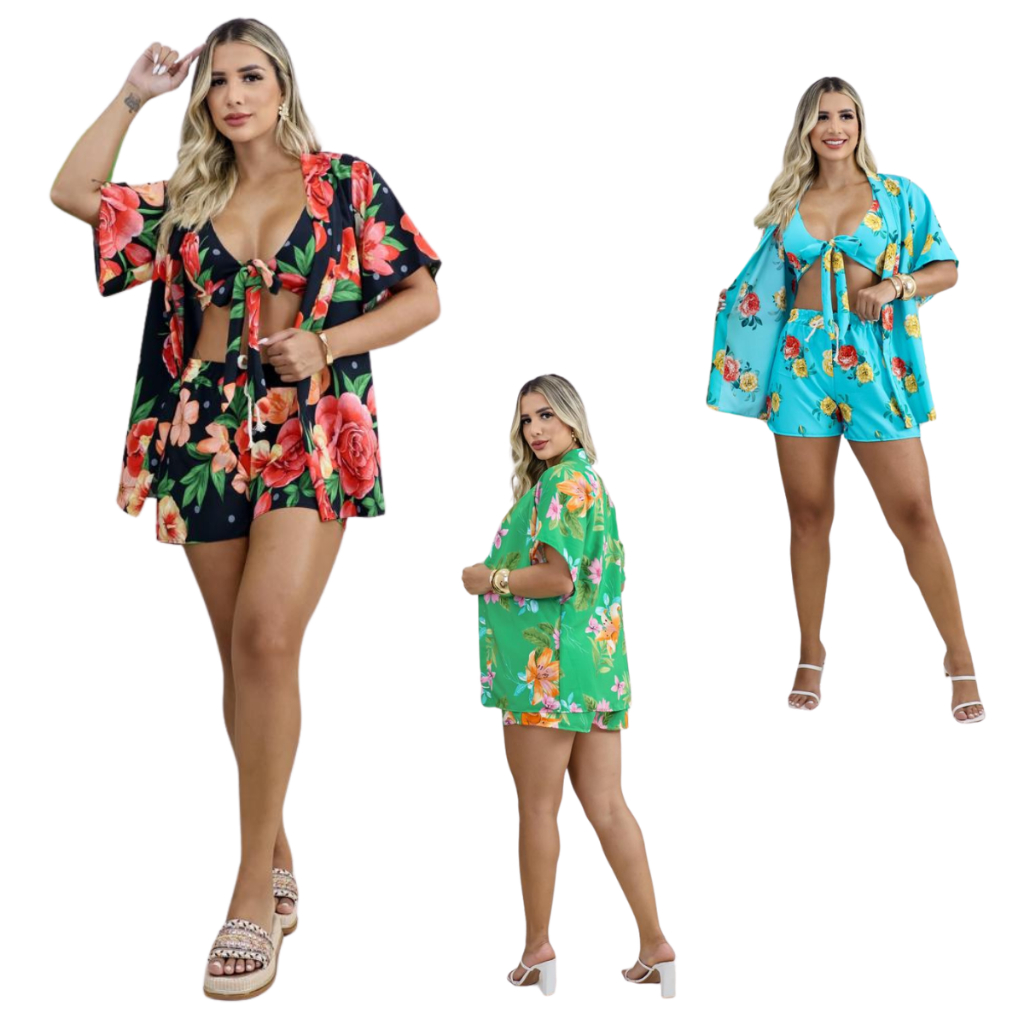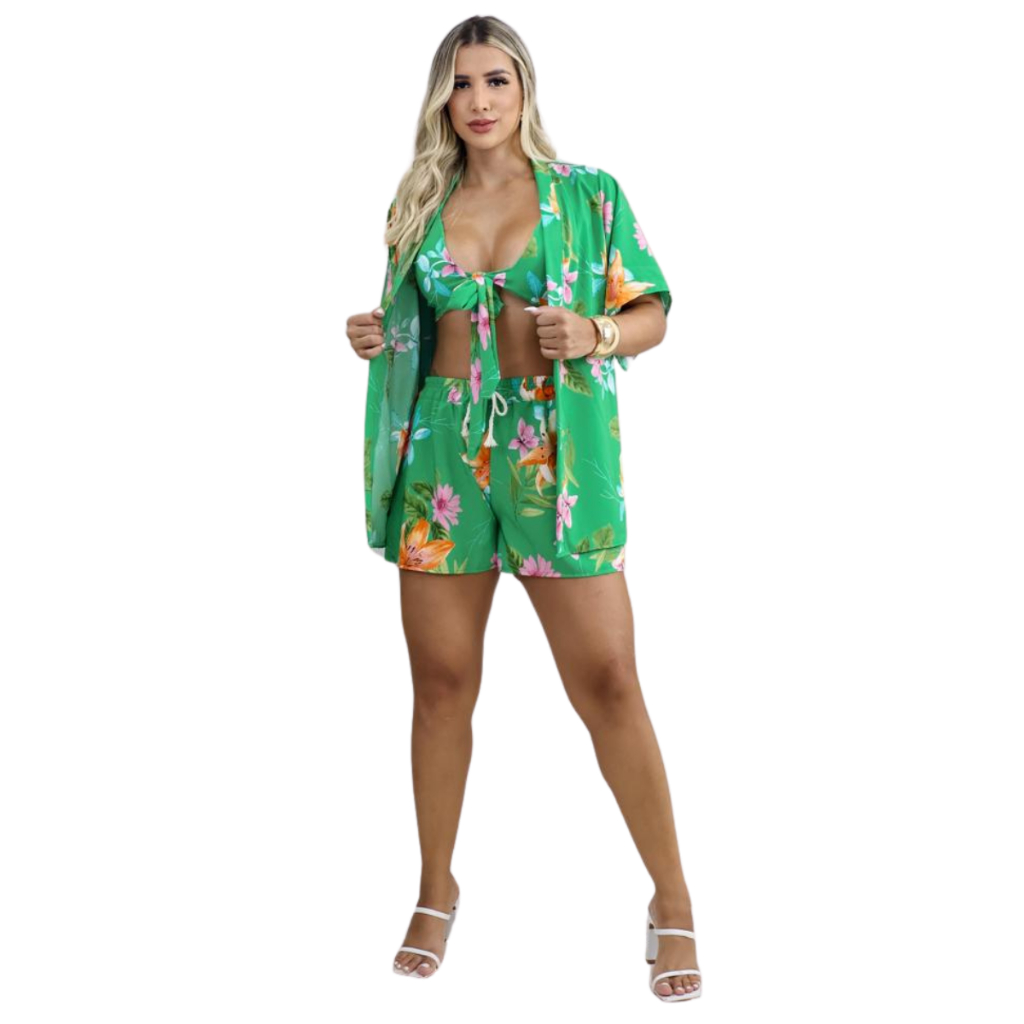 Conjunto 3 Peças Kimono + Short + Top Saida De Praia