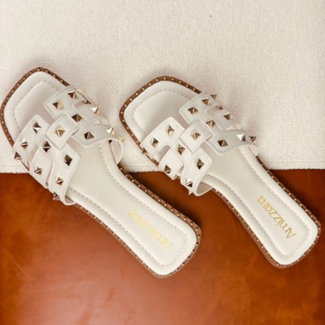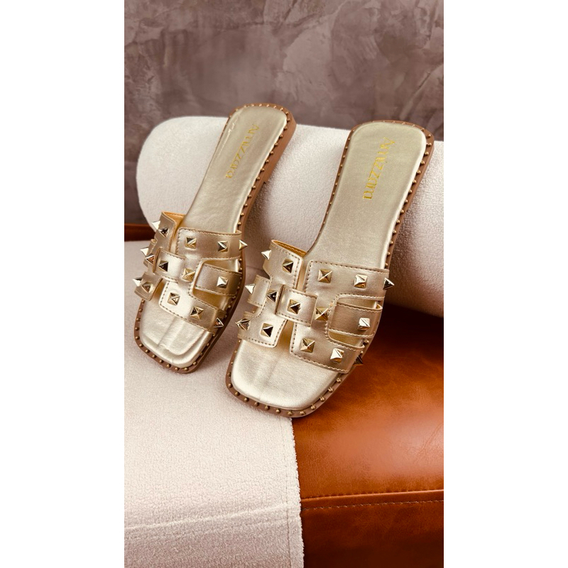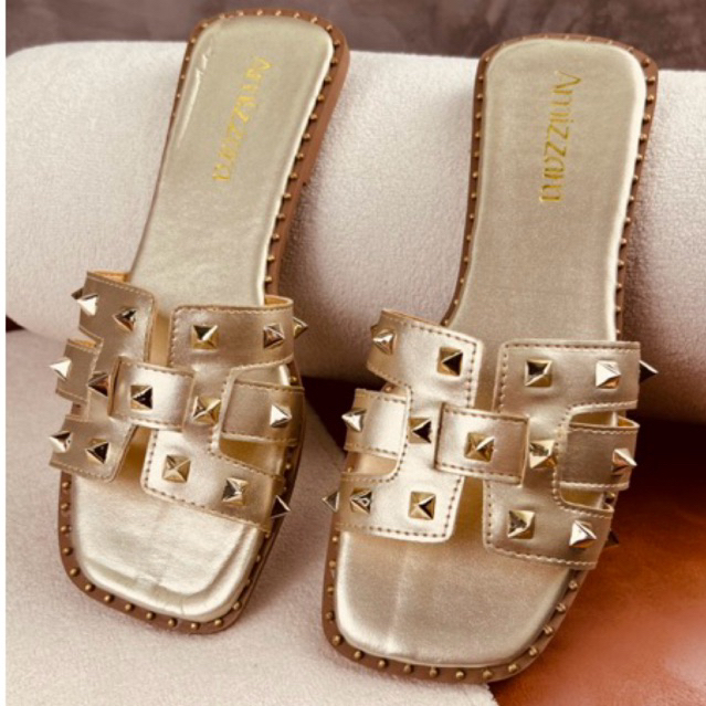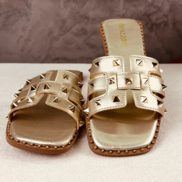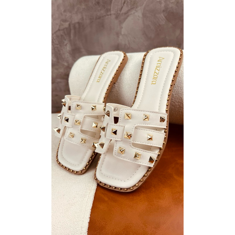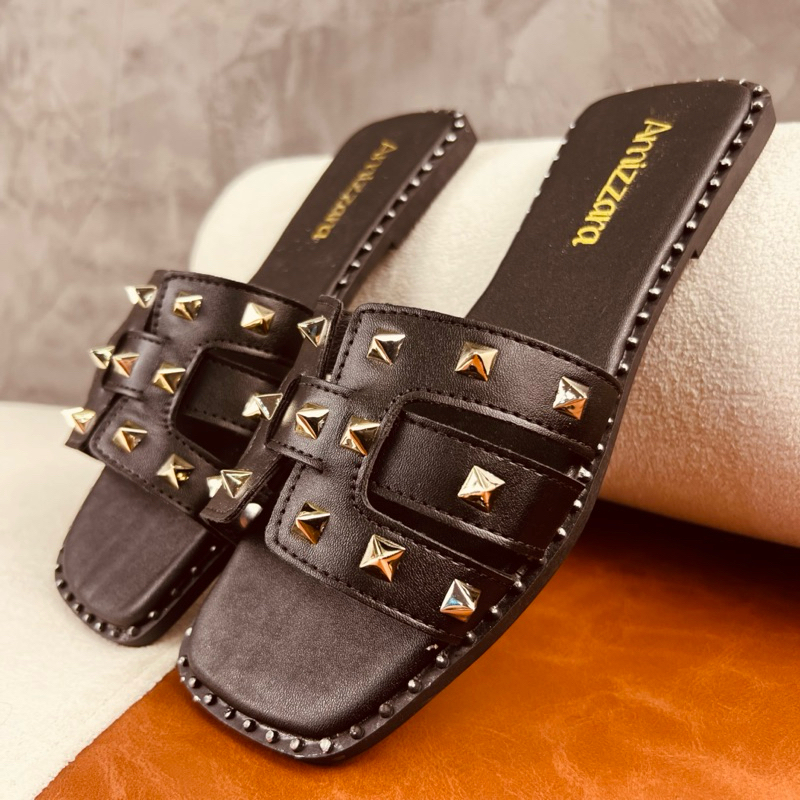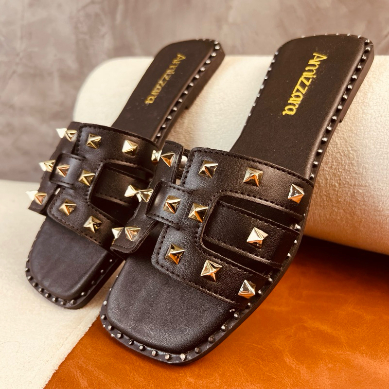 Sandália Rasteira Feminina Amizzara Tachas Spike Pirâmide Bico Quadrado Confortável Blogueira