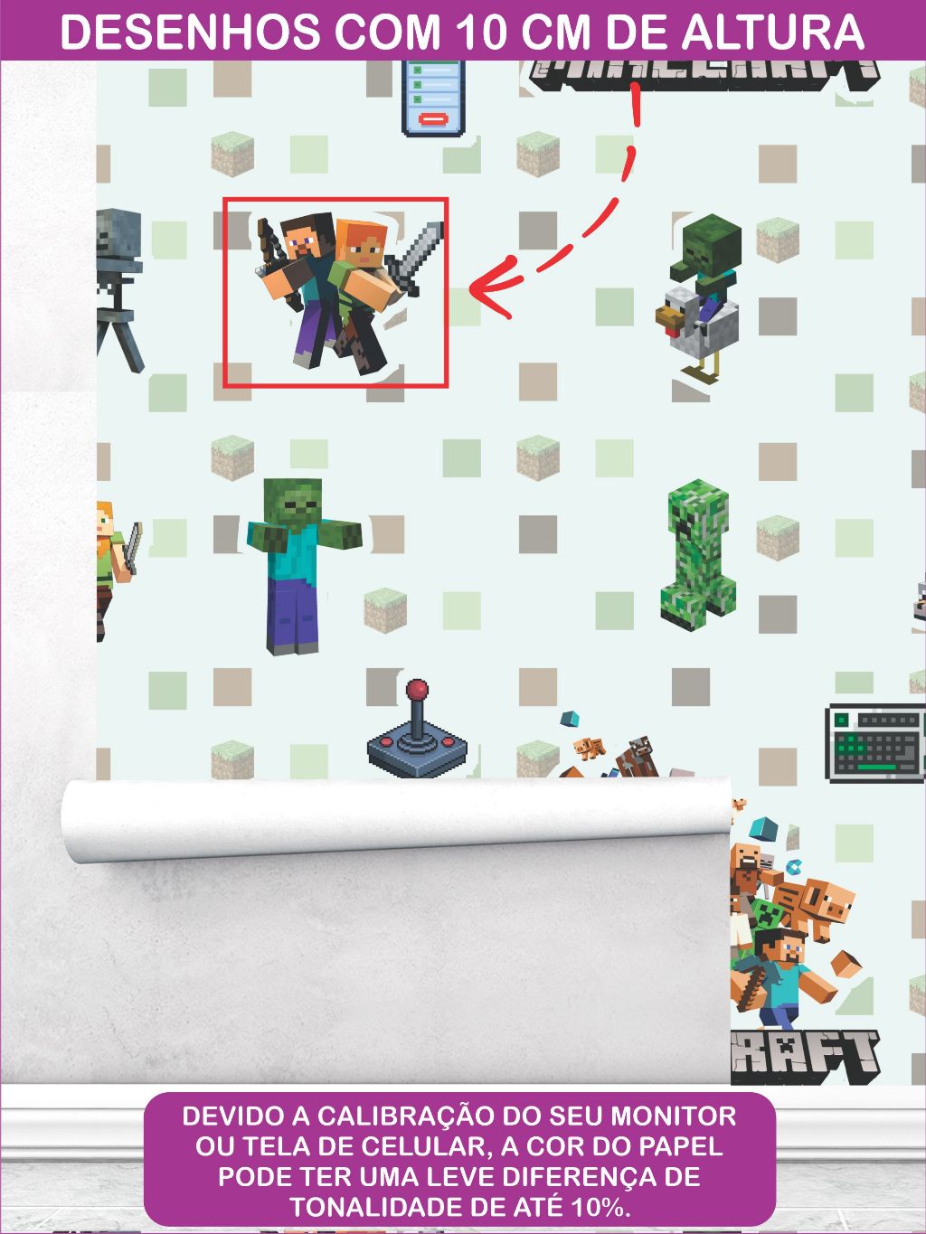 PAPEL DE PAREDE MINECRAFT MOD-2 | FUNDO VERDE CLARO | QUARTO GAMER INFANTIL | LAVAVEL | ALTO COLANTE