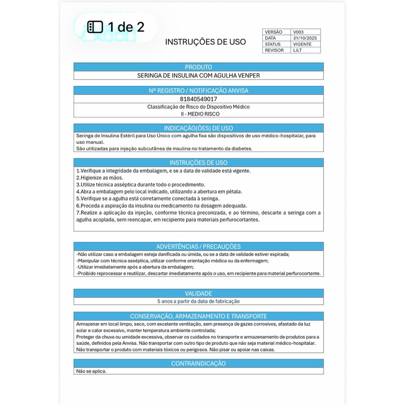 Seringa de Insulina 0,5ml (50 ui) com Agulha Ultrafina 6x0,25mm pacote com 10 ou 20 uni REGISTRO 81840549017
