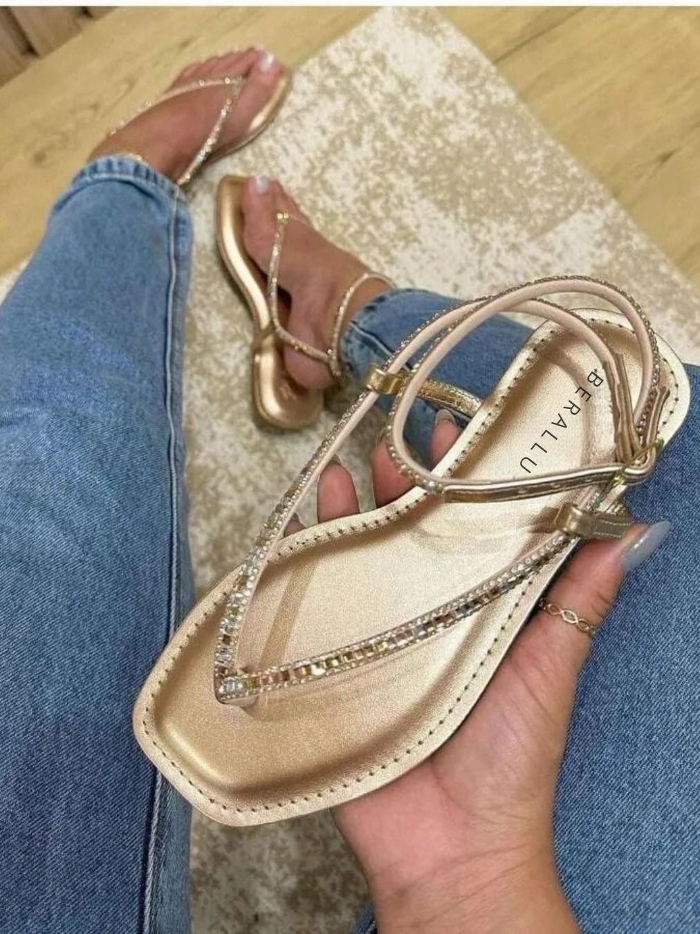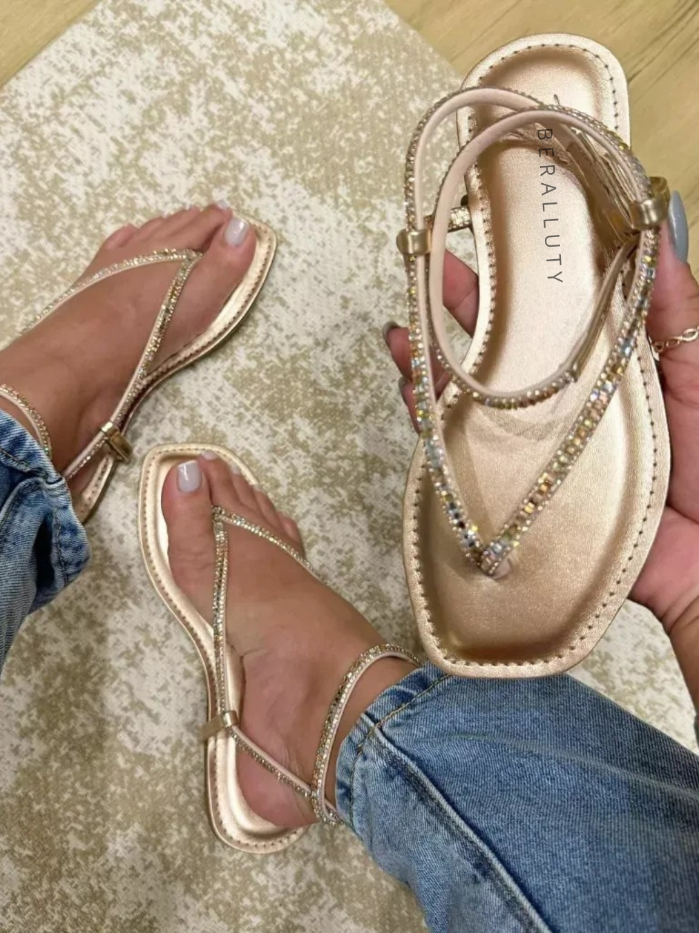 SANDÁLIA FEMININA DOURADA RASTEIRA COM TIRAS DE STRASS PROMOÇÃO