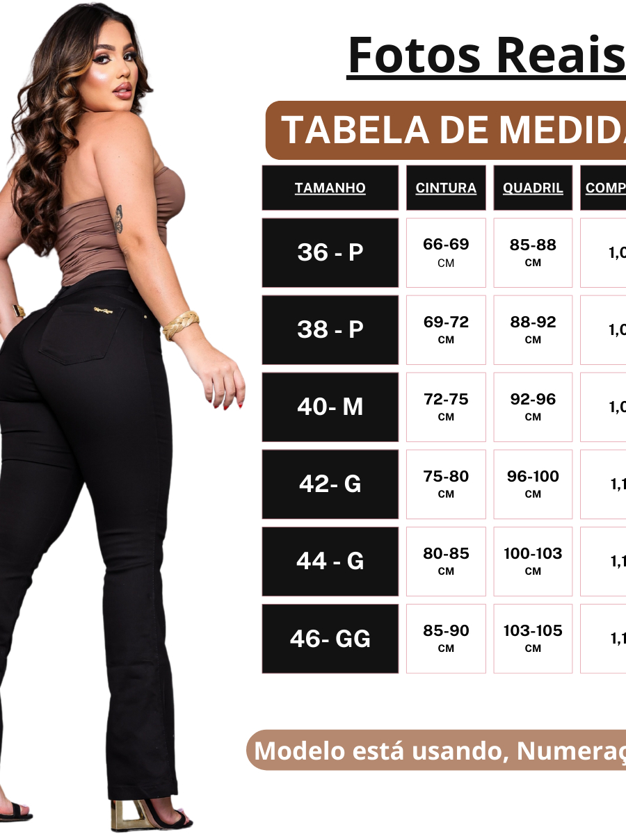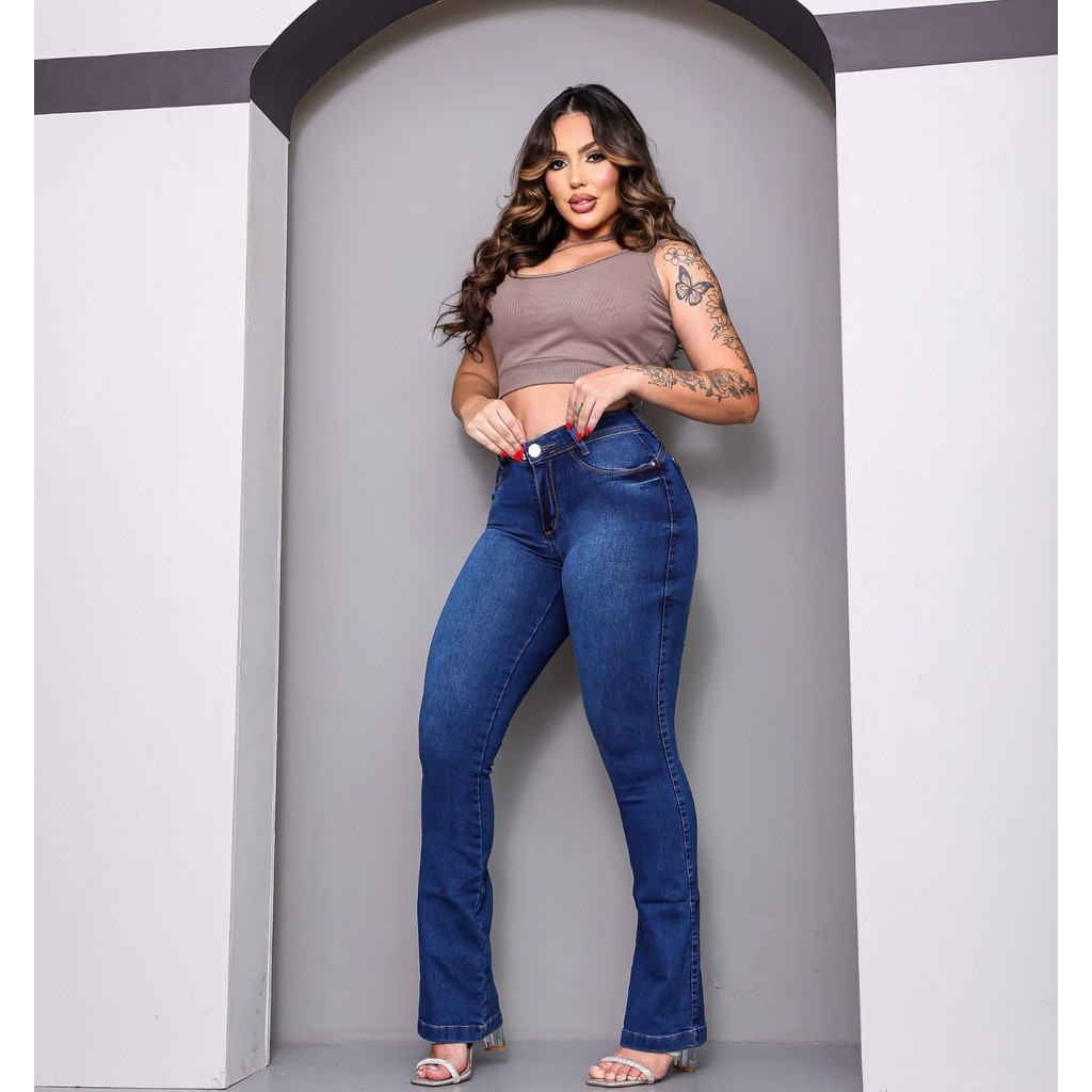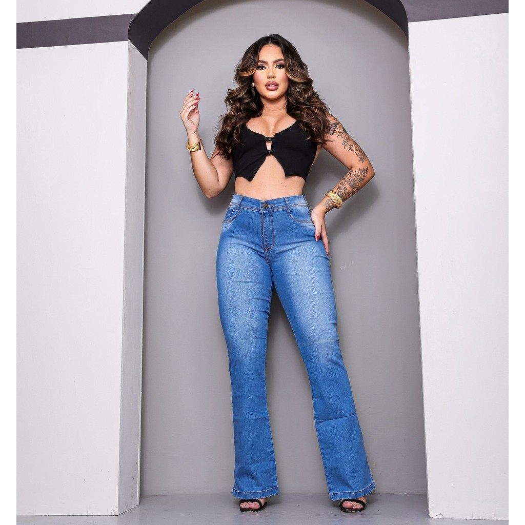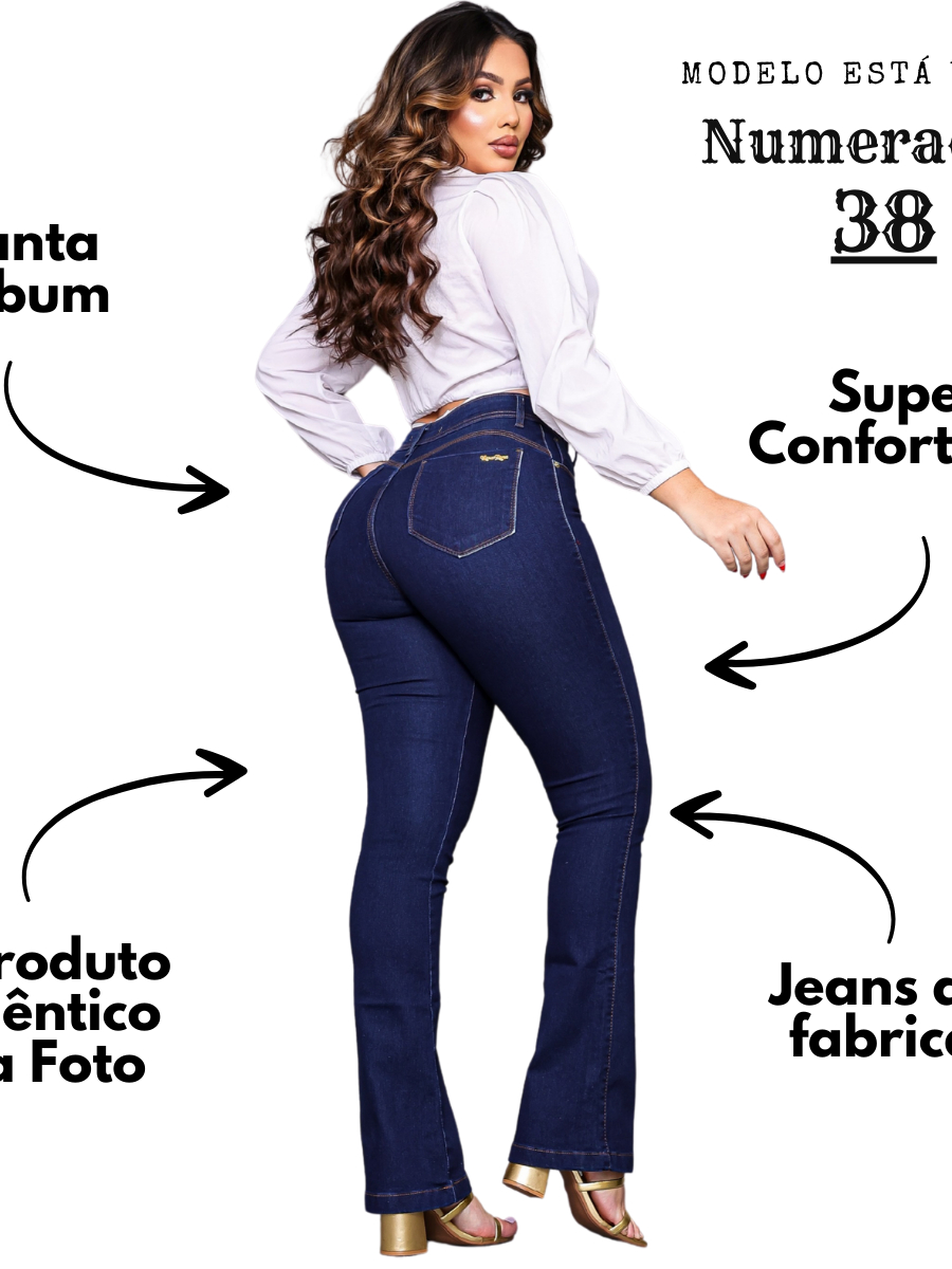 Calças Jeans Flare Feminina Cintura Alta Boca Sino com Lycra Wide Leg Efeito Empina Bumbum Premium