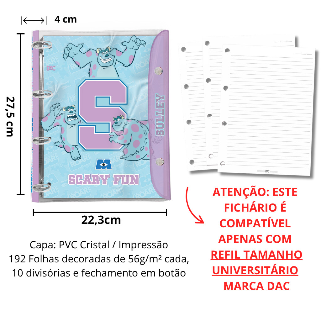 Fichário Universitário PVC Cristal 10 Divisórias Monstros SA 192 fls - DAC