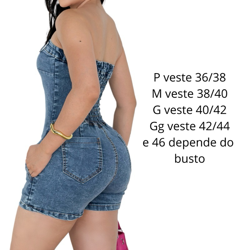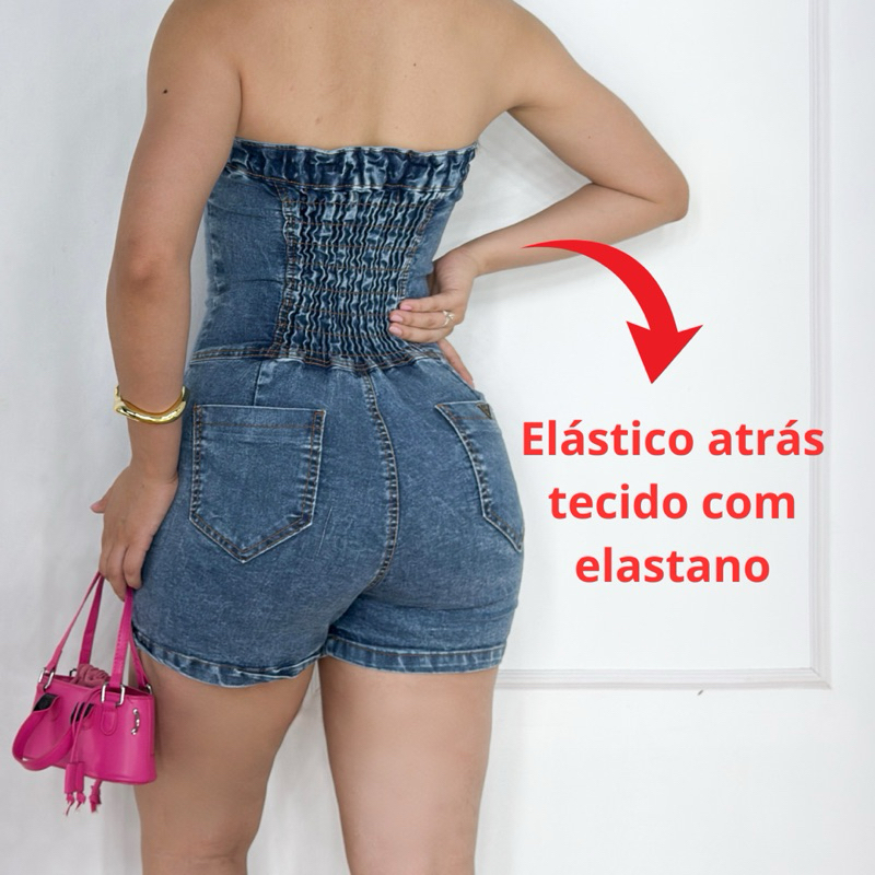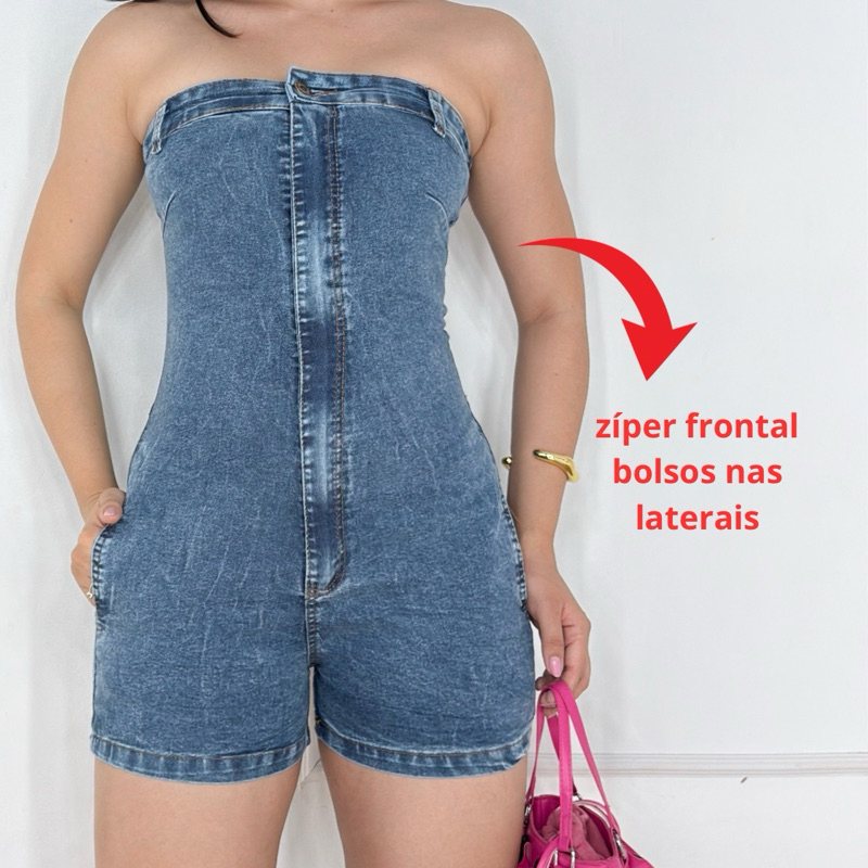 Macaquinho jeans claro feminino perfil blogueira com lycra.