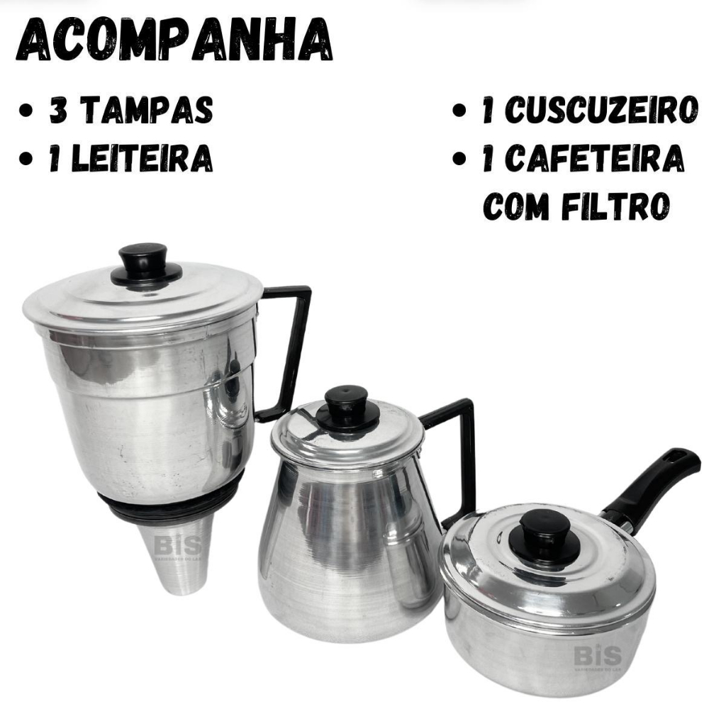Cafeteira Multiuso 3 em 1 + Cuscuzeiro Individual Cuscuz Nordestino + Fervedor Em Aluminio