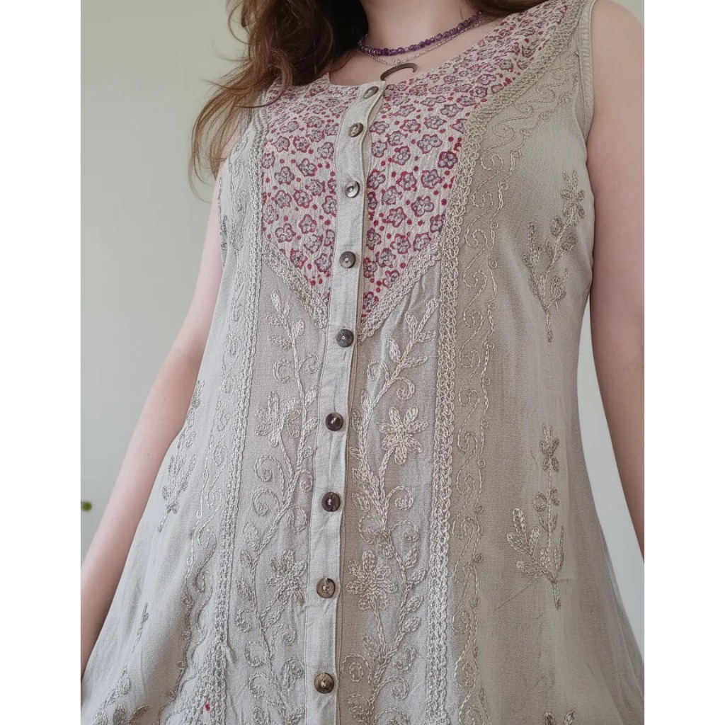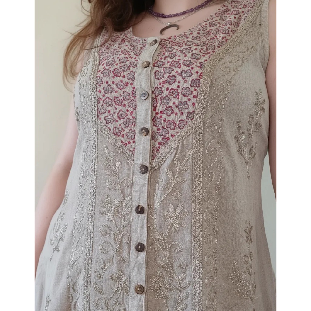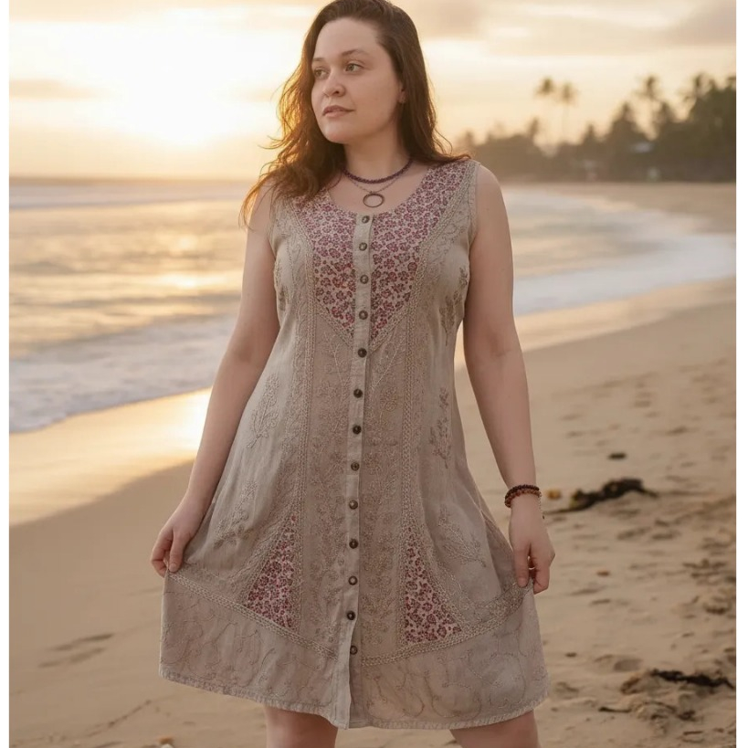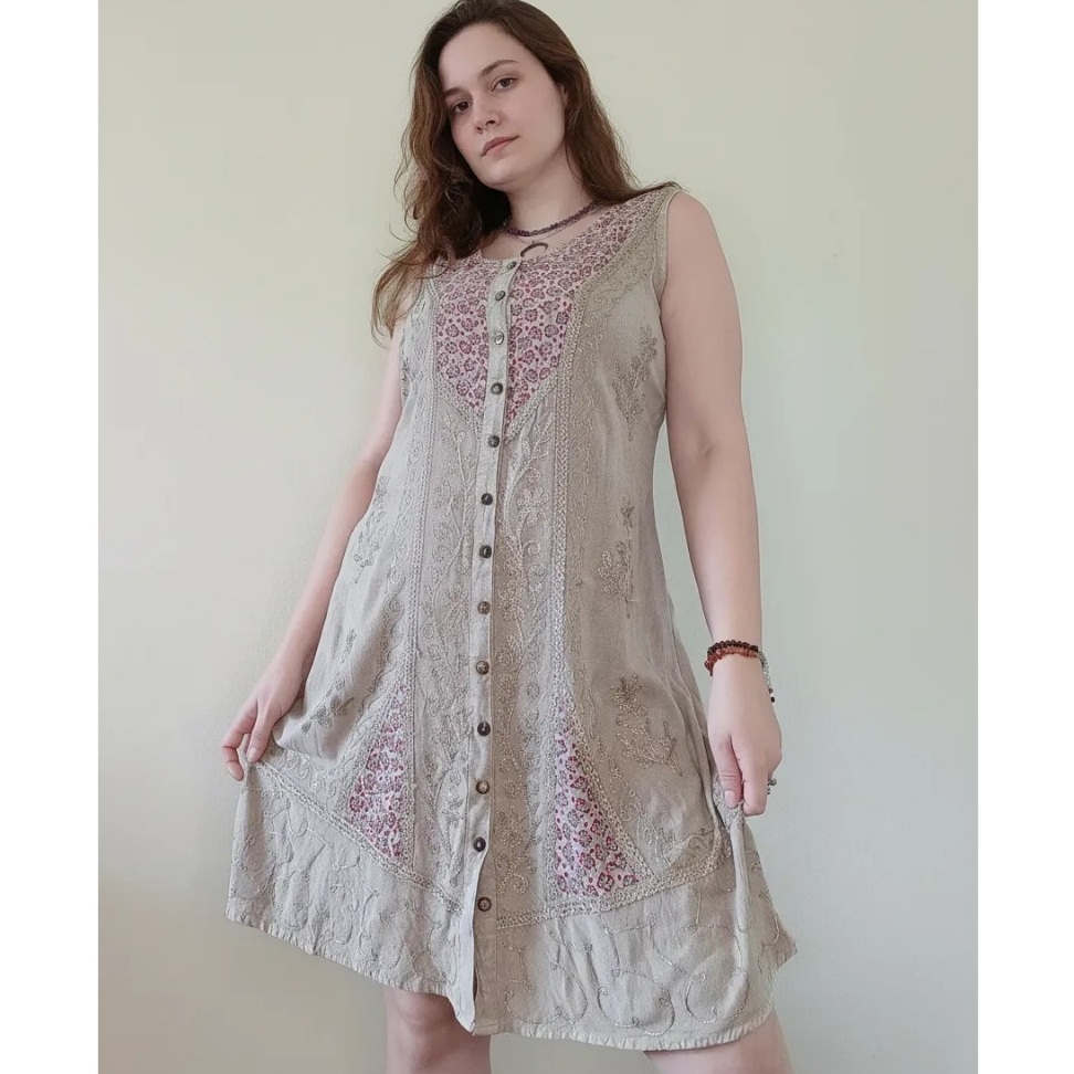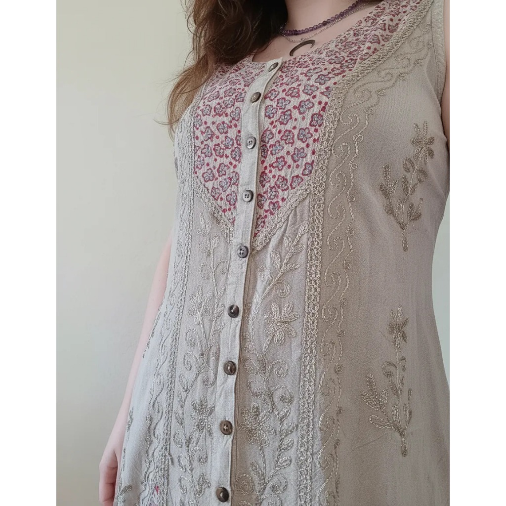 Vestido Indiano Regata Com Botões Bordado Estonado Hippie Boho Curto