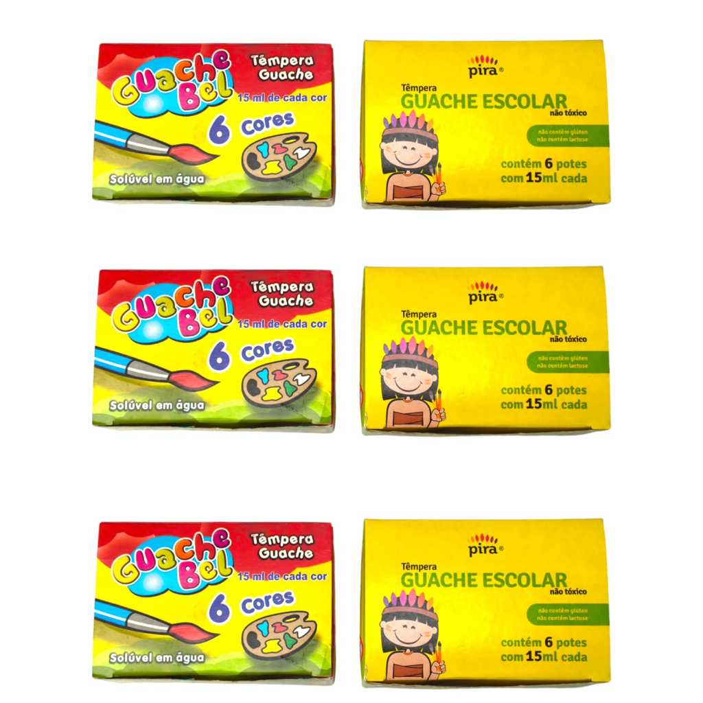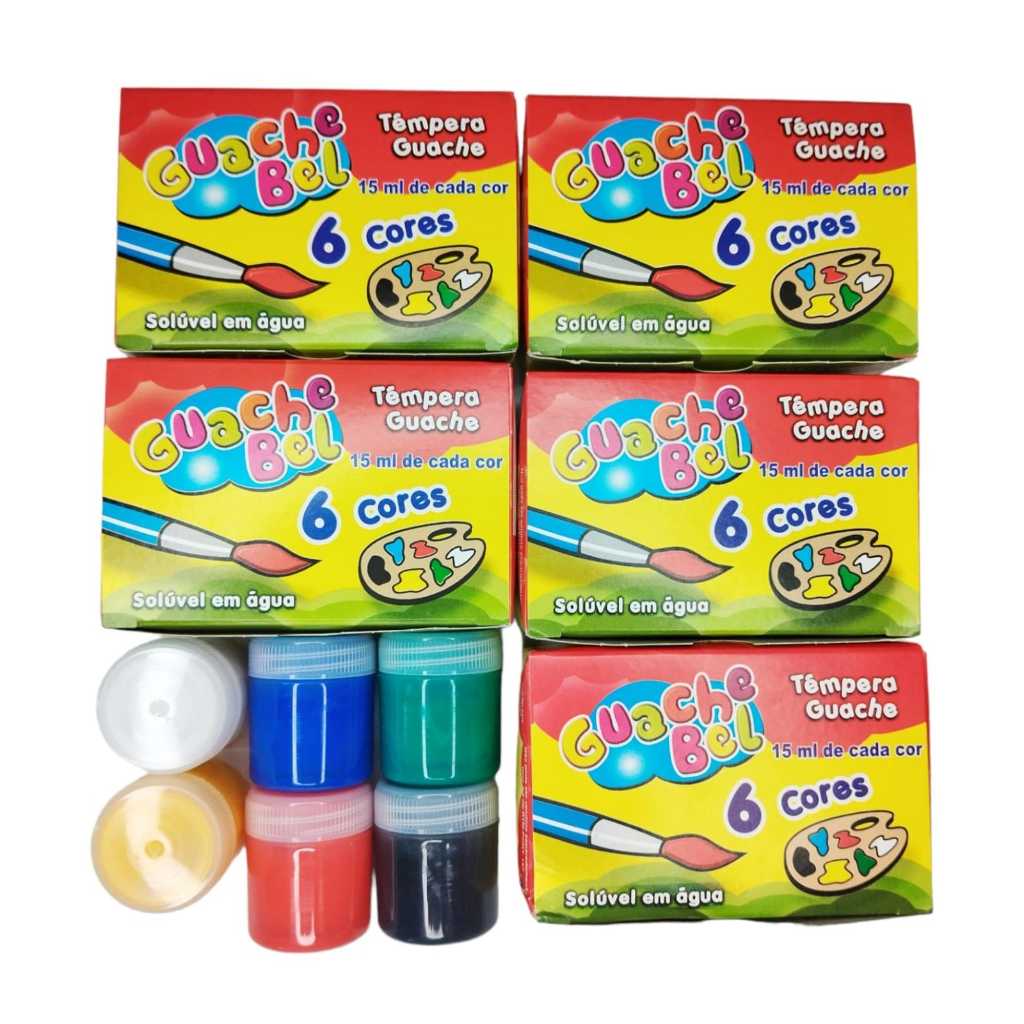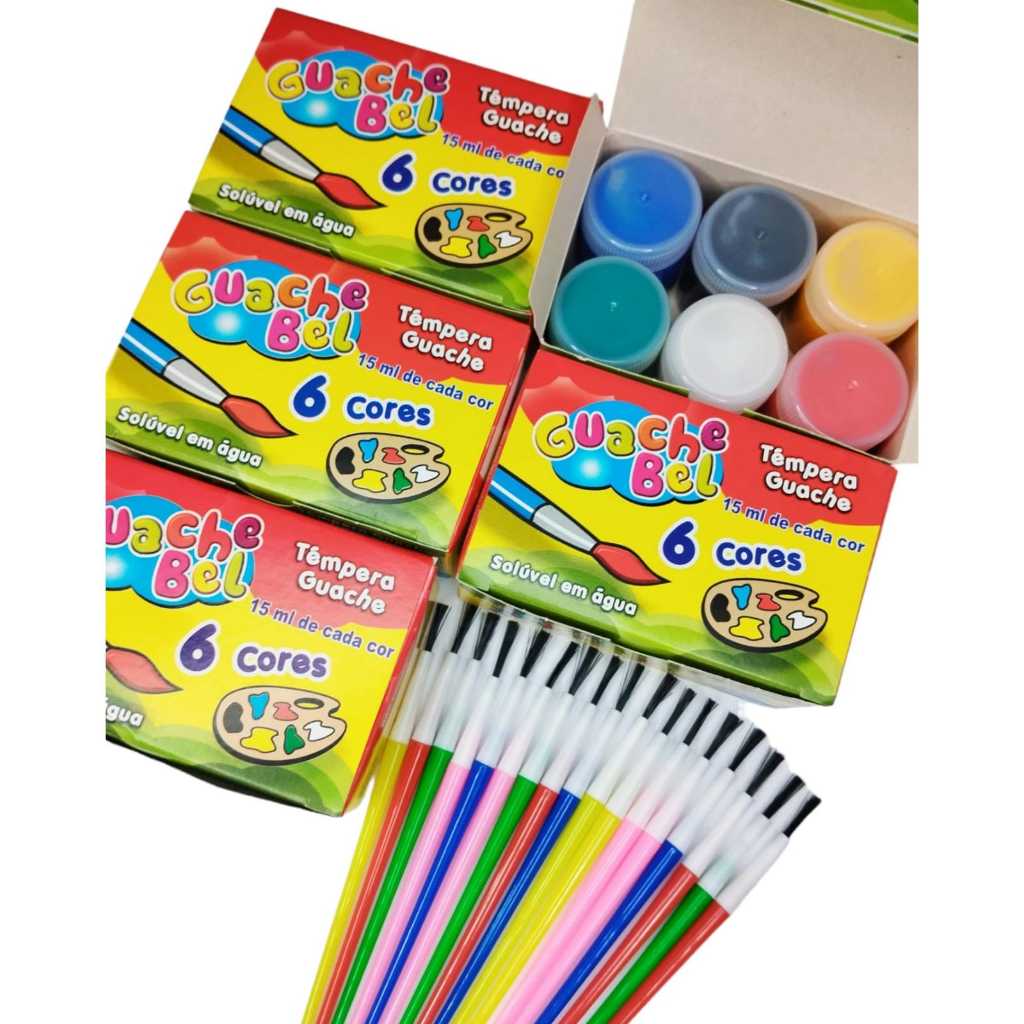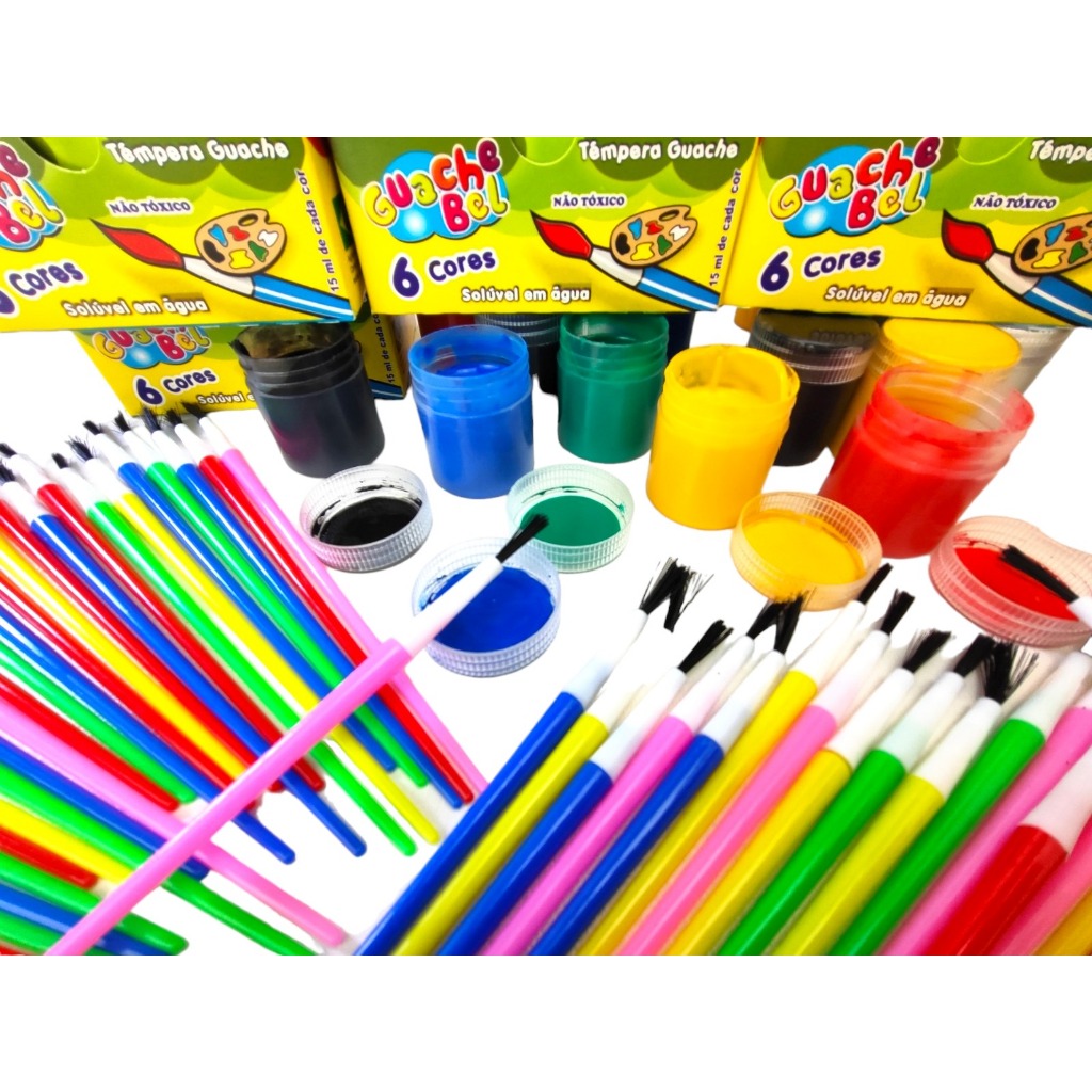 12 Cx Tinta Guache 6 Cores +12 Pincel Artístico Atacado Escolar Artesanato Lembrancinha P/ Festas