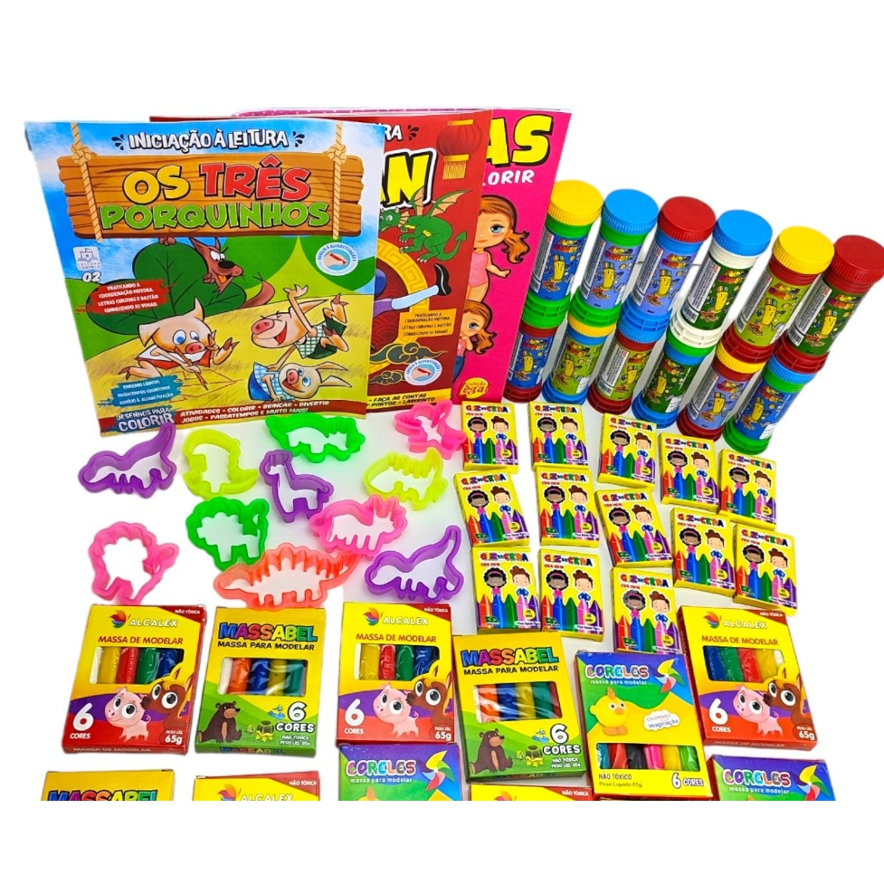 Kit 10 Cx Massinha Modelar + 10 Sabão + 10 Mini Giz + 10 Colorir + 30 Cortador Lembracinha Infantil