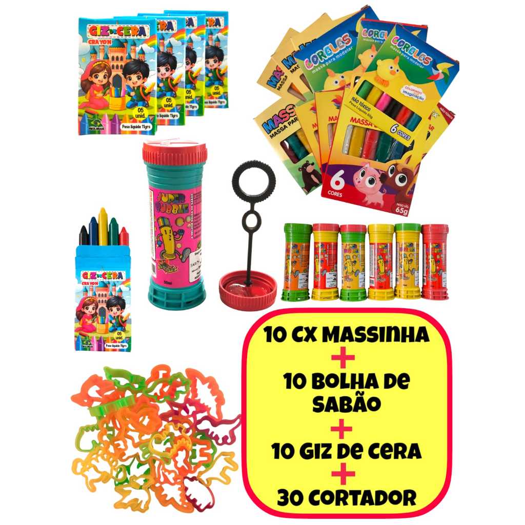 Kit 10 Cx Massinha de Modelar + 10 Bolha Sabão + 10 Giz De Cera + 30 Cortador Forminha Lembrancinha