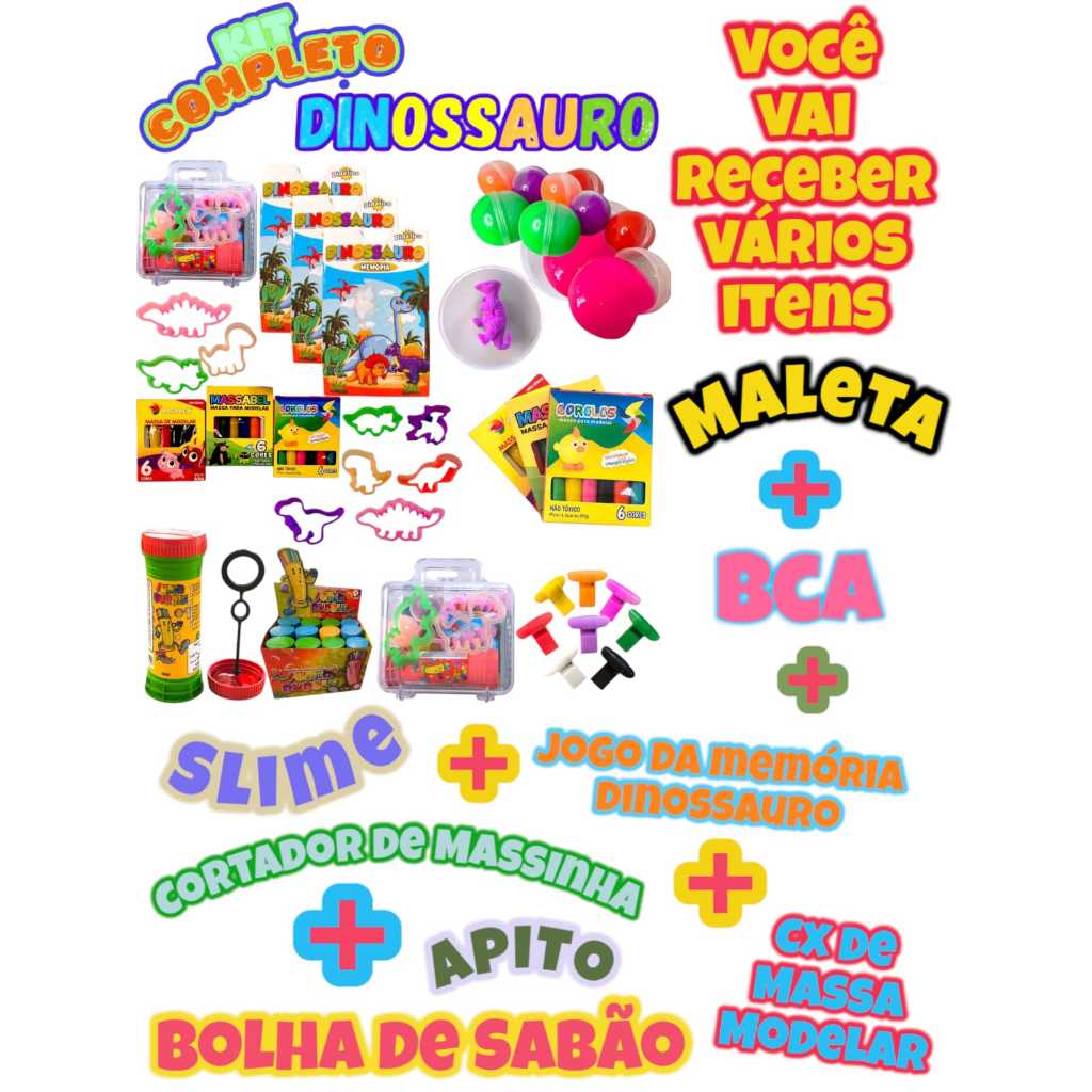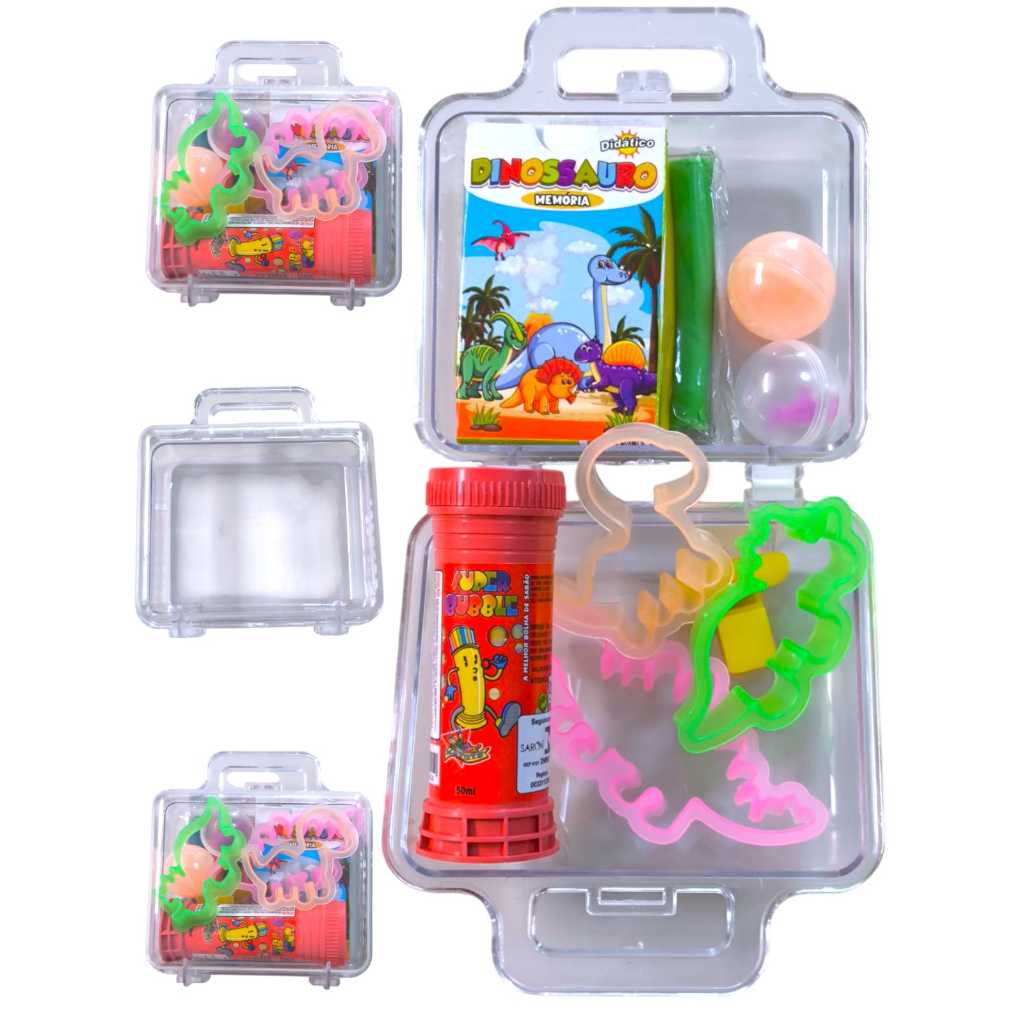 Kit 15 Maleta Dinossauro Massinha Molde Dino Sabão Slime Jogo Memoria Apito Lembrancinha Aniversário