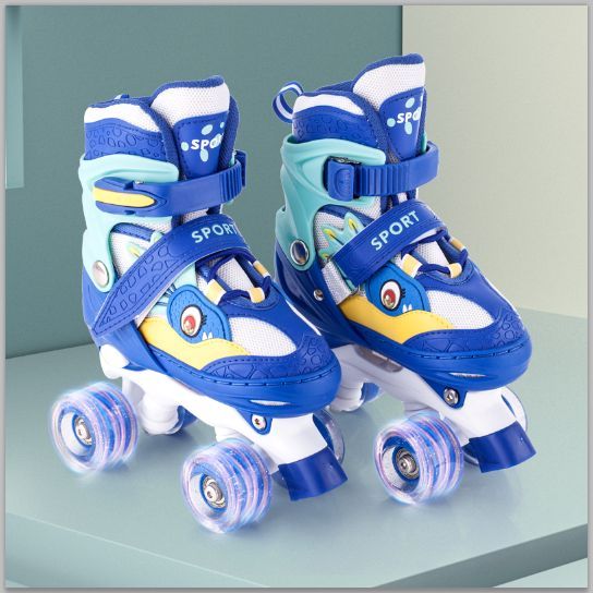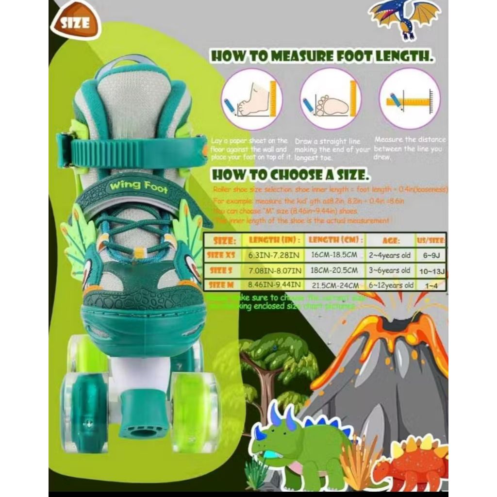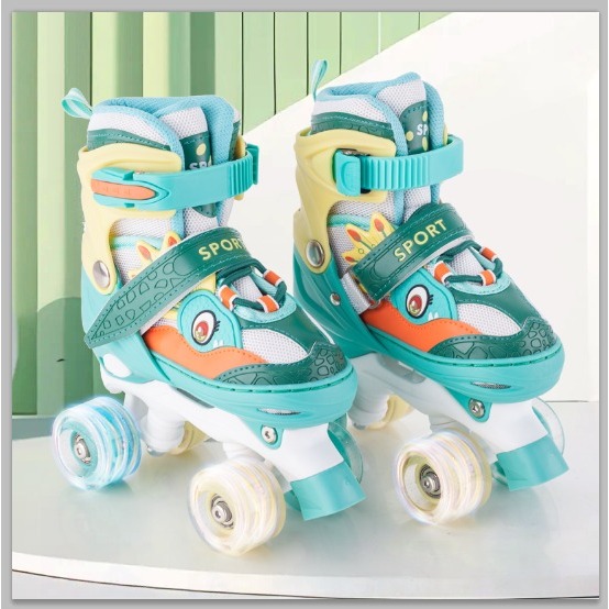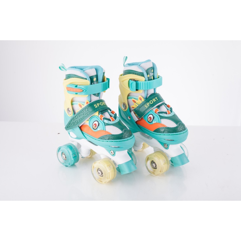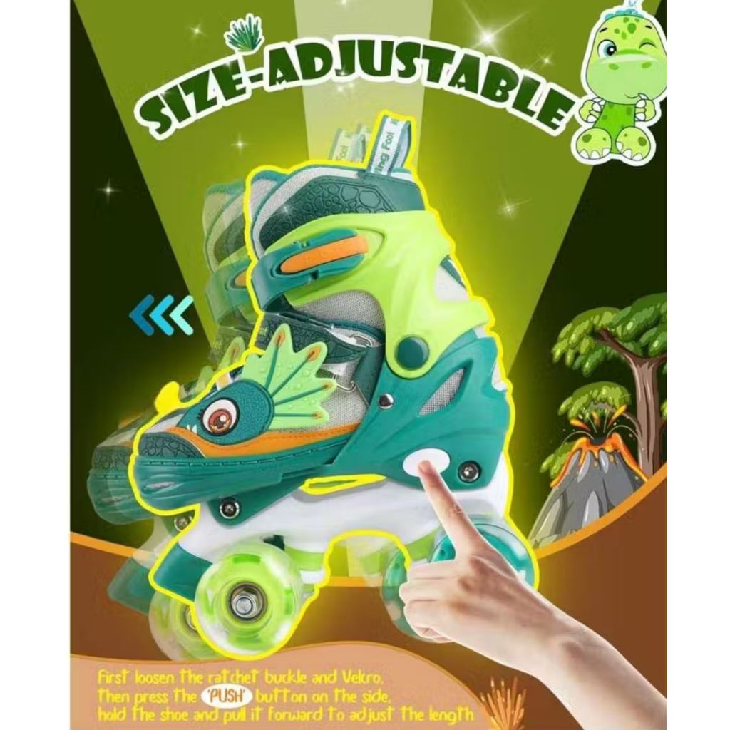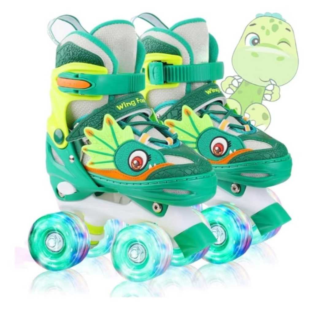 Patins Infantil Dinossauro Verde E Azul Quatro Rodas Com Luz De Led E Kit Proteção
