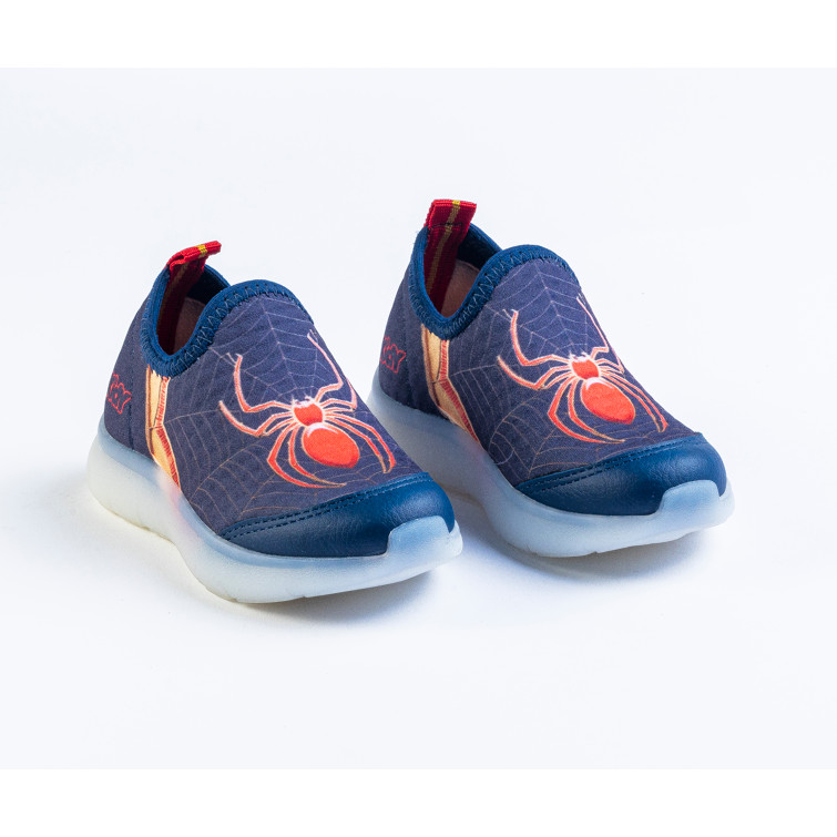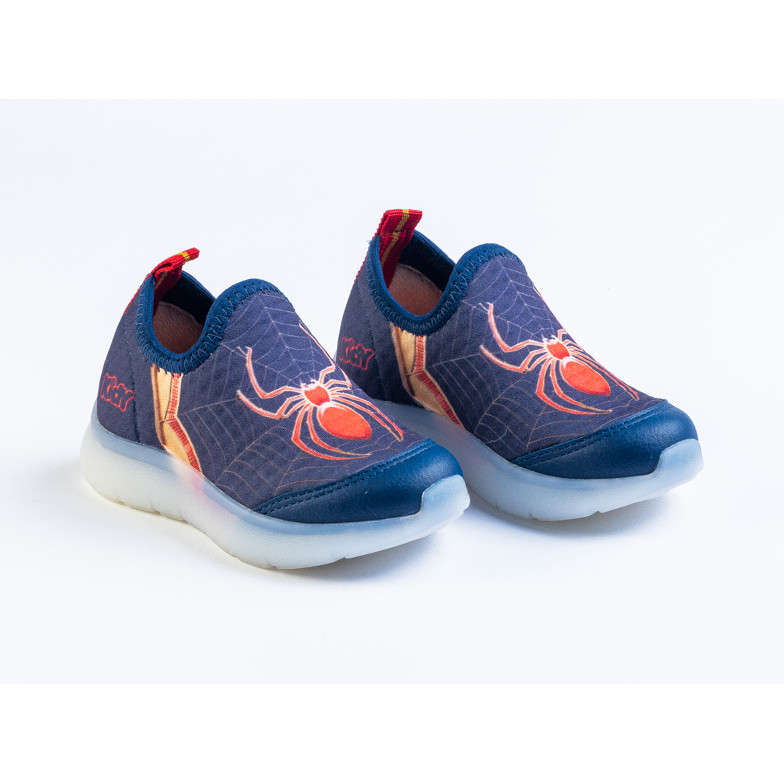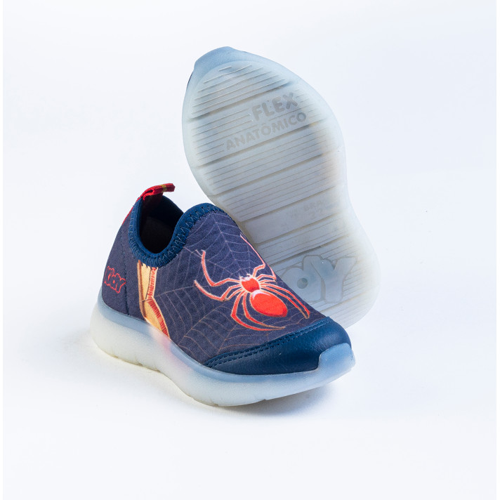 Tênis Infantil Menino Kidy Flex Light Marinho Aranha Com Luzes Led Calce Fácil Antiderrapante