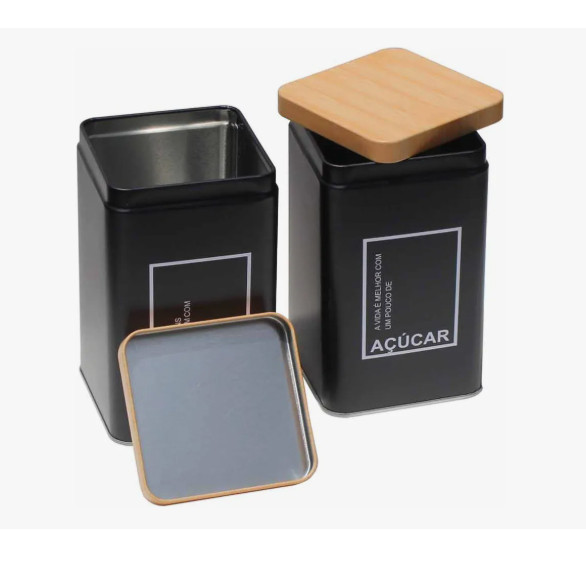 Kit Lata Café Açúcar Pote Organizadores Tampa Amadeirada Preto Cozinha Moderna Decorativa