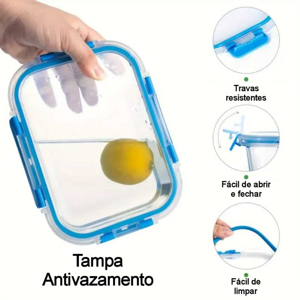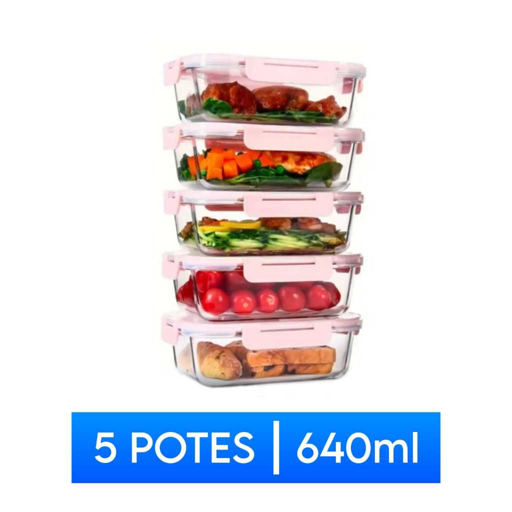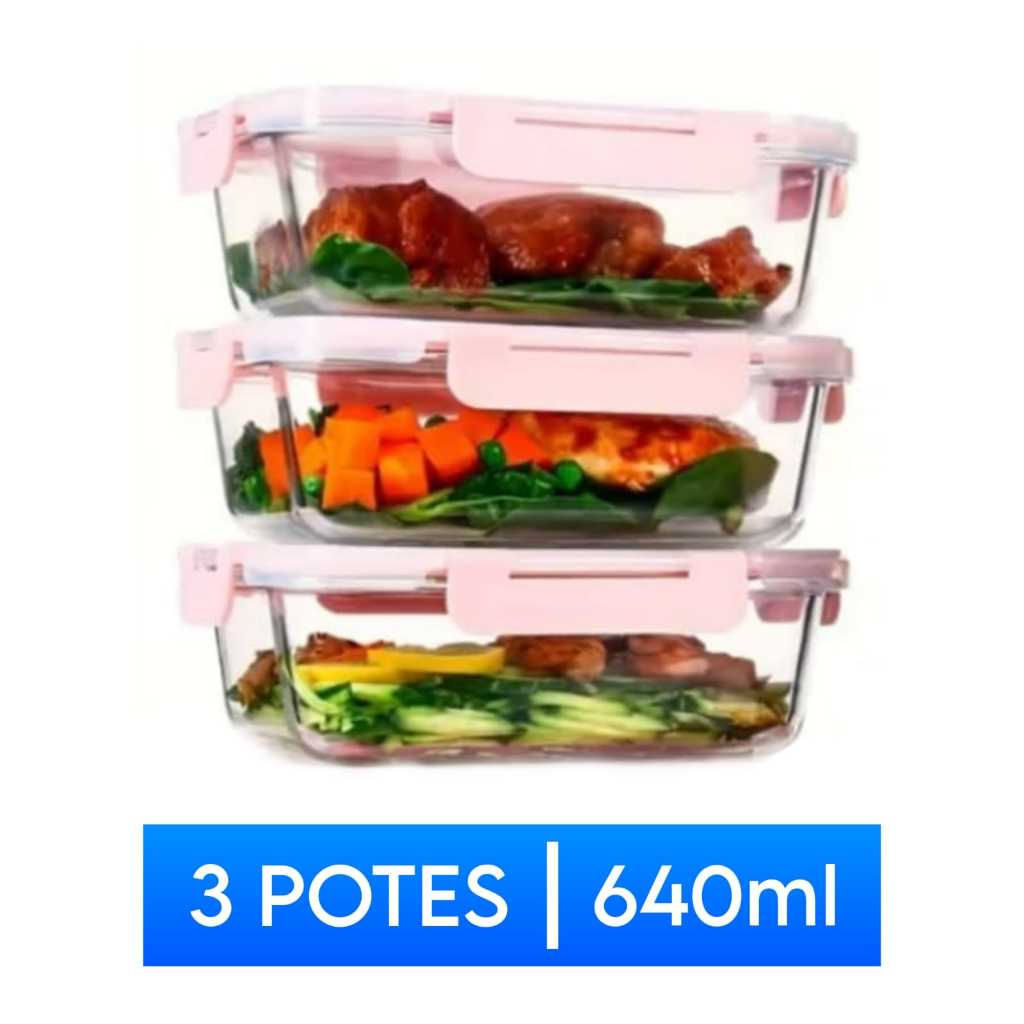 Kit Conjunto de Potes Premium 640ml Vidro Hermético - Marmita Fitness Dieta com 4 travas