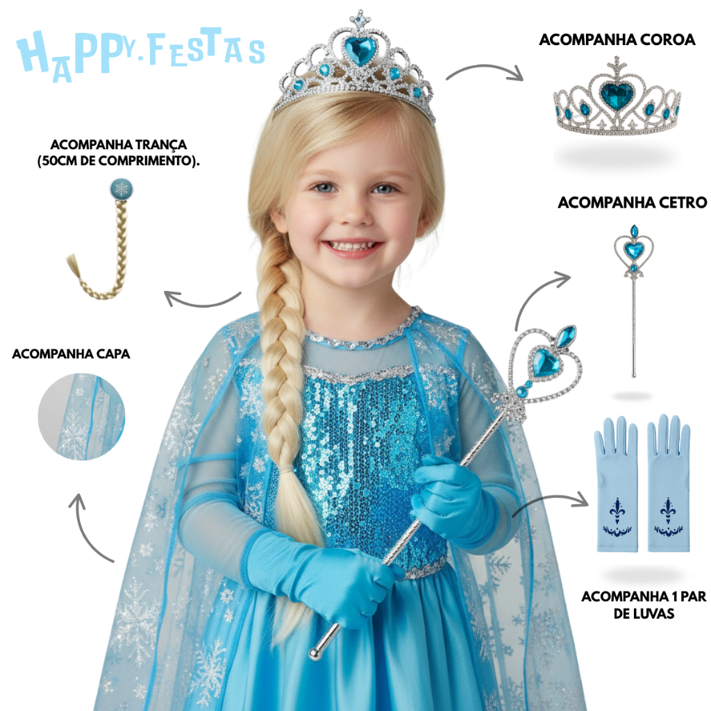 Fantasia Vestido Infantil Elsa Frozen Com Capa E Acessórios Festa Hallowen Crianças