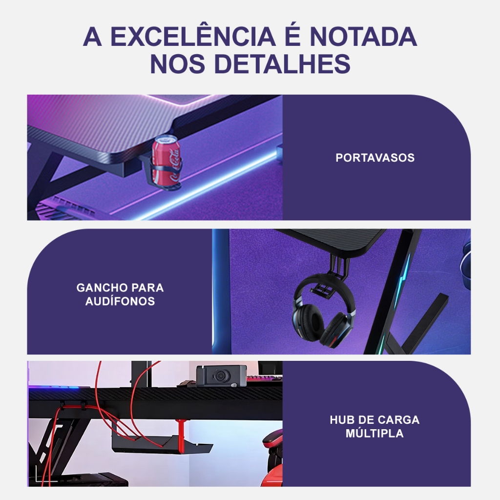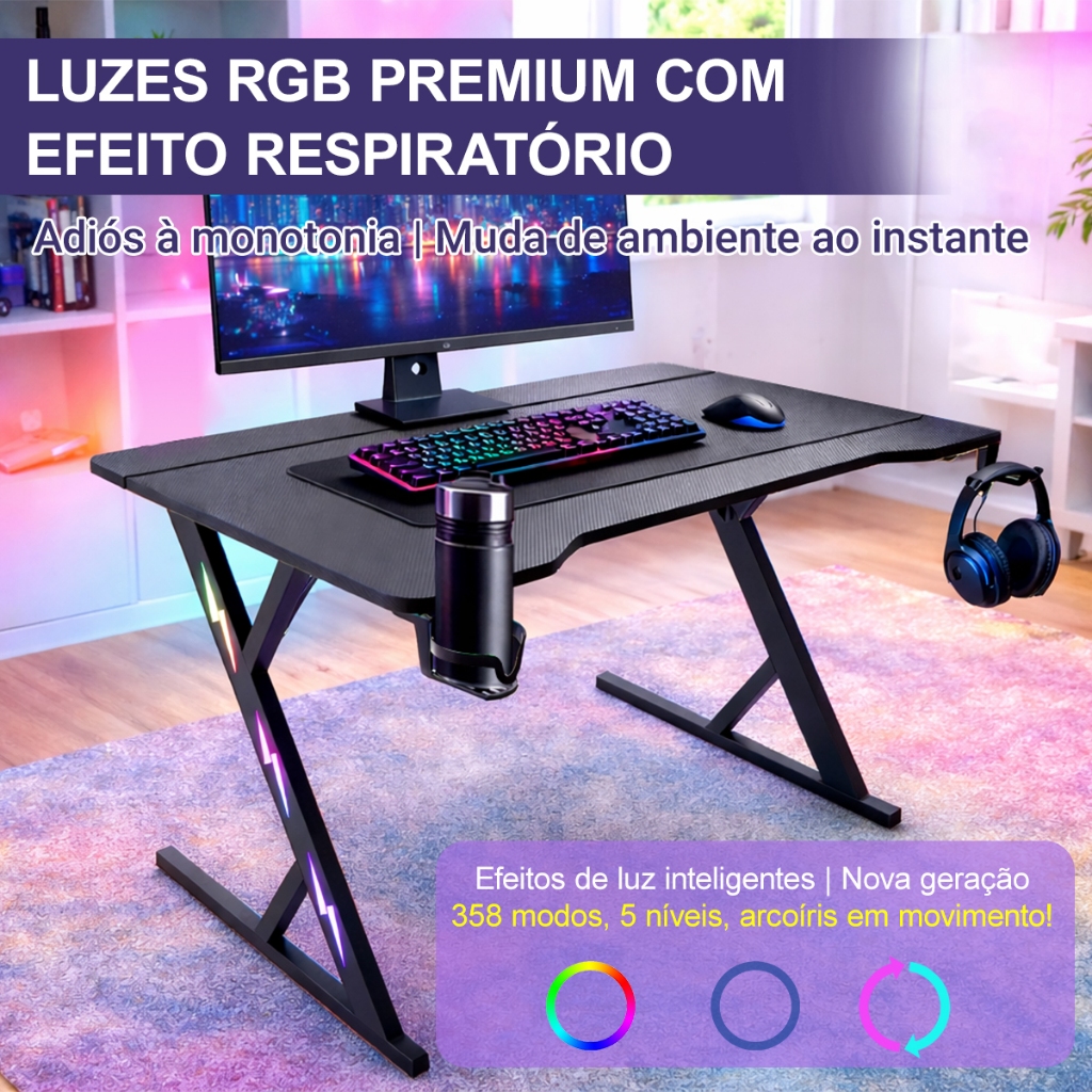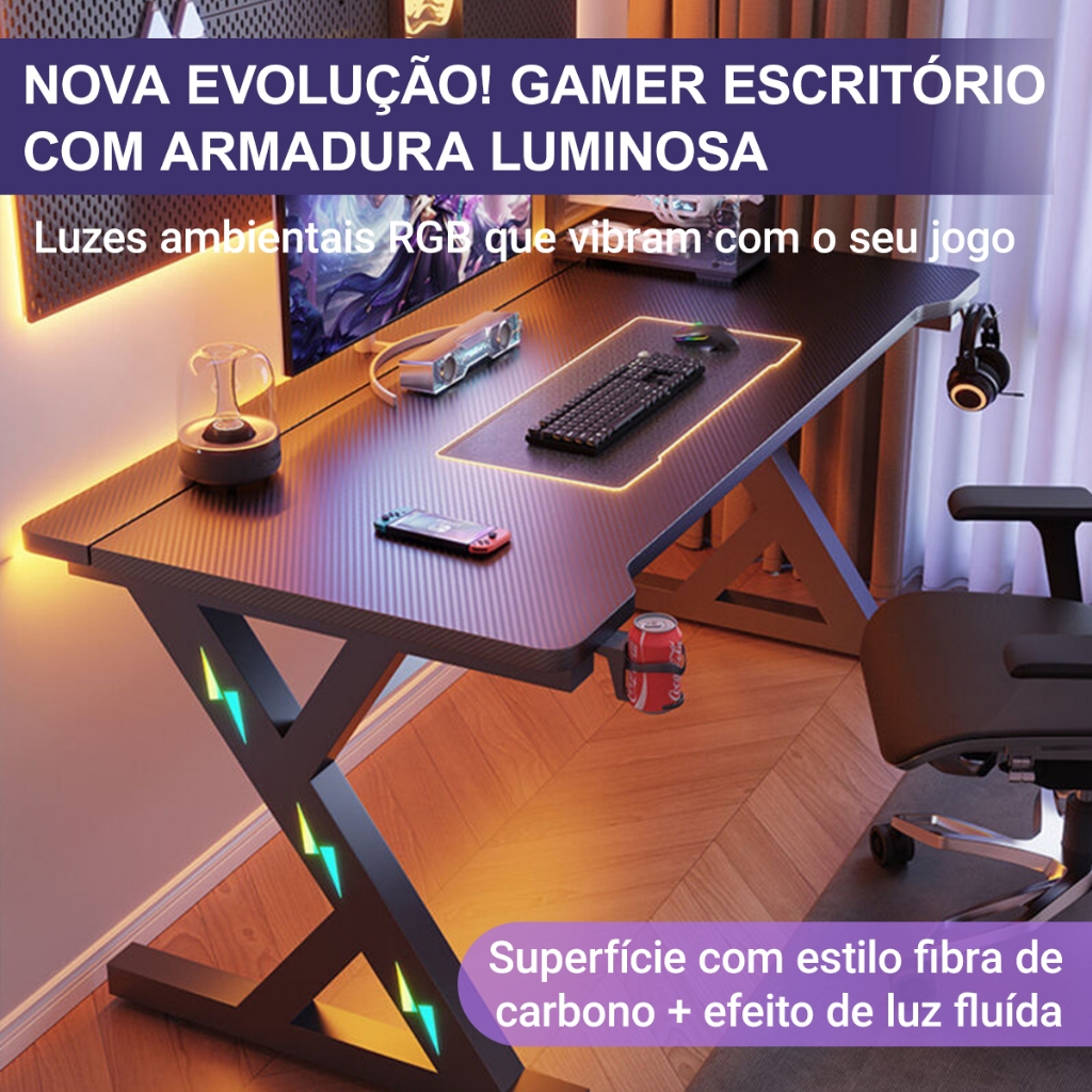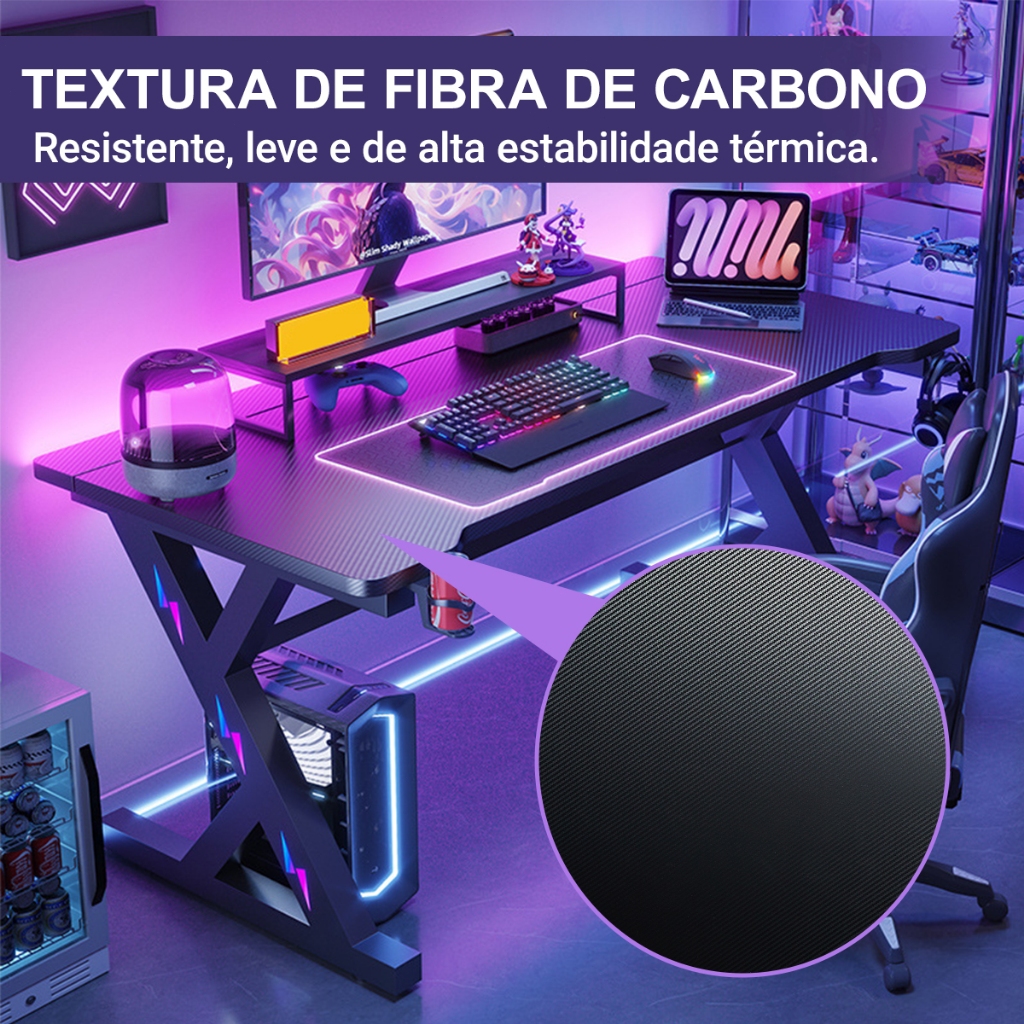Mesa Gamer para PC com Fibra de Carbono Suporte Monitor Porta Copo Gancho Headset Escrivaninha Gamer MECOLOUR