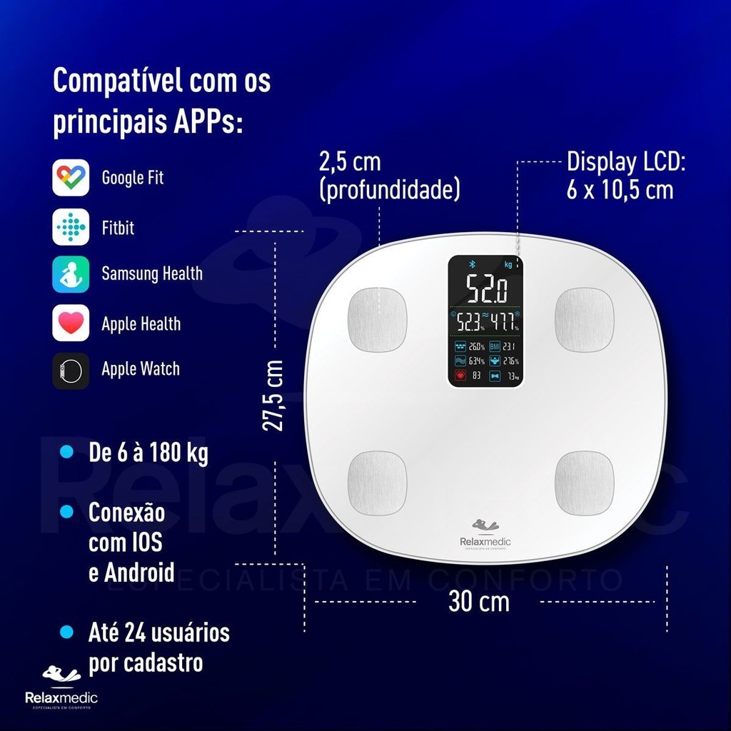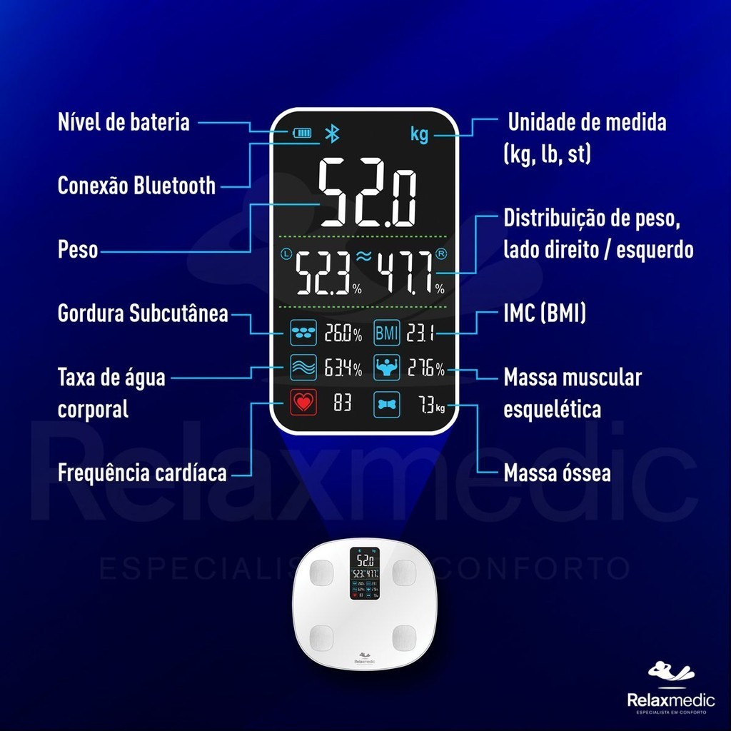 Balança de Bioimpedância Digital Corporal Cardio App Relaxmedic