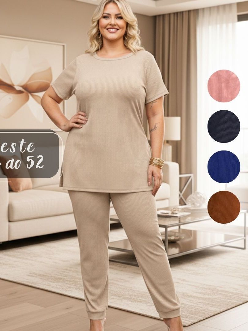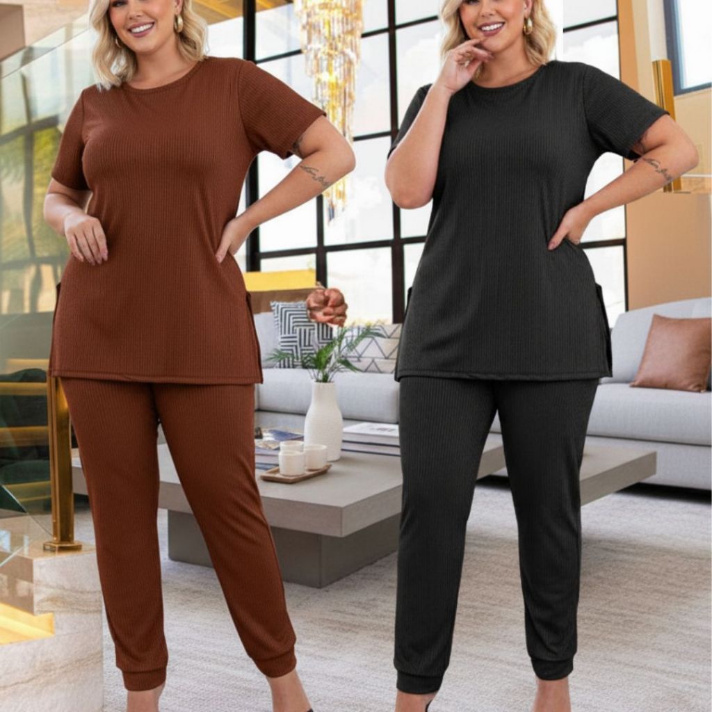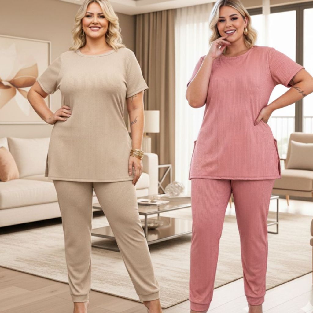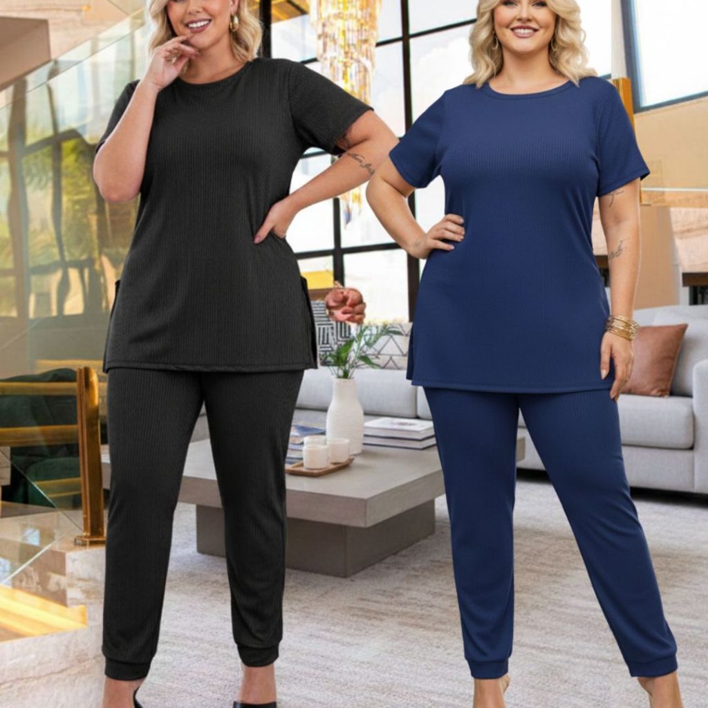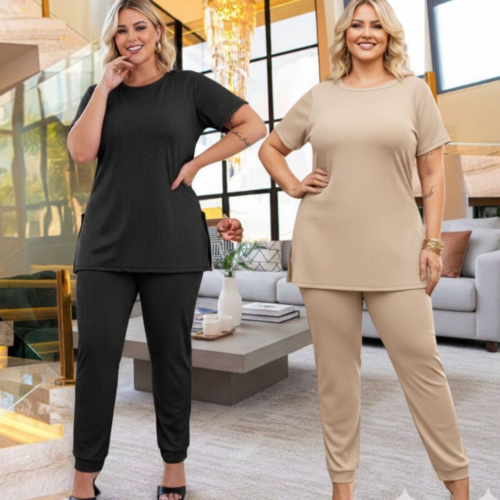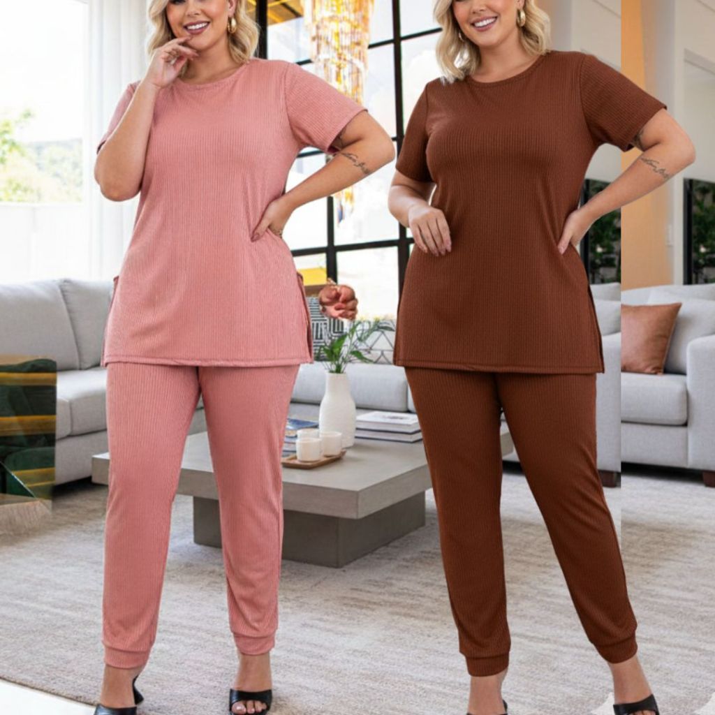 Kit 2 Conjunto Feminino Malha Luxo Plus Curve Blusa Manga Curta + Calça Justa Estilo Moda