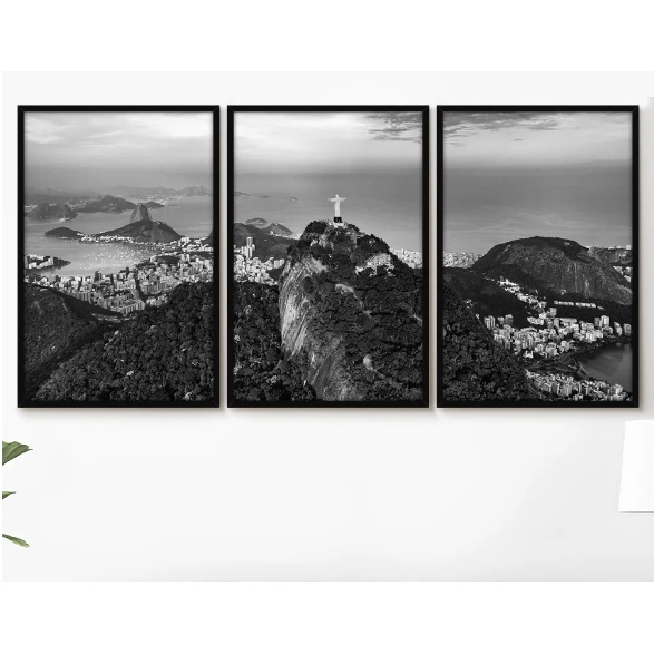 Quadro decorativo corcovado rio de Janeiro preto e branco 3 peças sala quarto cozinha e escritório