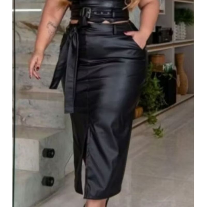 SAIA DE COURINO MIDI PLUS SIZE COM FENDA NA FRENTE, ACOMPANHA CINTO SEM FIVELA.