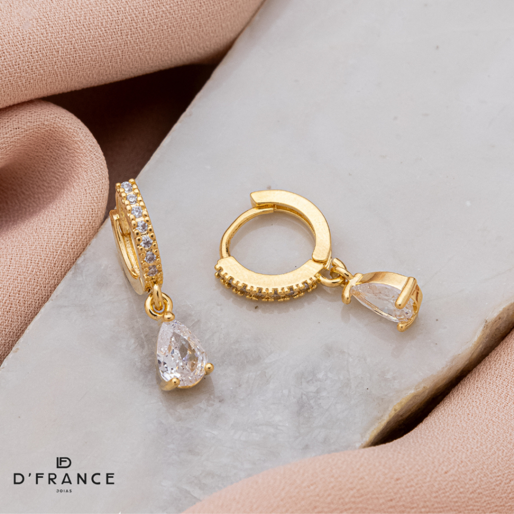 Argola Cravejada em Zircônias com Pingente Gota Cristal Folheado Ouro18K