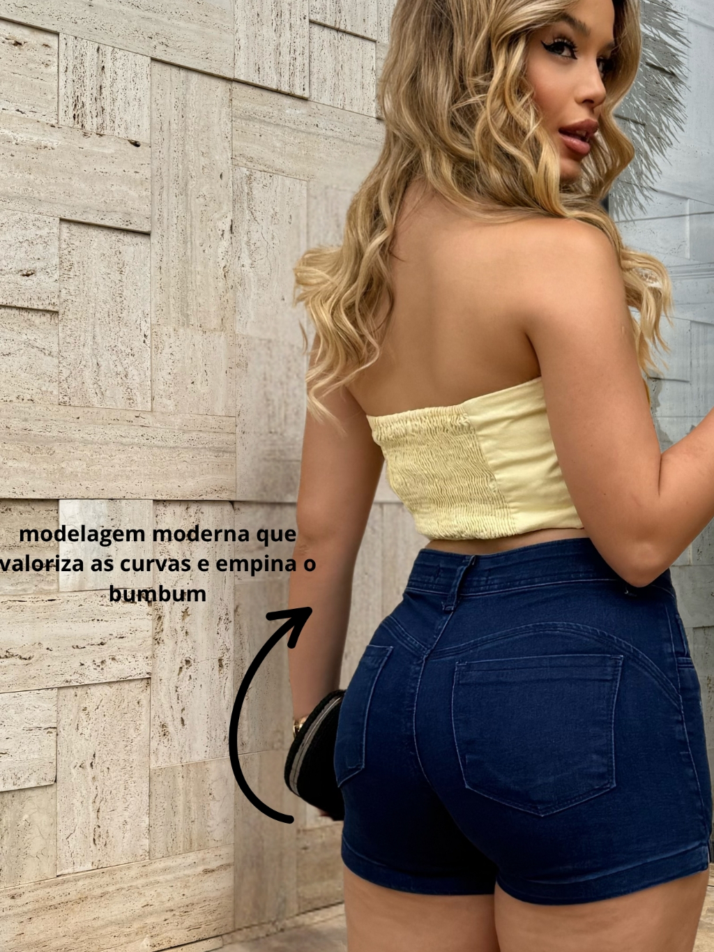 Short Jeans Feminino Cós Alta Com Lycra Elastano Levanta Bum Bum Abertura Lateral Super Confortável