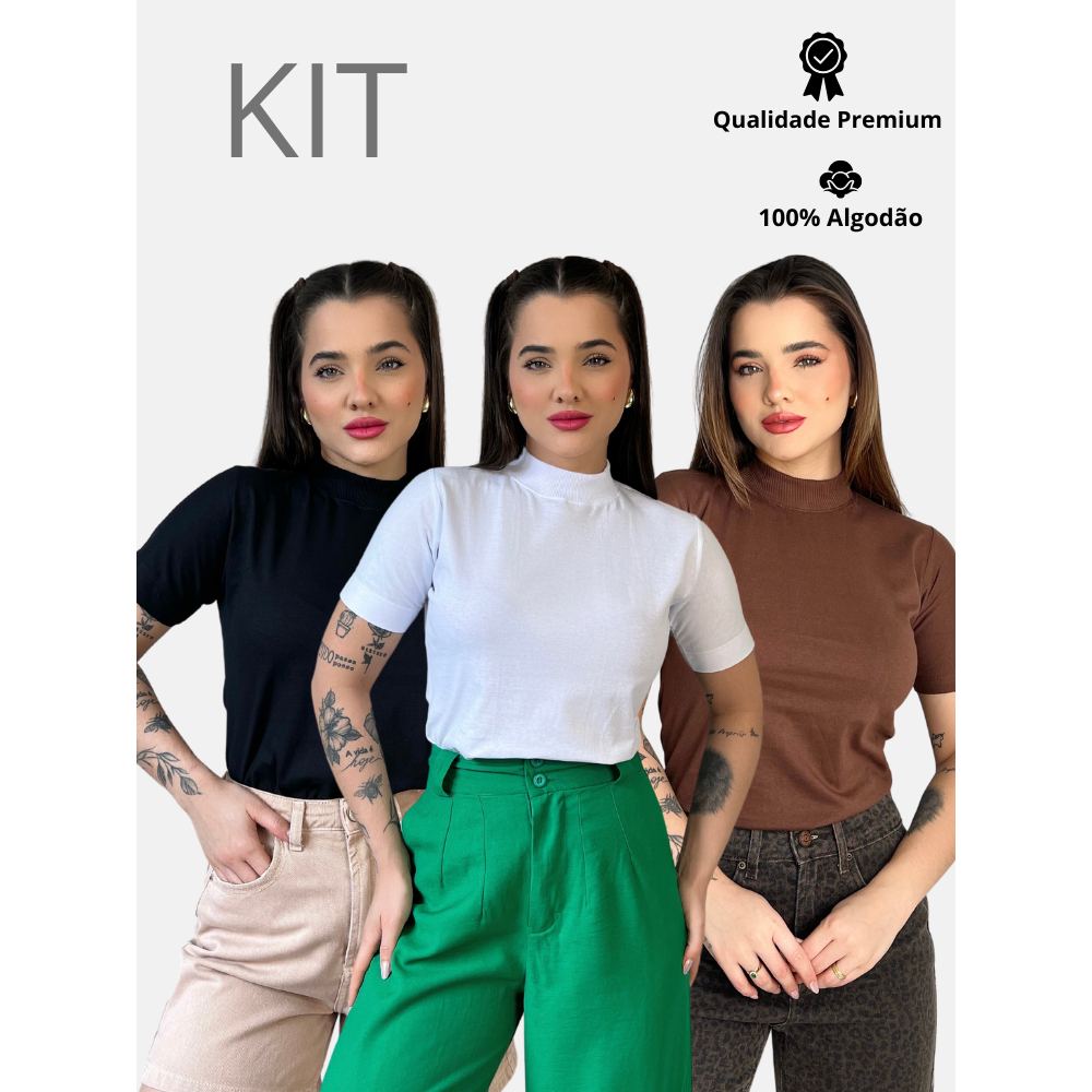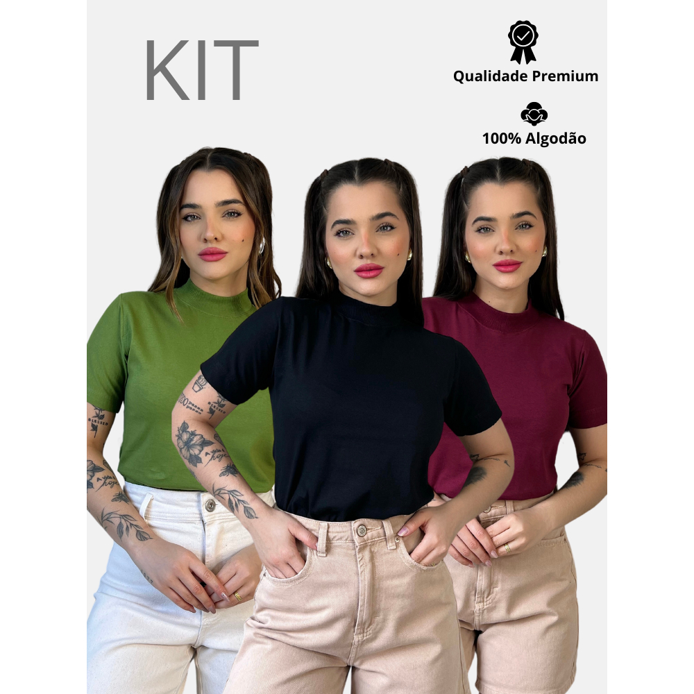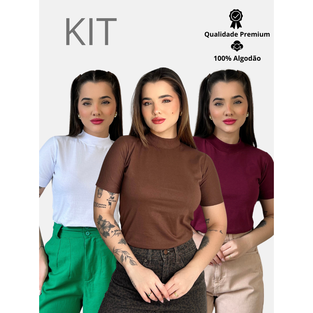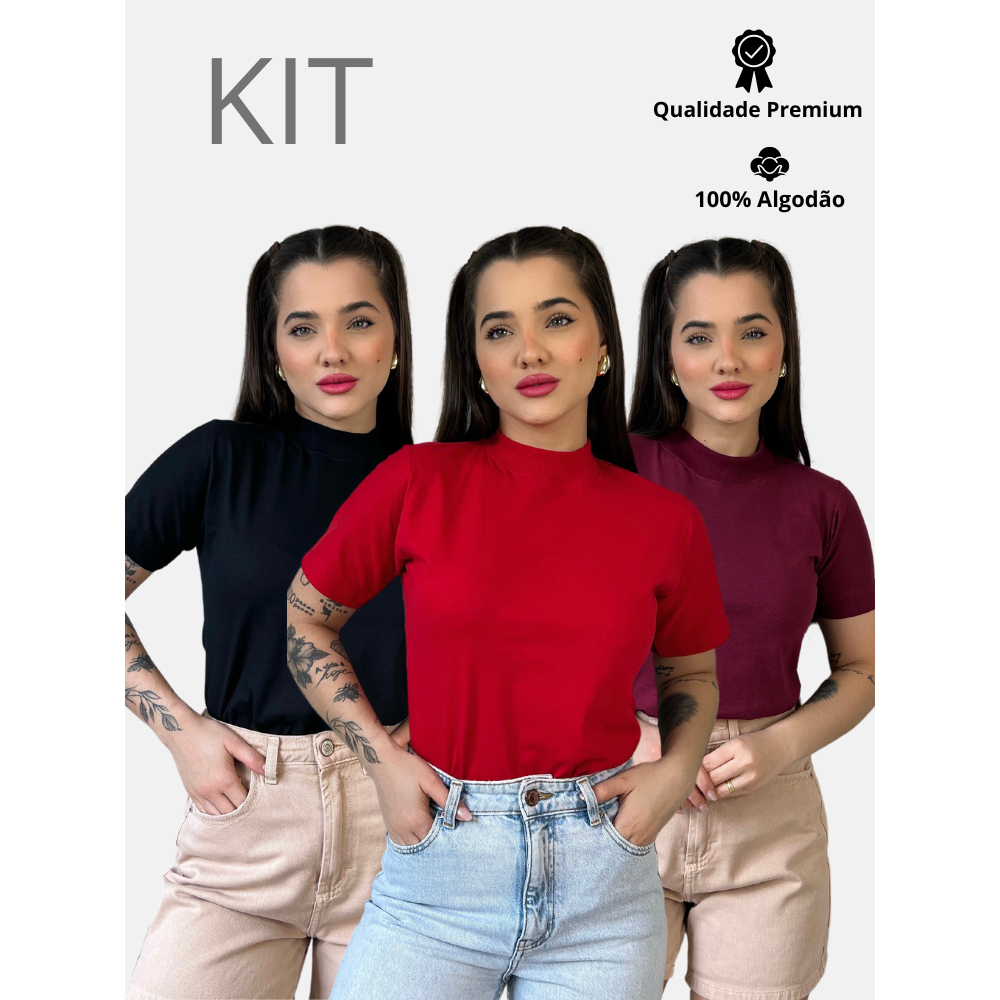 Kit 3 Blusas Gola Alta Feminina Elegante 100% Algodão Penteado Confortável