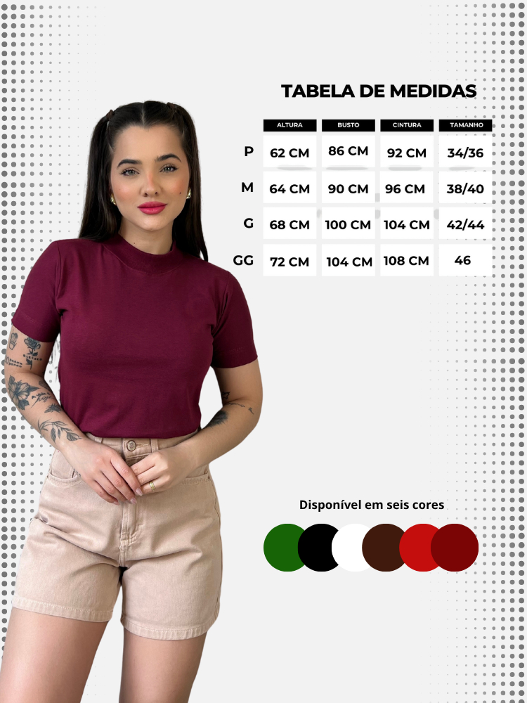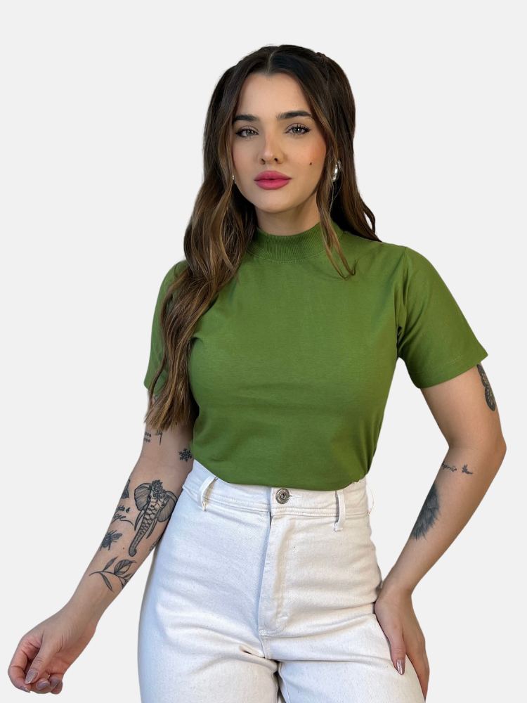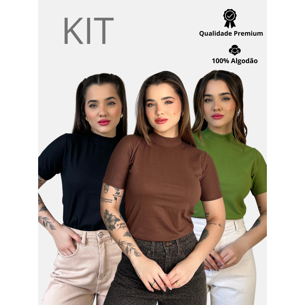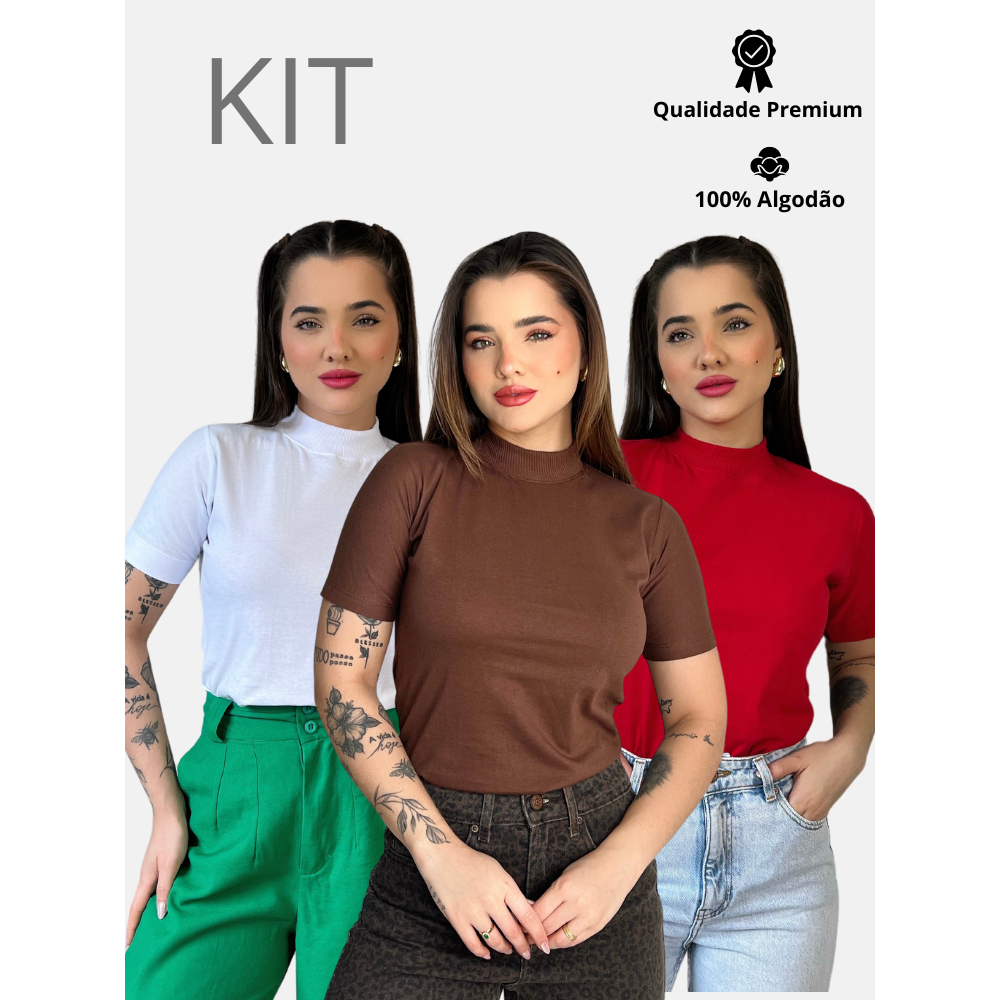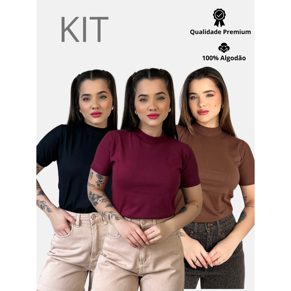 Kit 3 Blusas Gola Alta Feminina Elegante 100% Algodão Penteado Confortável