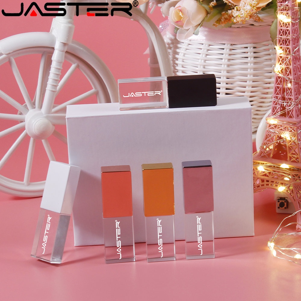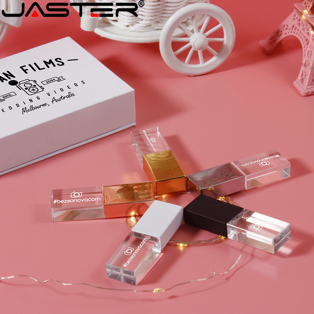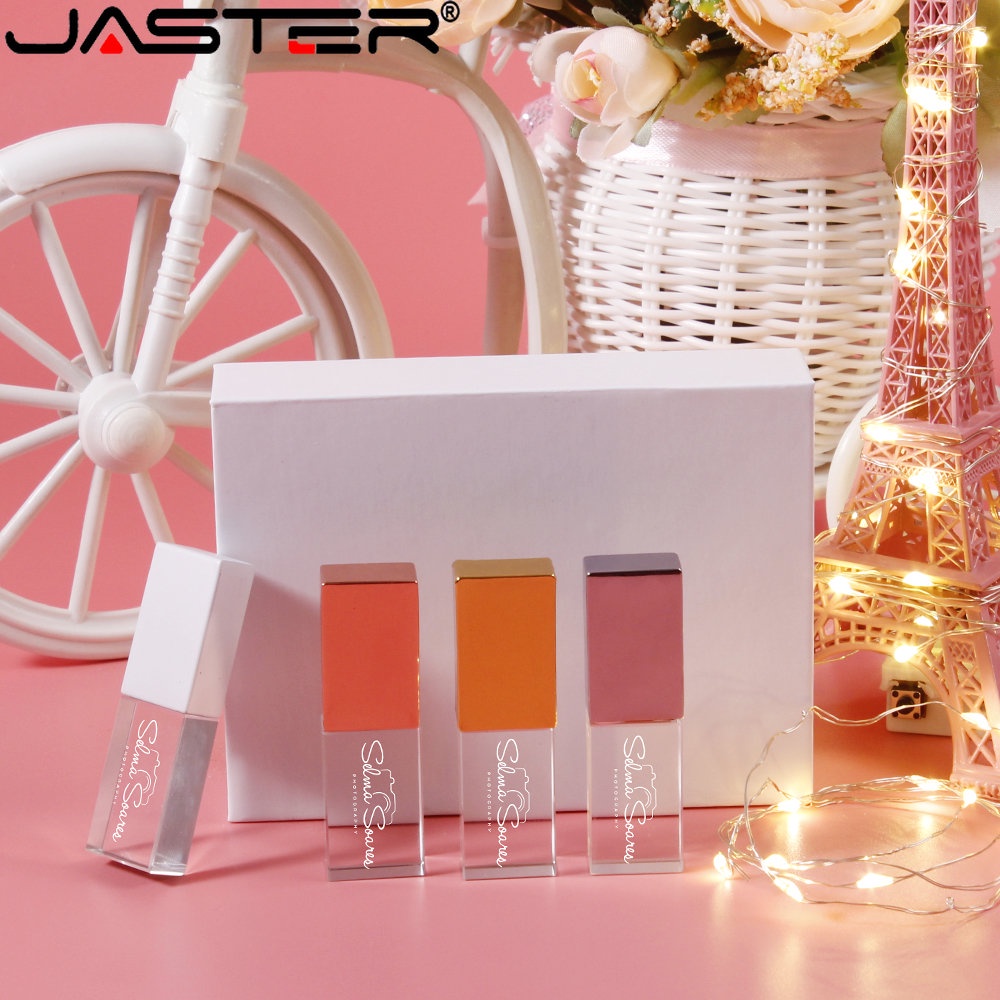 JASTER (1PCS Logotipo Gratuito) Crystal + Box USB 2.0 Flash Drive 128GB Memória Fotográfica De Construção Stick 64GB Pen