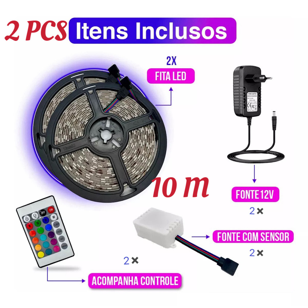 KIT 1/2/3/4 Fita Led Rgb 3528 Colorida 5m + Controle+Fonte 300 Led Decoração Casa Loja Gesso Teto Sanca Vitrine