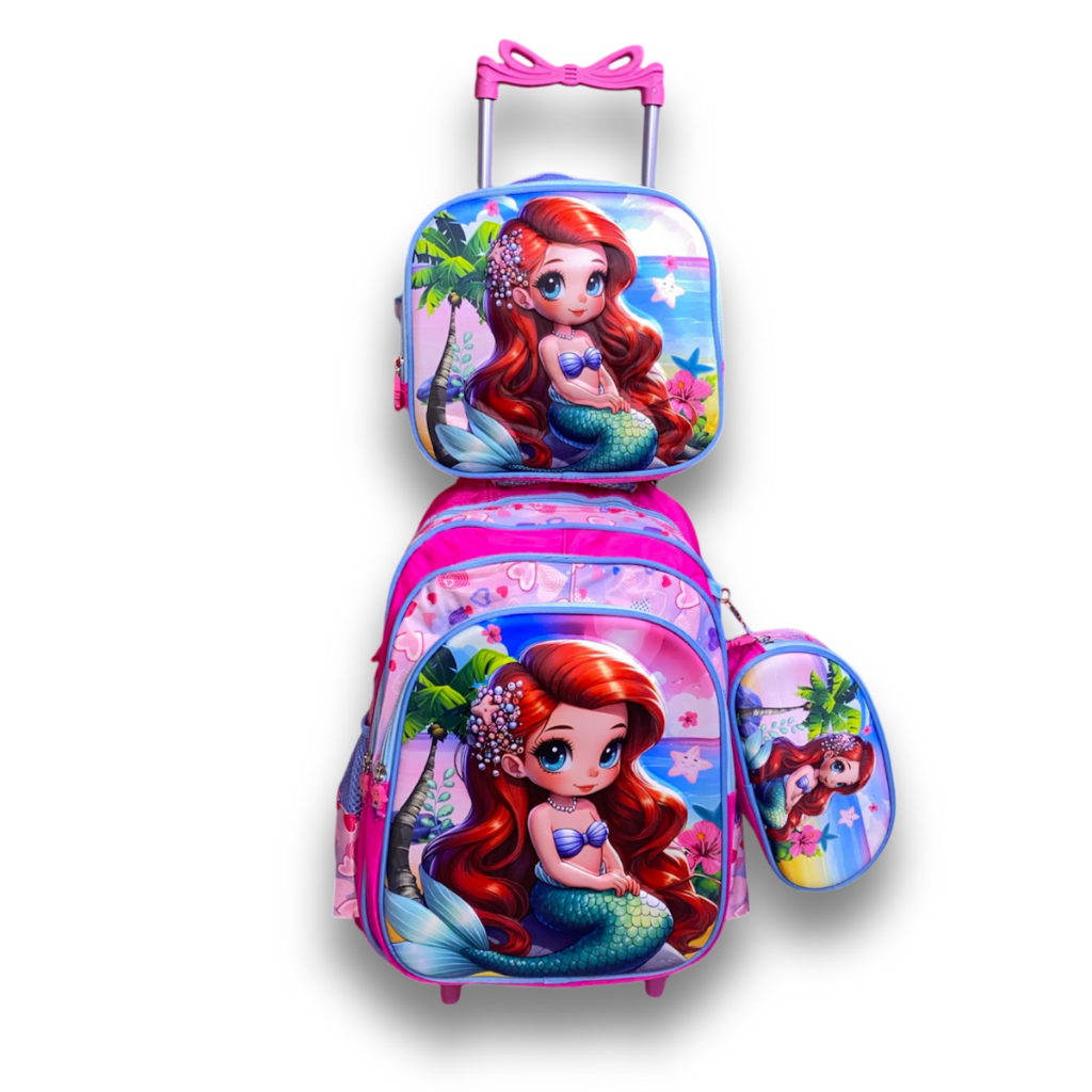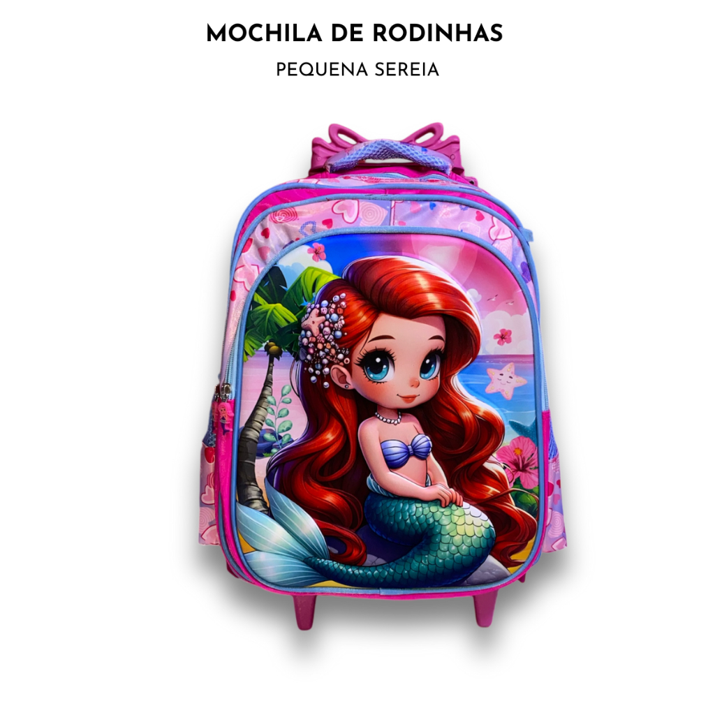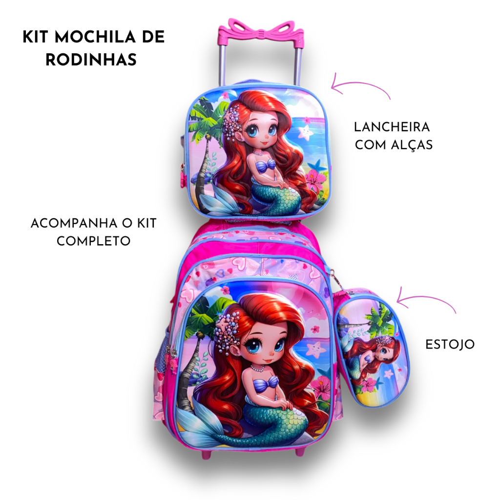 Mochila Feminina De Rodinha Infantil Com Kit Lancheira Térmica e Estojo Alto Relevo Design Sereia