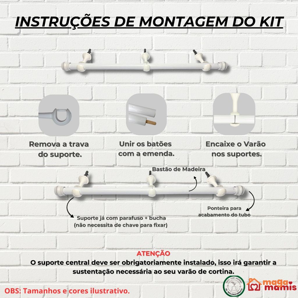 Kit Varão de Madeira Para Cortina Simples 1,50 Metros 19mm com Suporte e Ponteira
