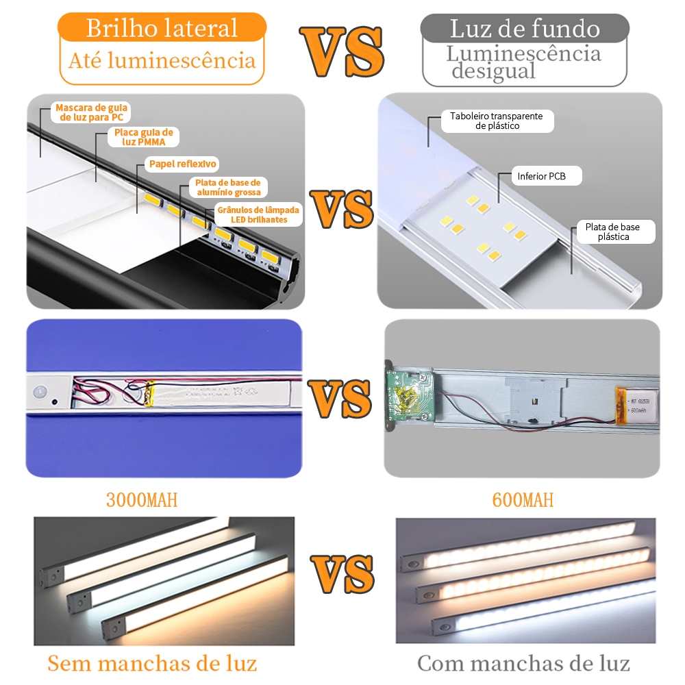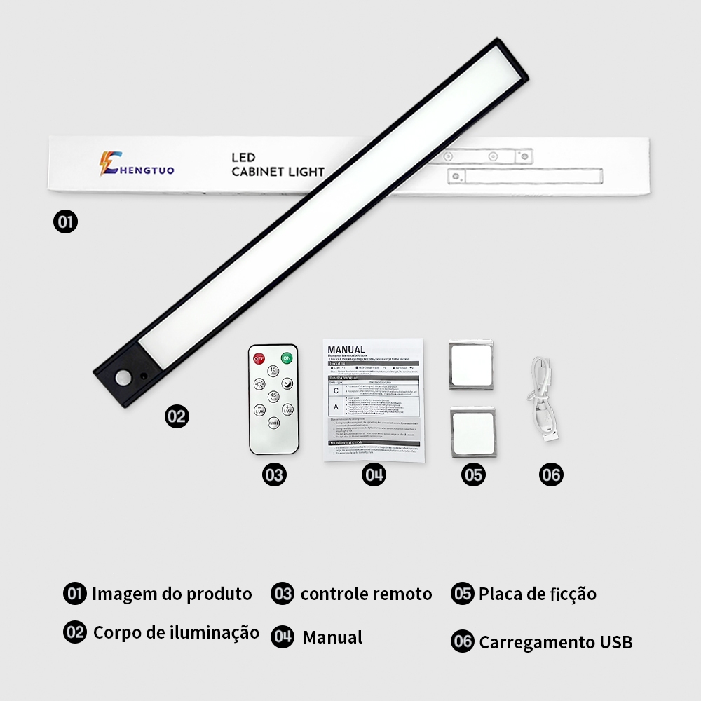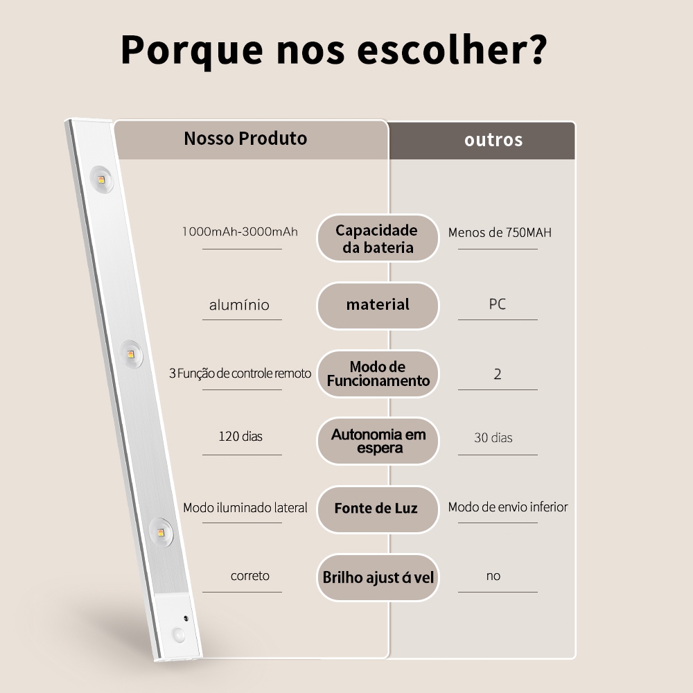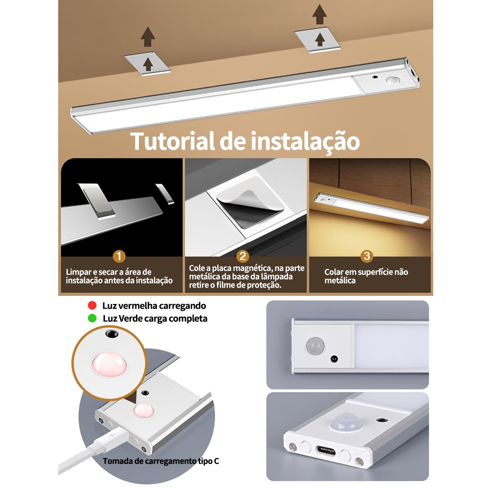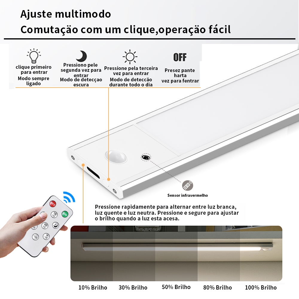 Luz Inteligente para Armário: 3 Cores, Sensor e Controle Remoto, Bateria Grande Recarregável + Modos Contínuo e Noturno