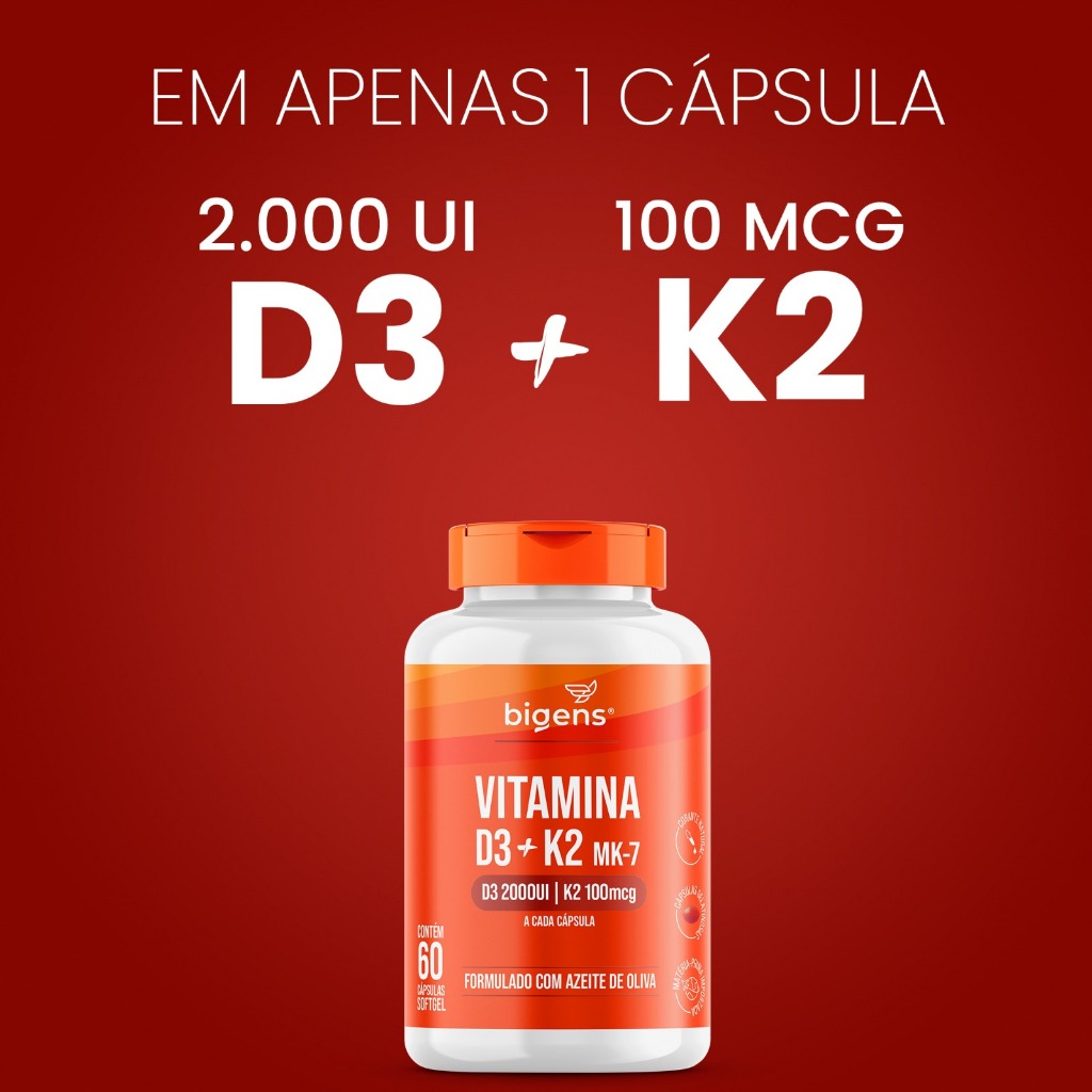 Vitamina D3 2000UI + K2 MK-7 100mcg, Formulado com azeite de oliva, Bigens (60 cápsulas)