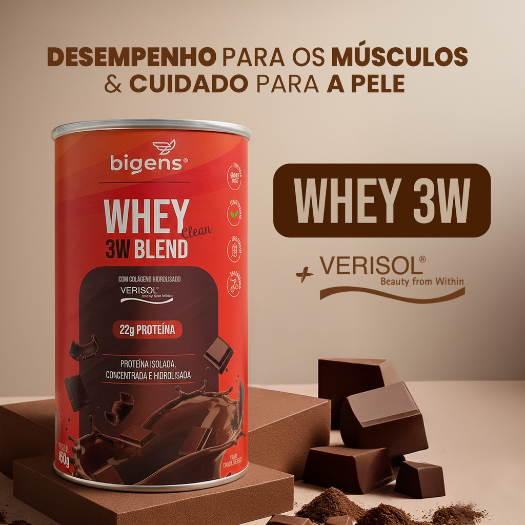 Bigens Whey 3W - Chocolate Suiço – 22g Proteína, BCAAs e Verisol® | 450g