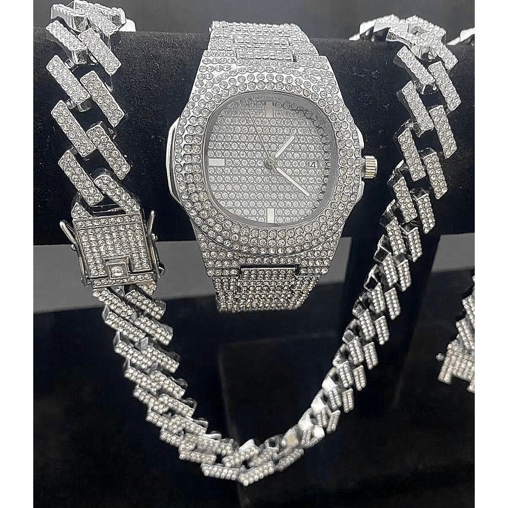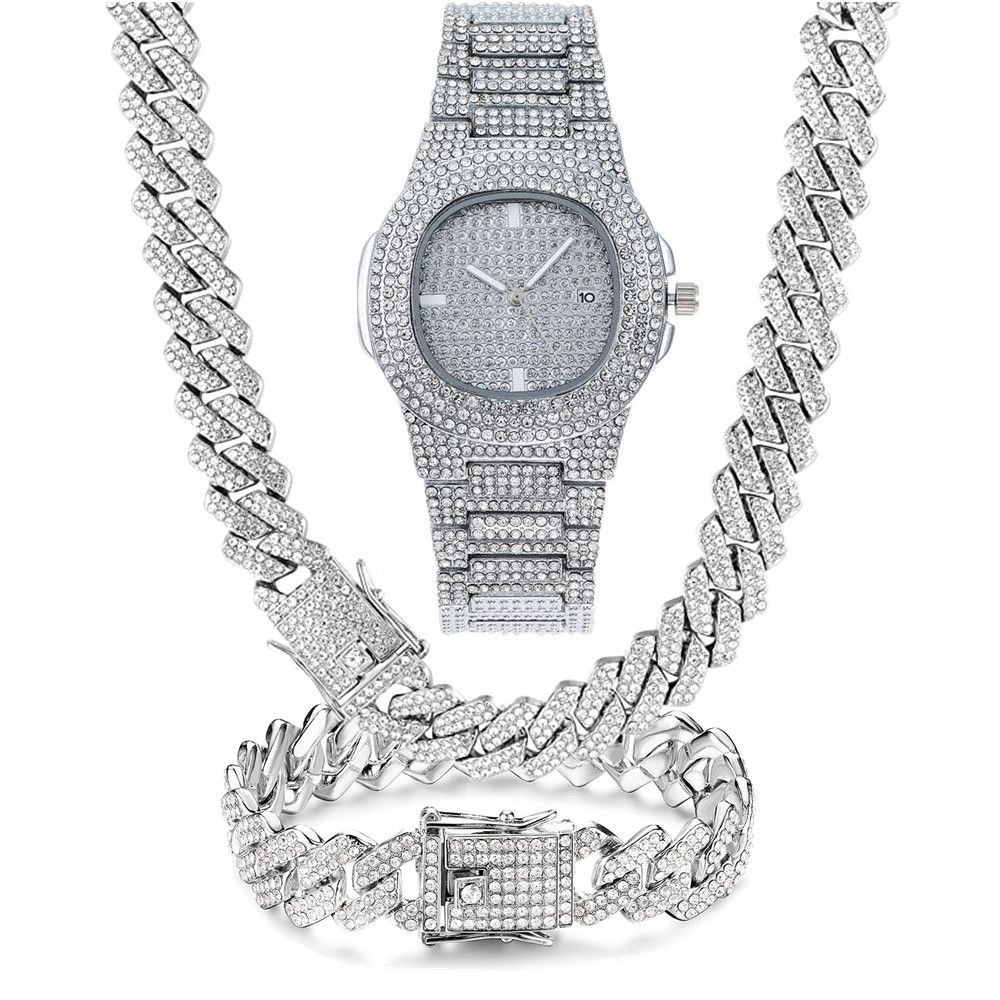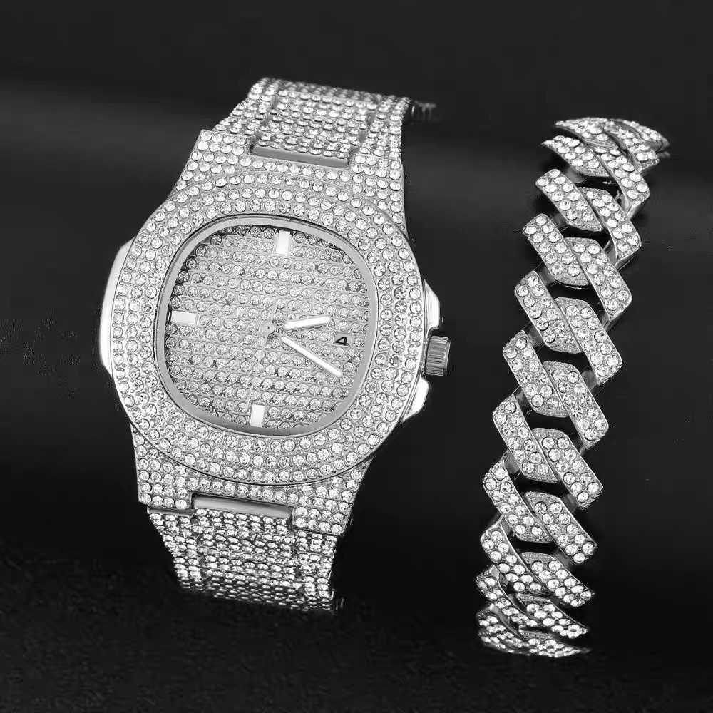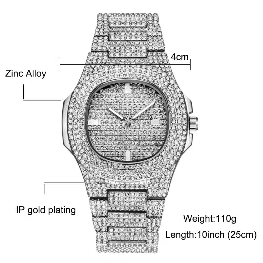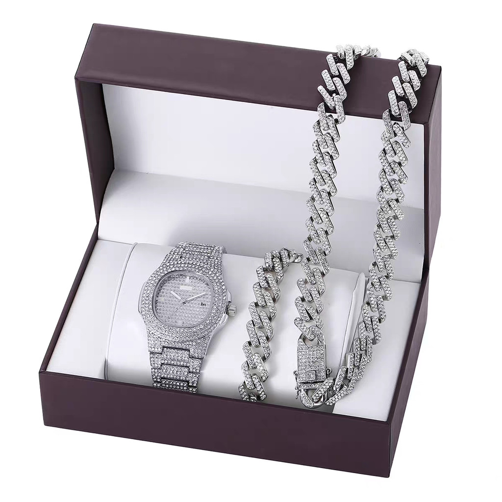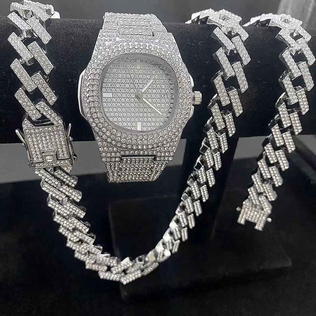 Relógio masculino moderno e estiloso com pulseira e colar de diamantes cravejados de diamantes