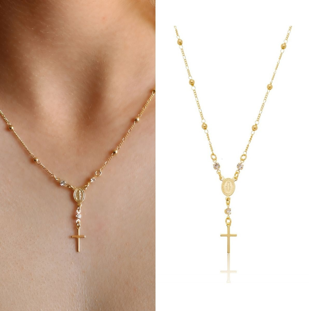 Colar Terço Feminino Dourado Banhado Ouro 18K com Cruz Antialergico Semijoia