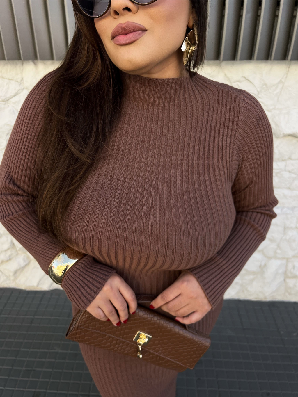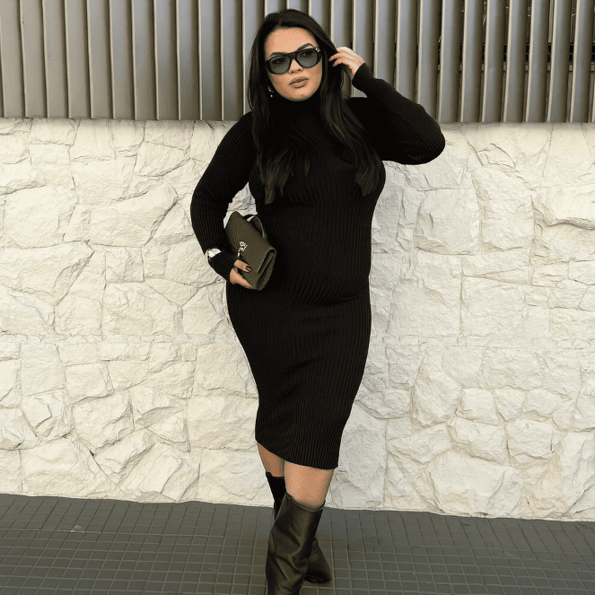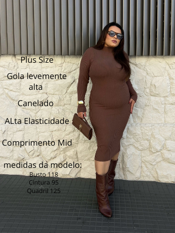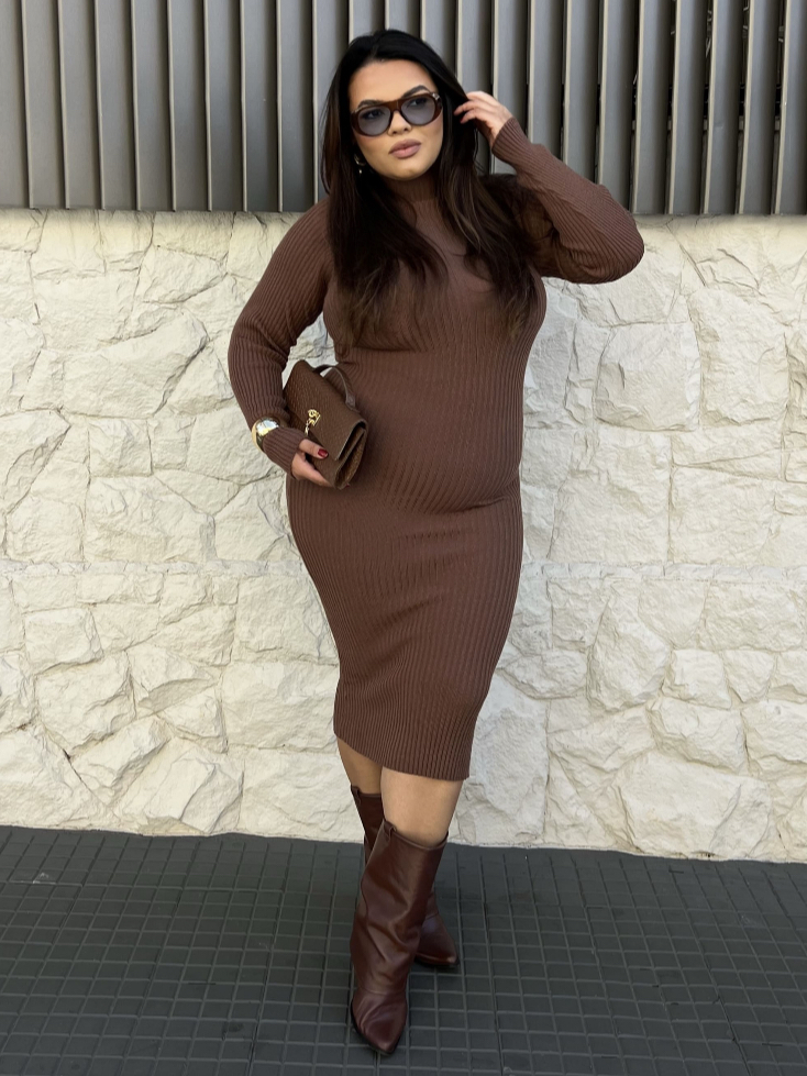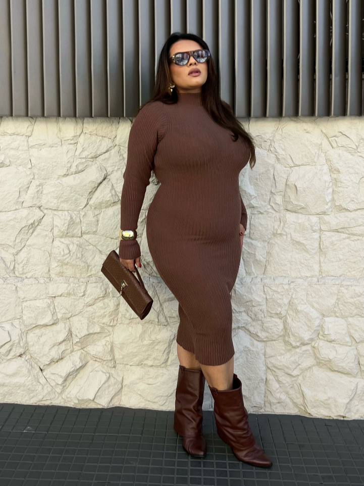 Vestido Canelado Tricot Modal Plus Size Midi Manga Longa Gola Alta Feminino