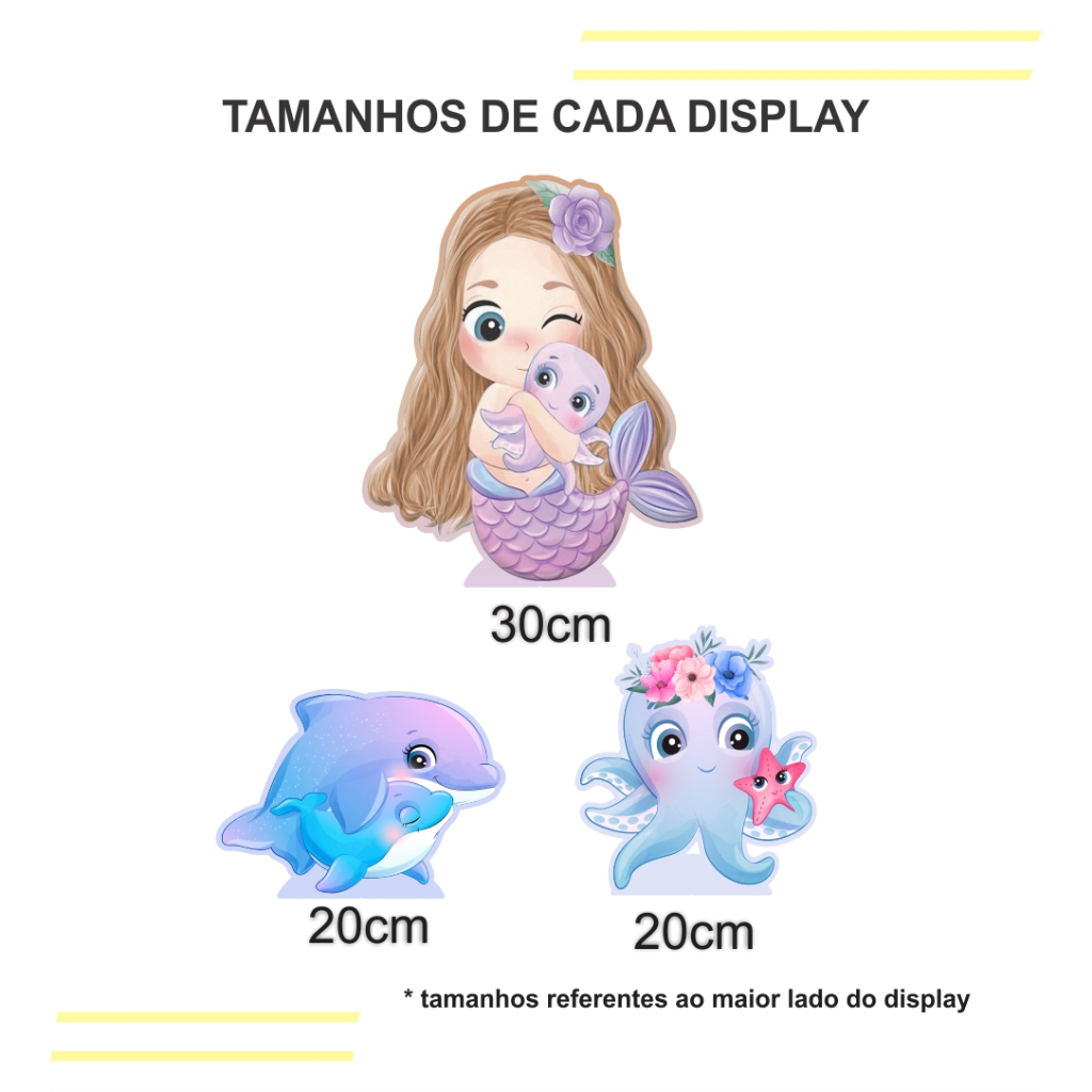 Kit de Display 1 de 30cm+ 2 de 20cm Totens Decoração de Festa Sereia Aquarela Cute MDF Corte Laser