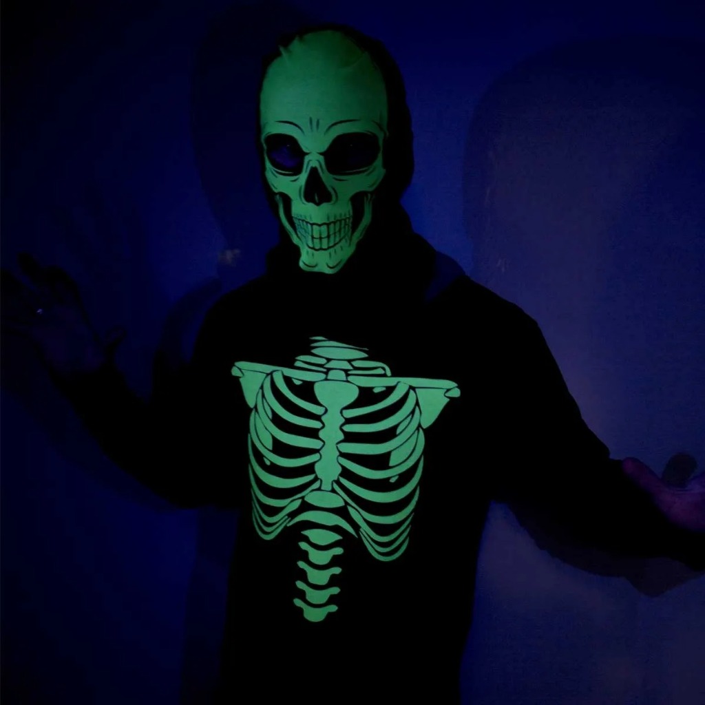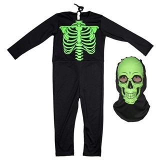 Fantasia Esqueleto Longa Infantil Fluorescente Com Gorro